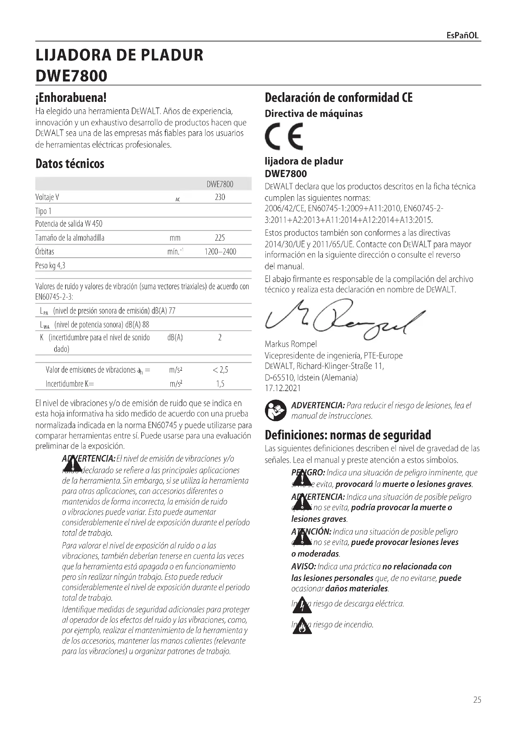 ADVERTENCIA: Indica una situación de posible peligro que, si no se evita, podría provocar la muerte o lesionesgraves. ATENCIÓN: Indica una situación de posible peligro que, si no se evita, puede provocar lesiones leves omoderadas. AVISO: Indica una práctica no relacionada con las lesiones personales que, de no evitarse, puede ocasionar dañosmateriales. Indica riesgo de descargaeléctrica. Indica riesgo deincendio. Declaración de conformidad CE Directiva de máquinas lijadora de pladur DWE7800 DeWALT declara que los productos descritos en la ficha técnica cumplen las siguientes normas: 2006/42/CE, EN60745‑1:2009+A11:2010, EN60745‑2‑3:2011+A2:2013+A11:2014+A12:2014+A13:2015.Estos productos también son conformes a las directivas 2014/30/UE y 2011/65/UE. Contacte con DeWALT para mayor información en la siguiente dirección o consulte el reverso delmanual.El abajo firmante es responsable de la compilación del archivo técnico y realiza esta declaración en nombre deDeWALT.Markus Rompel Vicepresidente de ingeniería, PTE‑Europe DeWALT, Richard‑Klinger‑Straße 11, D‑65510, Idstein (Alemania) 17.12.2021El nivel de vibraciones y/o de emisión de ruido que se indica en esta hoja informativa ha sido medido de acuerdo con una prueba normalizada indicada en la norma 60745 y puede utilizarse para comparar herramientas entre sí. Puede usarse para una evaluación preliminar de laexposición. ADVERTENCIA: El nivel de emisión de vibraciones y/o ruido declarado se refiere a las principales aplicaciones de la herramienta. Sin embargo, si se utiliza la herramienta para otras aplicaciones, con accesorios diferentes o mantenidos de forma incorrecta, la emisión de ruido o vibraciones puede variar. Esto puede aumentar considerablemente el nivel de exposición durante el período total detrabajo.Para valorar el nivel de exposición al ruido o a las vibraciones, también deberían tenerse en cuenta las veces que la herramienta está apagada o en funcionamiento pero sin realizar ningún trabajo. Esto puede reducir considerablemente el nivel de exposición durante el periodo total detrabajo.Identifique medidas de seguridad adicionales para proteger al operador de los efectos del ruido y las vibraciones, como, por ejemplo, realizar el mantenimiento de la herramienta y de los accesorios, mantener las manos calientes (relevante para las vibraciones) u organizar patrones detrabajo.DWE7800Voltaje V