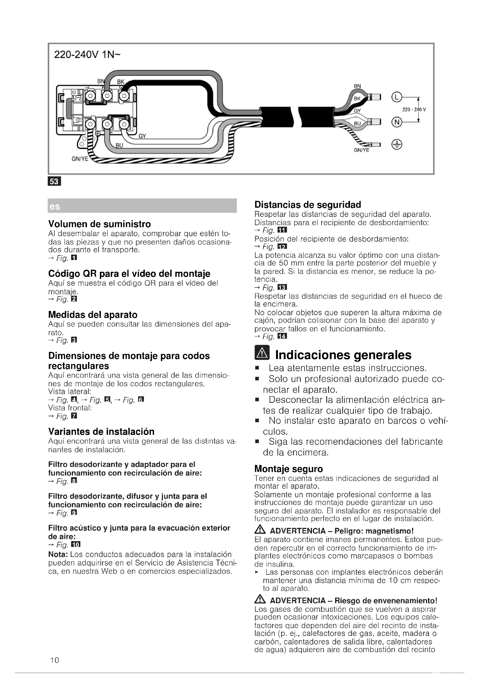 Indicaciones generales ¡ Lea atentamente estas instrucciones. ¡ Solo un profesional autorizado puede co- nectar el aparato. ¡ Desconectar la alimentación eléctrica an- tes de realizar cualquier tipo de trabajo. ¡ No instalar este aparato en barcos o vehí- culos. ¡ Siga las recomendaciones del fabricante de la encimera. Montaje seguro Tener en cuenta estas indicaciones de seguridad al montar el aparato. Solamente un montaje profesional conforme a las instrucciones de montaje puede garantizar un uso seguro del aparato. El instalador es responsable del funcionamiento perfecto en el lugar de instalación. ADVERTENCIA‒Peligro: magnetismo! El aparato contiene imanes permanentes. Estos pue- den repercutir en el correcto funcionamiento de im- plantes electrónicos como marcapasos o bombas de insulina. ▶ Las personas con implantes electrónicos deberán mantener una distancia mínima de 10cm respec- to al aparato. ADVERTENCIA‒Riesgo de envenenamiento! Los gases de combustión que se vuelven a aspirar pueden ocasionar intoxicaciones. Los equipos cale- factores que dependen del aire del recinto de insta- lación (p. ej., calefactores de gas, aceite, madera o carbón, calentadores de salida libre, calentadores de agua) adquieren aire de combustión del recinto11 de instalación y evacuan los gases de escape al ex- terior a través de un sistema extractor (p. ej., una chimenea). En combinación con una campana ex- tractora encendida se extrae aire de la cocina y de las habitaciones próximas. sin una entrada de aire suficiente se genera una depresión. Los gases tóxi- cos procedentes de la chimenea o del hueco de ventilación se vuelven a aspirar en las habitaciones. ▶ Garantizar una entrada de aire suficiente si el apa- rato se emplea en el modo de evacuación del aire al exterior junto con un equipo calefactor depen- diente del aire del recinto de instalación. ▶ Con el fin de garantizar un funcionamiento seguro, la depresión en el recinto de instalación de los equipos calefactores no debe superar los 4Pa(0,04mbar). Esto se consigue si, mediante aberturas que no se pueden cerrar, p. ej., en puer- tas, ventanas, en combinación con un pasamuros de entrada/salida de aire o mediante otras medi- das técnicas, se puede hacer recircular el aire ne- cesario para la combustión. Un pasamuros de en- trada/salida de aire no es garantía por sí solo del cumplimiento del valor límite. ▶ Pedir siempre asesoramiento al técnico compe- tente de su región, que estará en condiciones de evaluar todo el sistema de ventilación de su hogar y recomendarle las medidas adecuadas en mate- ria de ventilación. ▶ No hay limitaciones para el funcionamiento si el aparato se utiliza exclusivamente en el modo con recirculación de aire. ADVERTENCIA‒Riesgo de incendio! Los depósitos de grasa del filtro antigrasa pueden prenderse. ▶ No trabajar nunca con una llama directa cerca del aparato (p. ej., flambear). ▶ Instalar el aparato cerca de un equipo calefactor para combustibles sólidos (p. ej., madera o car- bón) solo si se dispone de una cubierta cerrada no desmontable. No deben saltar chispas. ADVERTENCIA‒Riesgo de lesiones! La realización de modificaciones en la estructura eléctrica o mecánica resulta peligrosa y puede pro- vocar un funcionamiento erróneo. ▶ No realizar modificaciones en la estructura eléctri- ca ni mecánica. Las piezas que estén accesibles durante el montaje pueden tener los bordes afilados o causar cortes al tocarlas. ▶ Usar guantes de protección. El aparato es pesado. ▶ Para mover el aparato se necesitan 2 personas. ▶ Utilizar únicamente los medios auxiliares apropia- dos. ADVERTENCIA‒Riesgo de asfixia! Los niños pueden ponerse el material de embalaje por encima de la cabeza, o bien enrollarse en él, y asfixiarse. ▶ Mantener el material de embalaje fuera del alcan- ce de los niños. ▶ No permita que los niños jueguen con el embala- je. ADVERTENCIA‒Riesgo de envenenamiento! Los gases de combustión que se vuelven a aspirar pueden ocasionar intoxicaciones. ▶ No conducir el aire de salida hacia una chimenea de humos o gases de escape que esté en servi- cio. ▶ No conducir el aire de salida hacia un hueco des- tinado a ventilar recintos de instalación de equi- pos calefactores. ▶ Si el aire de salida se evacua hacia una chimenea de humos o gases de escape que no está en ser- vicio, será necesario contar previamente con la aprobación del técnico competente que corres- ponda. Los gases de combustión que se vuelven a aspirar pueden ocasionar intoxicaciones. ▶ Si hay instalada una campana extractora con chi- menea estanca, se debe equipar el suministro eléctrico de la campana extractora con un circuito de protección adecuado. Indicaciones relativas a la conexión eléctrica Para conectar eléctricamente el aparato de forma segura, consultar estas indicaciones. ADVERTENCIA‒Riesgo de descarga eléctrica! Debe ser posible desenchufar el aparato de la red eléctrica en cualquier momento. El aparato solo po- drá conectarse a una toma de corriente debidamen- te instalada. ▶ Se debe instalar un dispositivo de separación om- nipolar en la instalación eléctrica fija, de acuerdo con las condiciones de la categoría de sobreten- sión III y las normas de instalación. ▶ Solo un electricista cualificado puede efectuar la instalación eléctrica fija. Se recomienda la instala- ción de un interruptor de corriente de defecto (in- terruptor diferencial) en el circuito de alimentación del aparato. ¡ No doblar ni aprisionar el cable de conexión y mantenerlo alejado de bordes afilados. ¡ Colocar el cable de conexión de tal modo que no toque la carcasa caliente del aparato. ¡ Utilizar únicamente el cable de conexión suminis- trado con el aparato o por el Servicio de Asisten- cia Técnica. ¡ Este aparato cumple con las disposiciones en ma- teria de supresión de interferencias de la CE. ¡ El aparato pertenece a la clase de protecci