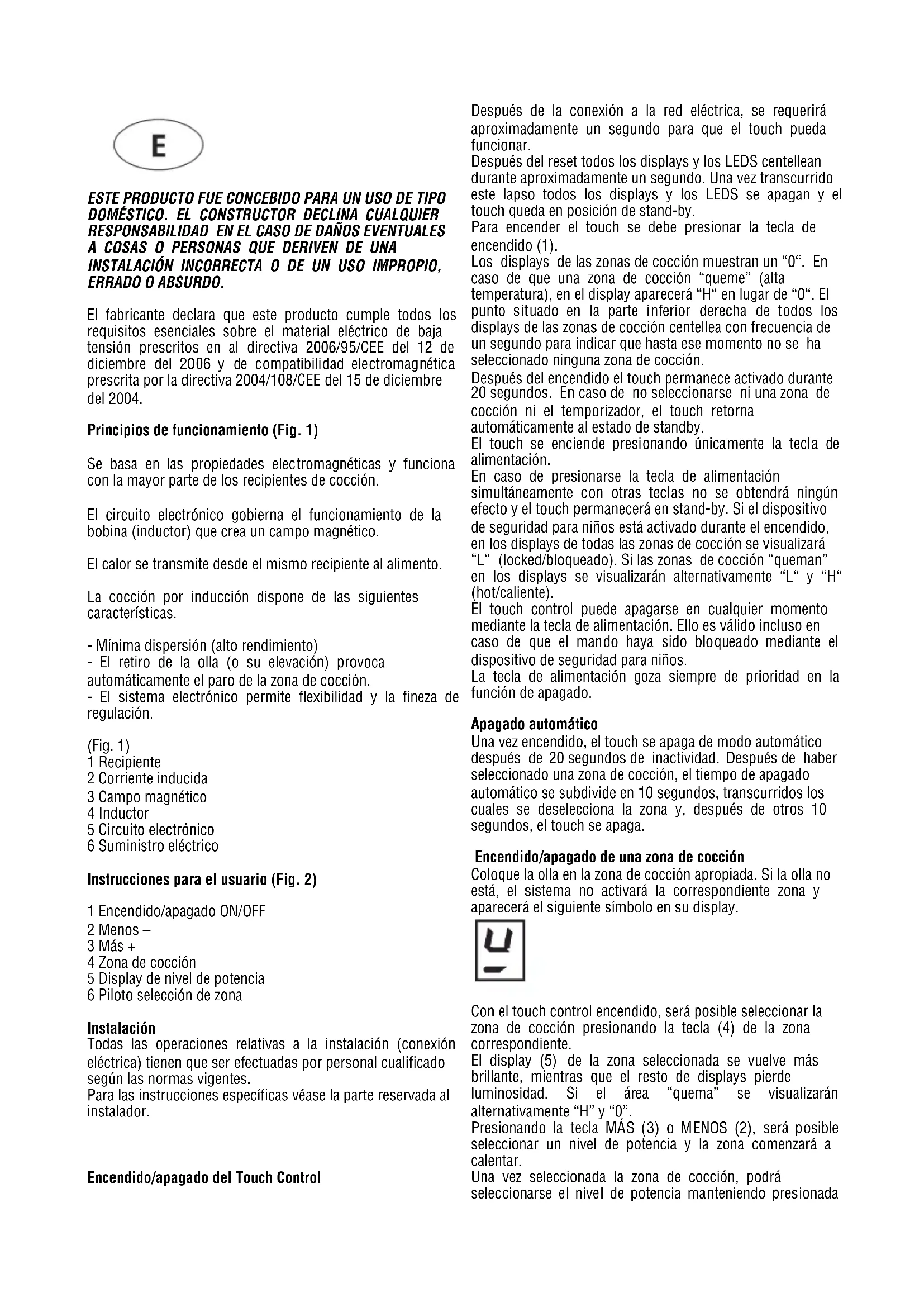 Después del encendido el touch permanece activado durante 20segundos.En caso de no seleccionarse ni una zona de coccción ni el temporizador, el touch returna automatistically al estado de standby.