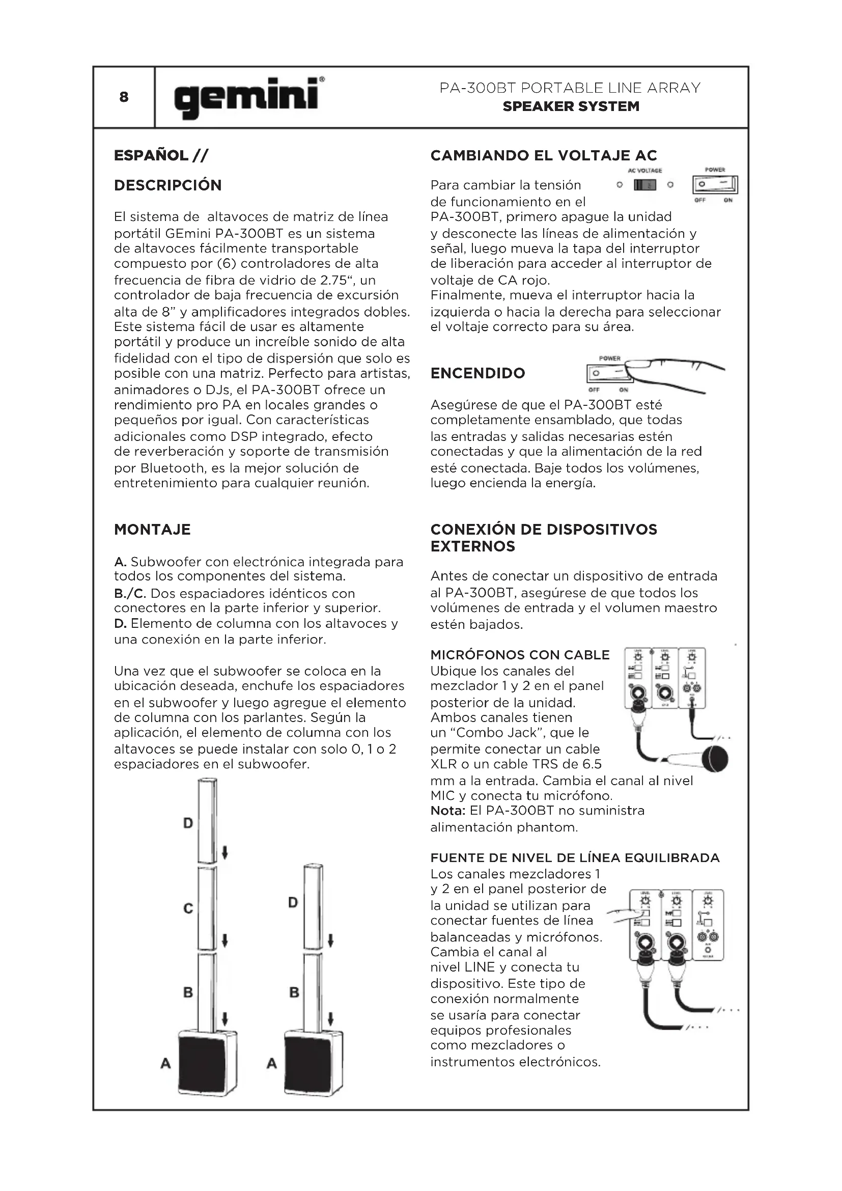 SPEAKER SYSTEM ESPAÑOL // DESCRIPCIÓN El sistema de altavoces de matriz de línea portátil GEmini PA-300BT es un sistema de altavoces fácilmente transportable compuesto por (6) controladores de alta frecuencia de bra de vidrio de 2.75“, un controlador de baja frecuencia de excursión alta de 8” y amplicadores integrados dobles. Este sistema fácil de usar es altamente portátil y produce un increíble sonido de alta delidad con el tipo de dispersión que solo es posible con una matriz. Perfecto para artistas, animadores o DJs, el PA-300BT ofrece un rendimiento pro PA en locales grandes o pequeños por igual. Con características adicionales como DSP integrado, efecto de reverberación y soporte de transmisión por Bluetooth, es la mejor solución de entretenimiento para cualquier reunión. MONTAJE A. Subwoofer con electrónica integrada para todos los componentes del sistema. B./C. Dos espaciadores idénticos con conectores en la parte inferior y superior. D. Elemento de columna con los altavoces y una conexión en la parte inferior. Una vez que el subwoofer se coloca en la ubicación deseada, enchufe los espaciadores en el subwoofer y luego agregue el elemento de columna con los parlantes. Según la aplicación, el elemento de columna con los altavoces se puede instalar con solo 0, 1 o 2 espaciadores en el subwoofer.