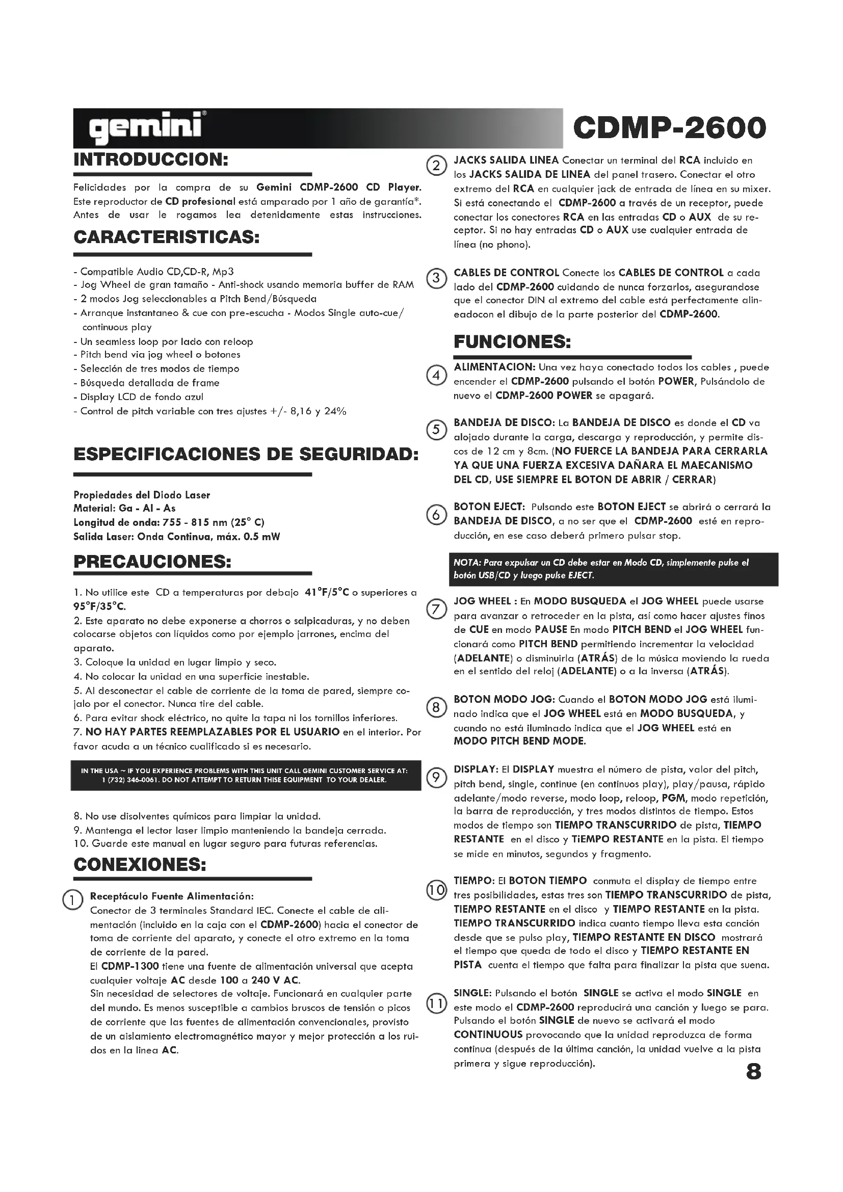Felidades por la compra de su Gemini CDMP-2600 CD Player. Este reproductor de CD profesoal está amparado por 1 año de garantía*. Antes de usar le rogamos lea detenidamente estas instrucciones.