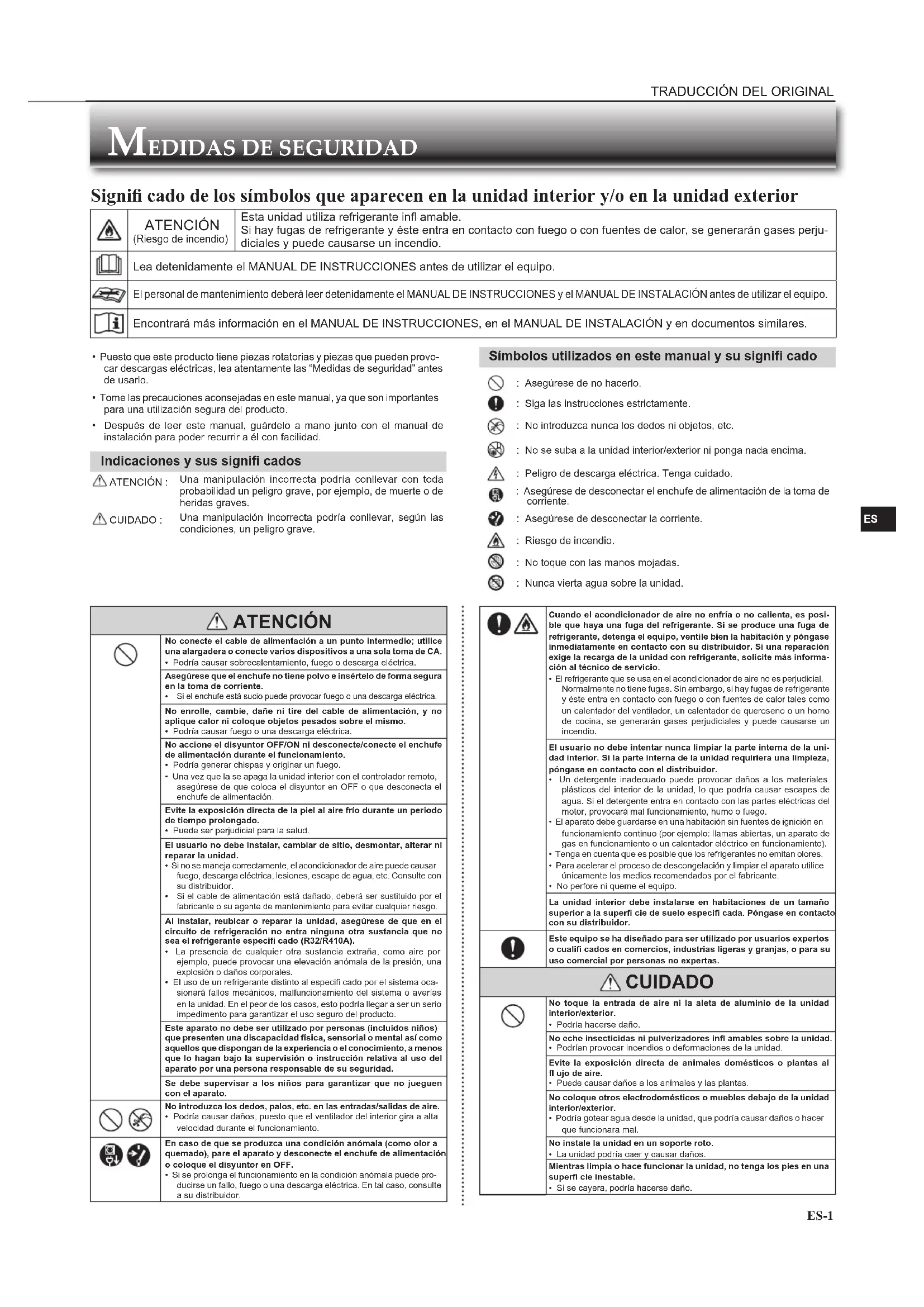 - Puesto que este producto tiene piezas rotatorias y piezas que pueden provo-car descargas eléctricas, lea atentamente las “Medidas de seguridad” antes de usarlo.• Tome las precauciones aconsejadas en este manual, ya que son importantes para una utilización segura del producto.• Después de leer este manual, guárdelo a mano junto con el manual de instalación para poder recurrir a él con facilidad. Indicaciones y sus signifi cados ATENCIÓN :Una manipulación incorrecta podría conllevar con toda probabilidad un peligro grave, por ejemplo, de muerte o de heridas graves. CUIDADO :Una manipulación incorrecta podría conllevar, según las condiciones, un peligro grave. Símbolos utilizados en este manual y su signifi cado : Asegúrese de no hacerlo. : Siga las instrucciones estrictamente. : No introduzca nunca los dedos ni objetos, etc. : No se suba a la unidad interior/exterior ni ponga nada encima. : Peligro de descarga eléctrica. Tenga cuidado. : Asegúrese de desconectar el enchufe de alimentación de la toma de corriente. : Asegúrese de desconectar la corriente. : Riesgo de incendio. : No toque con las manos mojadas. : Nunca vierta agua sobre la unidad. Signifi cado de los símbolos que aparecen en la unidad interior y/o en la unidad exterior ATENCIÓN (Riesgo de incendio)Esta unidad utiliza refrigerante infl amable.Si hay fugas de refrigerante y éste entra en contacto con fuego o con fuentes de calor, se generarán gases perju-diciales y puede causarse un incendio.Lea detenidamente el MANUAL DE INSTRUCCIONES antes de utilizar el equipo. El personal de mantenimiento deberá leer detenidamente el MANUAL DE INSTRUCCIONES y el MANUAL DE INSTALACIÓN antes de utilizar el equipo. Encontrará más información en el MANUAL DE INSTRUCCIONES, en el MANUAL DE INSTALACIÓN y en documentos similares. ATENCIÓN No conecte el cable de alimentación a un punto intermedio; utilice una alargadera o conecte varios dispositivos a una sola toma de CA.• Podría causar sobrecalentamiento, fuego o descarga eléctrica.Asegúrese que el enchufe no tiene polvo e insértelo de forma segura en la toma de corriente. Si el enchufe está sucio puede provocar fuego o una descarga eléctrica.No enrolle, cambie, dañe ni tire del cable de alimentación, y no aplique calor ni coloque objetos pesados sobre el mismo.• Podría causar fuego o una descarga eléctrica.No accione el disyuntor OFF/ON ni desconecte/conecte el enchufe de alimentación durante el funcionamiento.• Podría generar chispas y originar un fuego.• Una vez que la se apaga la unidad interior con el controlador remoto, asegúrese de que coloca el disyuntor en OFF o que desconecta el enchufe de alimentación. Evite la exposición directa de la piel al aire frío durante un periodo de tiempo prolongado.• Puede ser perjudicial para la salud.El usuario no debe instalar, cambiar de sitio, desmontar, alterar ni reparar la unidad.• Si no se maneja correctamente, el acondicionador de aire puede causar fuego, descarga eléctrica, lesiones, escape de agua, etc. Consulte con su distribuidor. Si el cable de alimentación está dañado, deberá ser sustituido por el fabricante o su agente de mantenimiento para evitar cualquier riesgo.Al instalar, reubicar o reparar la unidad, asegúrese de que en el circuito de refrigeración no entra ninguna otra sustancia que no sea el refrigerante especifi cado (R32/R410A).• La presencia de cualquier otra sustancia extraña, como aire por ejemplo, puede provocar una elevación anómala de la presión, una explosión o daños corporales.• El uso de un refrigerante distinto al especifi cado por el sistema oca-sionará fallos mecánicos, malfuncionamiento del sistema o averías en la unidad. En el peor de los casos, esto podría llegar a ser un serio impedimento para garantizar el uso seguro del producto.Este aparato no debe ser utilizado por personas (incluidos niños) que presenten una discapacidad física, sensorial o mental así como aquellos que dispongan de la experiencia o el conocimiento, a menos que lo hagan bajo la supervisión o instrucción relativa al uso del aparato por una persona responsable de su seguridad.Se debe supervisar a los niños para garantizar que no jueguen con el aparato. No introduzca los dedos, palos, etc. en las entradas/salidas de aire.• Podría causar daños, puesto que el ventilador del interior gira a alta velocidad durante el funcionamiento. En caso de que se produzca una condición anómala (como olor a quemado), pare el aparato y desconecte el enchufe de alimentación o coloque el disyuntor en OFF.• Si se prolonga el funcionamiento en la condición anómala puede pro-ducirse un fallo, fuego o una descarga eléctrica. En tal caso, consulte a su distribuidor. Cuando el acondicionador de aire no enfría o no calienta, es posi-ble que haya una fuga del refrigerante. Si se produce una fuga de refrigerante, detenga el equipo, ventile bien la habitación y póngase inmediatamente en contacto con su distribuidor. Si una reparación exige la recarga de la unidad con refrigerante, solicite más informa-ción al técnico de servicio.• El refrigerante que se usa en el acondicionador de aire no es perjudicial. Normalmente no tiene fugas. Sin embargo, si hay fugas de refrigerante y éste entra en contacto con fuego o con fuentes de calor tales como un calentador del ventilador, un calentador de queroseno o un horno de cocina, se generarán gases perjudiciales y puede causarse un incendio.El usuario no debe intentar nunca limpiar la parte interna de la uni-dad interior. Si la parte interna de la unidad requiriera una limpieza, póngase en contacto con el distribuidor.• Un detergente inadecuado puede provocar daños a los materiales plásticos del interior de la unidad, lo que podría causar escapes de agua. Si el detergente entra en contacto con las partes eléctricas del motor, provocará mal funcionamiento, humo o fuego.• El aparato debe guardarse en una habitación s