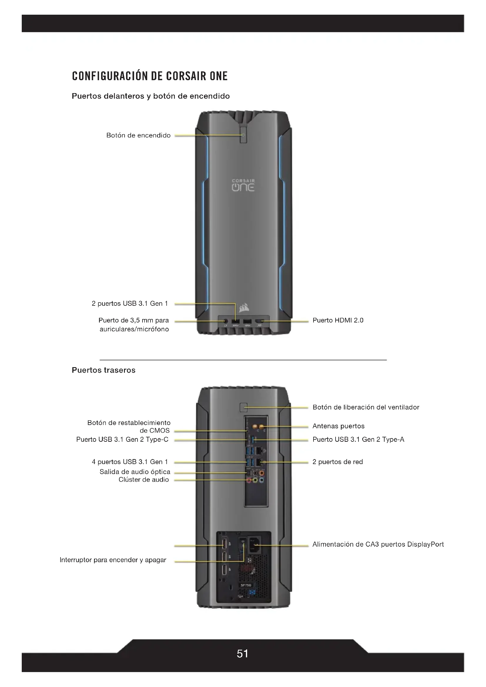 Puertos delanteros y botón de encendido Botón de encendido 2 puertos USB 3.1 Gen 1 Puertos traseros Puerto de 3,5mm para auriculares/micrófono Puerto HDMI 2.0 Botón de liberación del ventilador Botón de restablecimiento de CMOS 2 puertos de red Alimentación de CA3 puertos DisplayPort Clúster de audio Antenas puertos 4 puertos USB 3.1 Gen 1 Salida de audio óptica Puerto USB 3.1 Gen 2 Type-C Interruptor para encender y apagar Puerto USB 3.1 Gen 2 Type-A52 CORSAIR ONE incluye dos antenas inalámbricas. Atorníllelas a los conectores de la parte posterior de la unidad. Conecte el cable de alimentación al receptáculo de la parte posterior de CORSAIR ONE y, el otro extremo, a la toma de pared. Coloque el interruptor de alimentación en la posición de encendido. INSTALACIÓN DE LAS ANTENAS INALÁMBRICAS CONEXIÓN DEL CABLE DE ALIMENTACIÓN53 Conecte los cables DisplayPort de sus monitores al puerto DisplayPort de la parte posterior de CORSAIR ONE. Conecte los cables USB del teclado y el ratón a los puertos USB de la parte posterior de CORSAIR ONE.