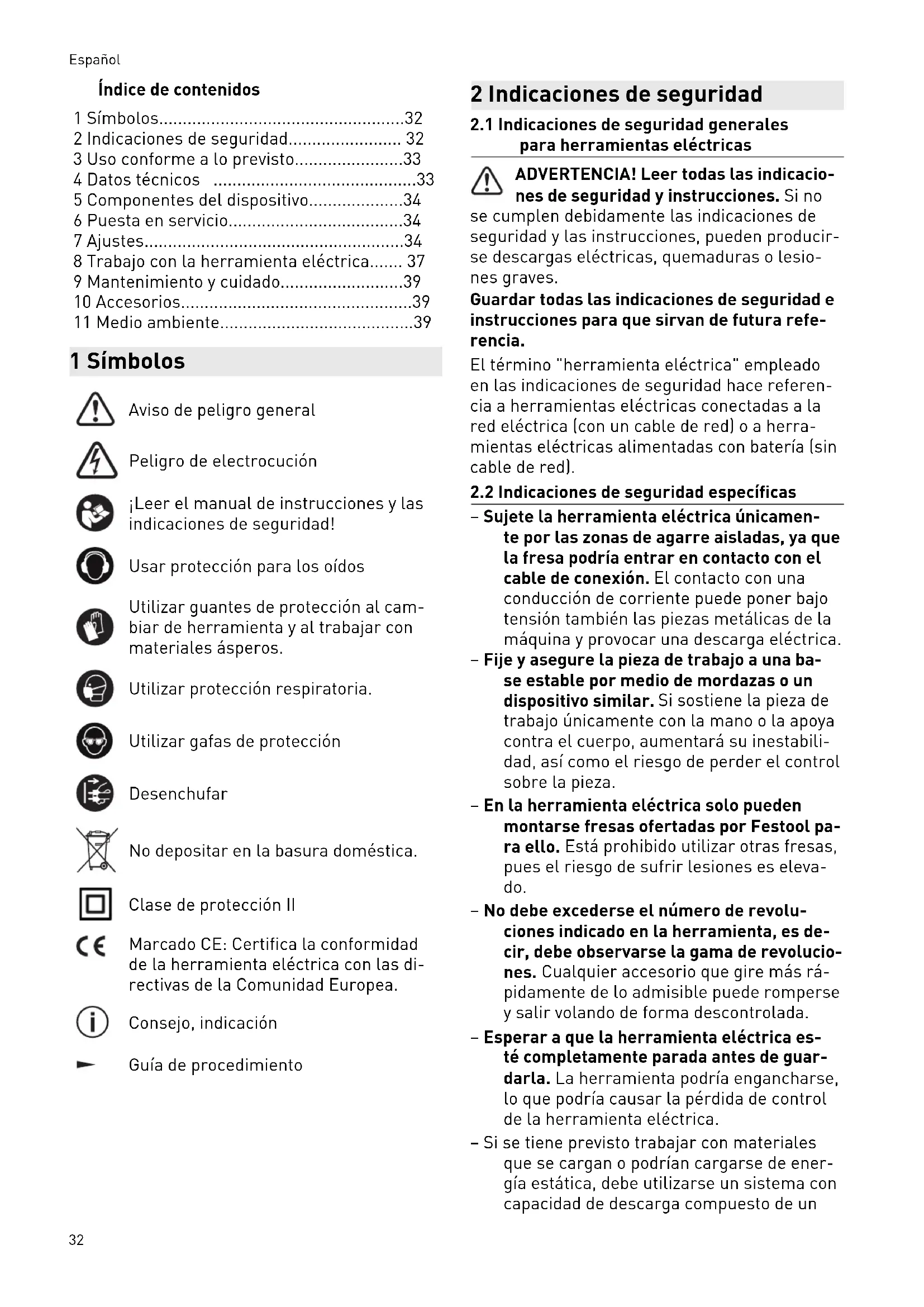 - 11 Medio ambiente 1 Símbolos Aviso de peligro general Peligro de electrocución ¡Leer el manual de instrucciones y las indicaciones de seguridad! Usar protección para los oídos Utilizar guantes de protección al cam biar de herramienta y al trabajar con materiales ásperos. Utilizar protección respiratoria. Utilizar gafas de protección Desenchufar No depositar en la basura doméstica. Clase de protección II Marcado CE: Certifica la conformidad de la herramienta eléctrica con las di rectivas de la Comunidad Europea. Consejo, indicación Guía de procedimiento 2 Indicaciones de seguridad p. 39
