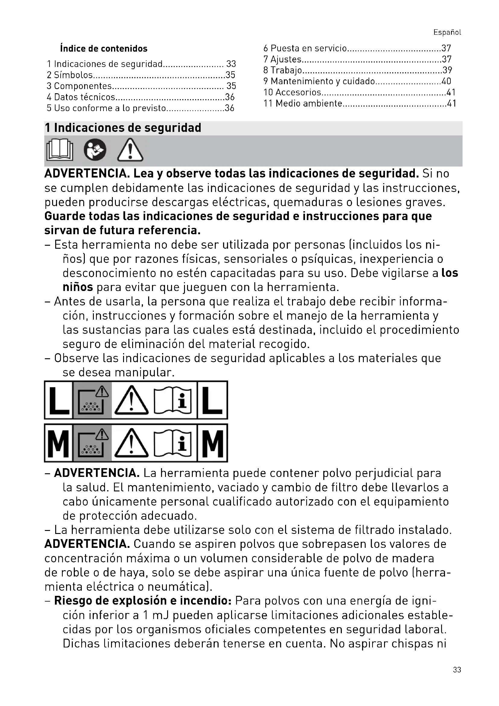 - 11 Medio ambiente 1 Indicaciones de seguridad ADVERTENCIA. Lea y observe todas las indicaciones de seguridad. Si no se cumplen debidamente las indicaciones de seguridad y las instrucciones, pueden producirse descargas eléctricas, quemaduras o lesiones graves. Guarde todas las indicaciones de seguridad e instrucciones para que sirvan de futura referencia. – Esta herramienta no debe ser utilizada por personas (incluidos los ni ños) que por razones físicas, sensoriales o psíquicas, inexperiencia o desconocimiento no estén capacitadas para su uso. Debe vigilarse a los niños para evitar que jueguen con la herramienta. – Antes de usarla, la persona que realiza el trabajo debe recibir informa ción, instrucciones y formación sobre el manejo de la herramienta y las sustancias para las cuales está destinada, incluido el procedimiento seguro de eliminación del material recogido. – Observe las indicaciones de seguridad aplicables a los materiales que se desea manipular. – ADVERTENCIA. La herramienta puede contener polvo perjudicial para la salud. El mantenimiento, vaciado y cambio de filtro debe llevarlos a cabo únicamente personal cualificado autorizado con el equipamiento de protección adecuado. – La herramienta debe utilizarse solo con el sistema de filtrado instalado. ADVERTENCIA. Cuando se aspiren polvos que sobrepasen los valores de concentración máxima o un volumen considerable de polvo de madera de roble o de haya, solo se debe aspirar una única fuente de polvo (herra mienta eléctrica o neumática). – Riesgo de explosión e incendio: Para polvos con una energía de igni ción inferior a 1mJ pueden aplicarse limitaciones adicionales estable cidas por los organismos oficiales competentes en seguridad laboral. Dichas limitaciones deberán tenerse en cuenta. No aspirar chispas ni Español 33polvo caliente; no aspirar líquidos combustibles ni explosivos (p. ej., ga solina o diluyentes); no aspirar líquidos agresivos/sustancias sólidas (p. ej., ácidos, detergentes, disolventes). Este sistema móvil de aspiración es apropiado para aspirar polvo de pintura. – No dañar el cable de conexión a la red eléctrica (p. ej., no pisarlo ni tirar de él con fuerza ). Proteger el cable del calor, del aceite y de cantos afilados. No extraer el conector del enchufe tirando del cable. – Compruebe el estado del enchufe y del cable con regularidad; en caso de que presenten daños, solicite su sustitución a un taller de servicio autorizado. Sustituya el cable de conexión a la red eléctrica por otro del tipo indicado en la lista de piezas de repuesto. – No exponer la máquina a la lluvia. – Por motivos de seguridad, conecte la herramienta únicamente a enchu fes provistos de puesta a tierra. – Utilice la caja de contacto de la herramienta solo para el fin especifica do en las instrucciones. – Utilizar únicamente accesorios Festool originales. – Desenchufar la herramienta en caso de no utilizarse o antes de realizar cualquier trabajo de mantenimiento y limpieza. p. 41