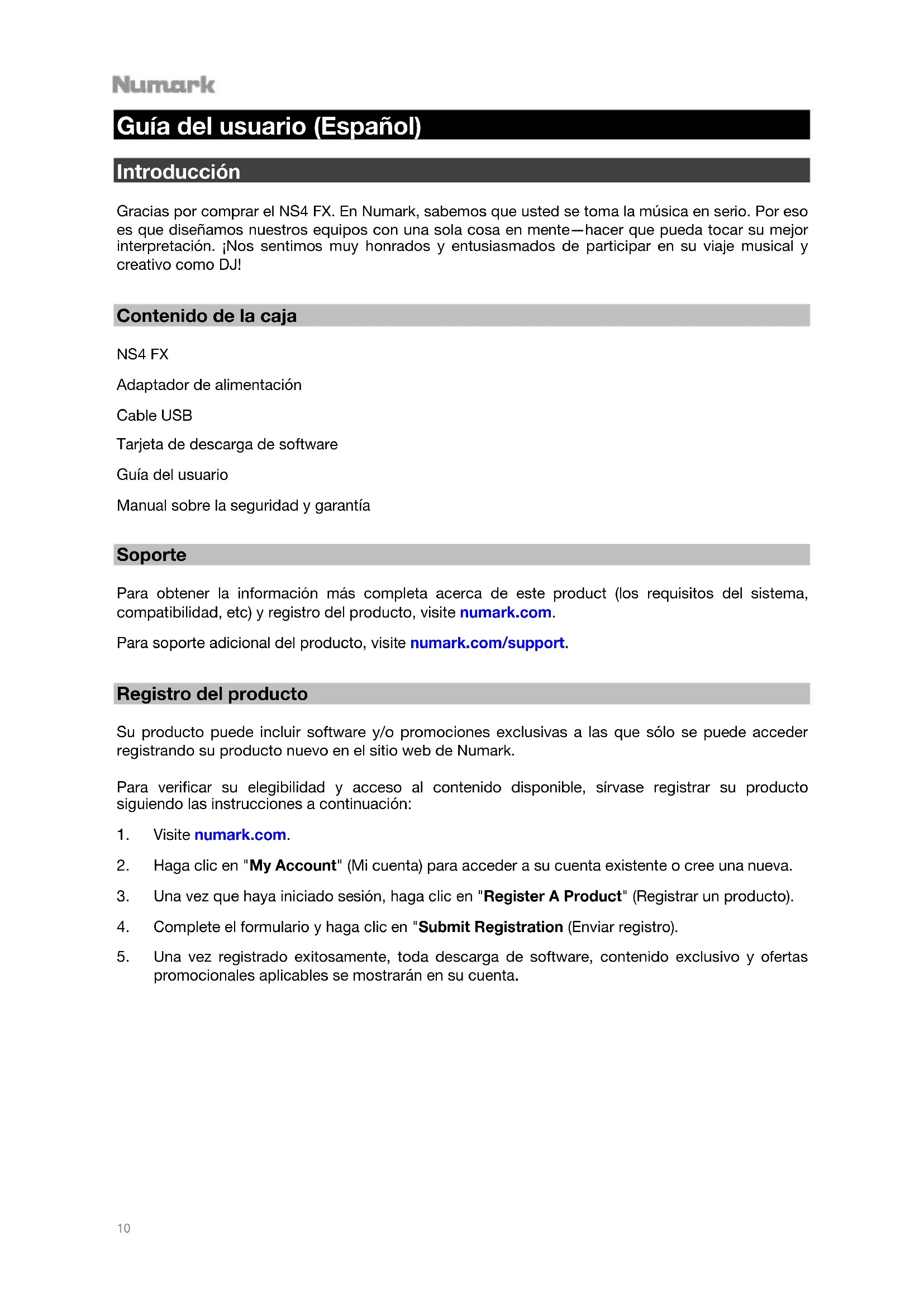 Guía del usuario (Español) Introducción Gracias por comprar el NS4 FX. En Numark, sabemos que usted se toma la música en serio. Por eso es que diseñamos nuestros equipos con una sola cosa en mente—hacer que pueda tocar su mejor interpretación. ¡Nos sentimos muy honrados y entusiasmados de participar en su viaje musical y creativo como DJ! Contenido de la caja NS4 FX Adaptador de alimentación Cable USB Tarjeta de descarga de software Guía del usuario Manual sobre la seguridad y garantía Soporte Para obtener la información más completa acerca de este product (los requisitos del sistema, compatibilidad, etc) y registro del producto, visite numark.com. Para soporte adicional del producto, visite numark.com/support. Registro del producto Su producto puede incluir software y/o promociones exclusivas a las que sólo se puede acceder registrando su producto nuevo en el sitio web de Numark. Para verificar su elegibilidad y acceso al contenido disponible, sírvase registrar su producto siguiendo las instrucciones a continuación: