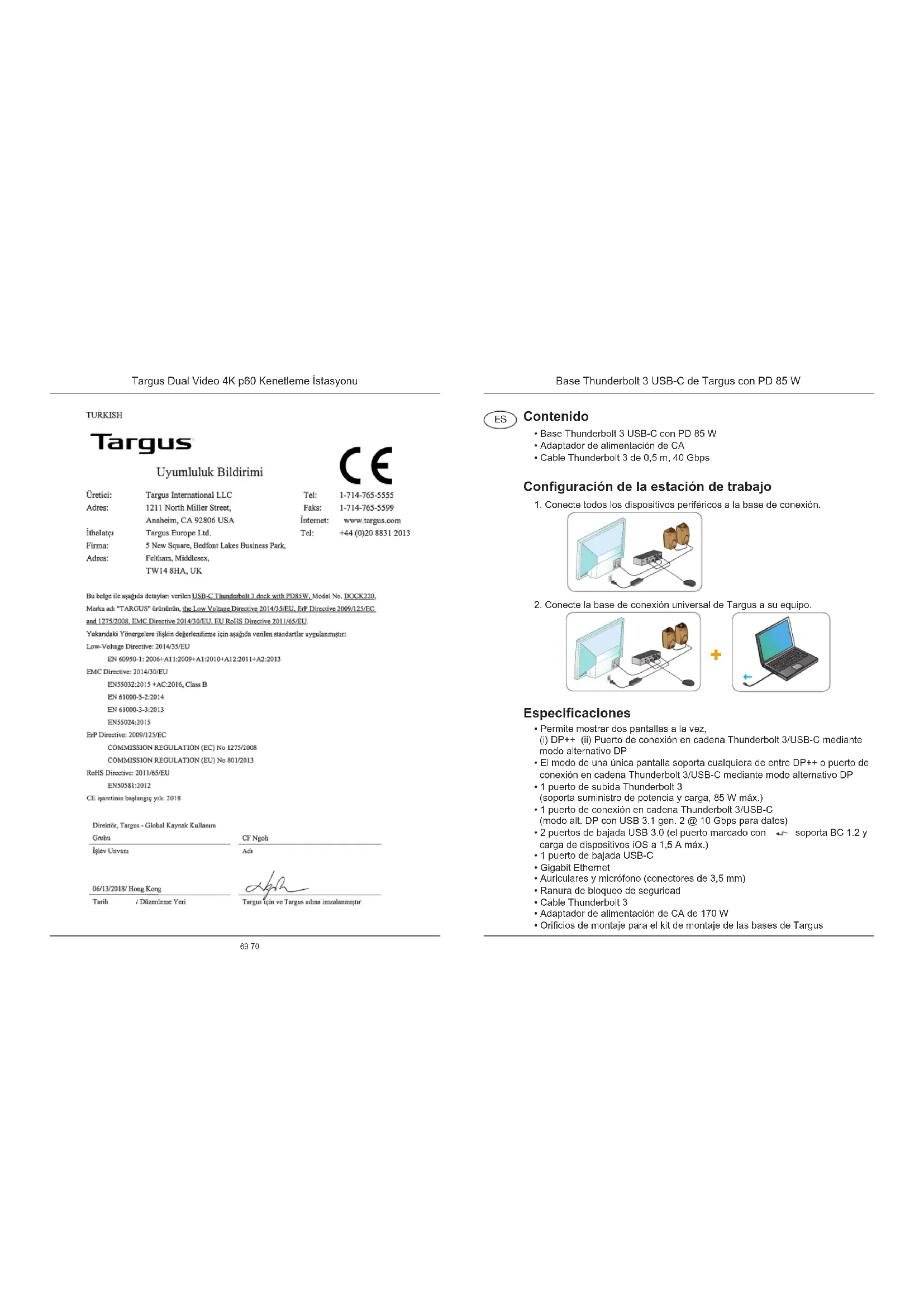 - Oricios de montaje para el kit de montaje de las bases de Targus Targus Dual Video 4K p60 Kenetleme İstasyonu +71 72 Base Thunderbolt 3 USB-C de Targus con PD 85 W Gráco de la base de conexión Requisitos del sistema Hardware