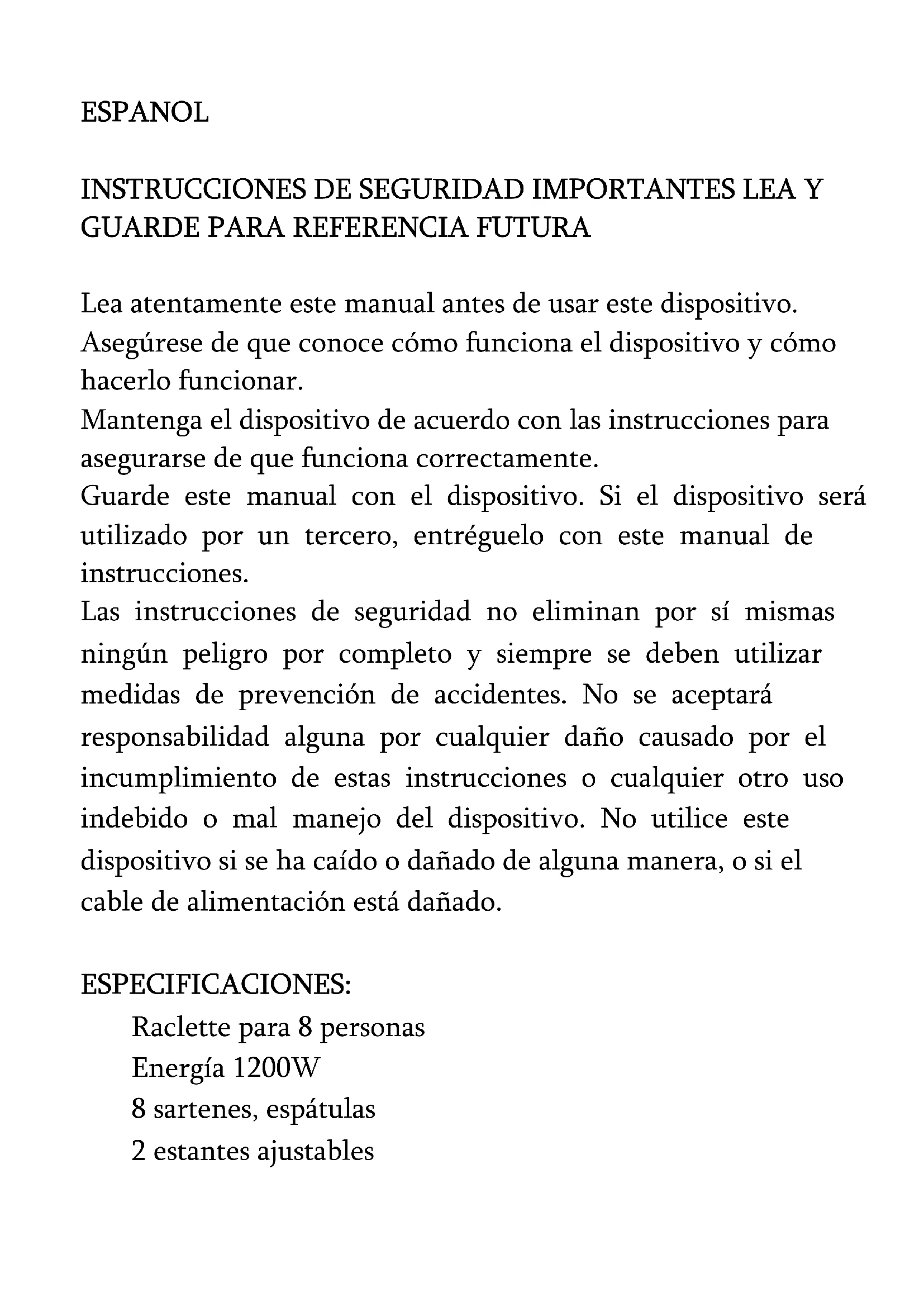 Utilice la Raclette transparente dentro y no en lugares abiertos. No use este aparato si su cable de alimentacion o enchufe está danados, si no está的功能ando correctamente, está en mal estado o se ha caido. Si el cable de alimentacion está deteriorado deben ser replazado por el fabricante, su personal的技术o o un especialista similar para evaporar riesgos poteciales.