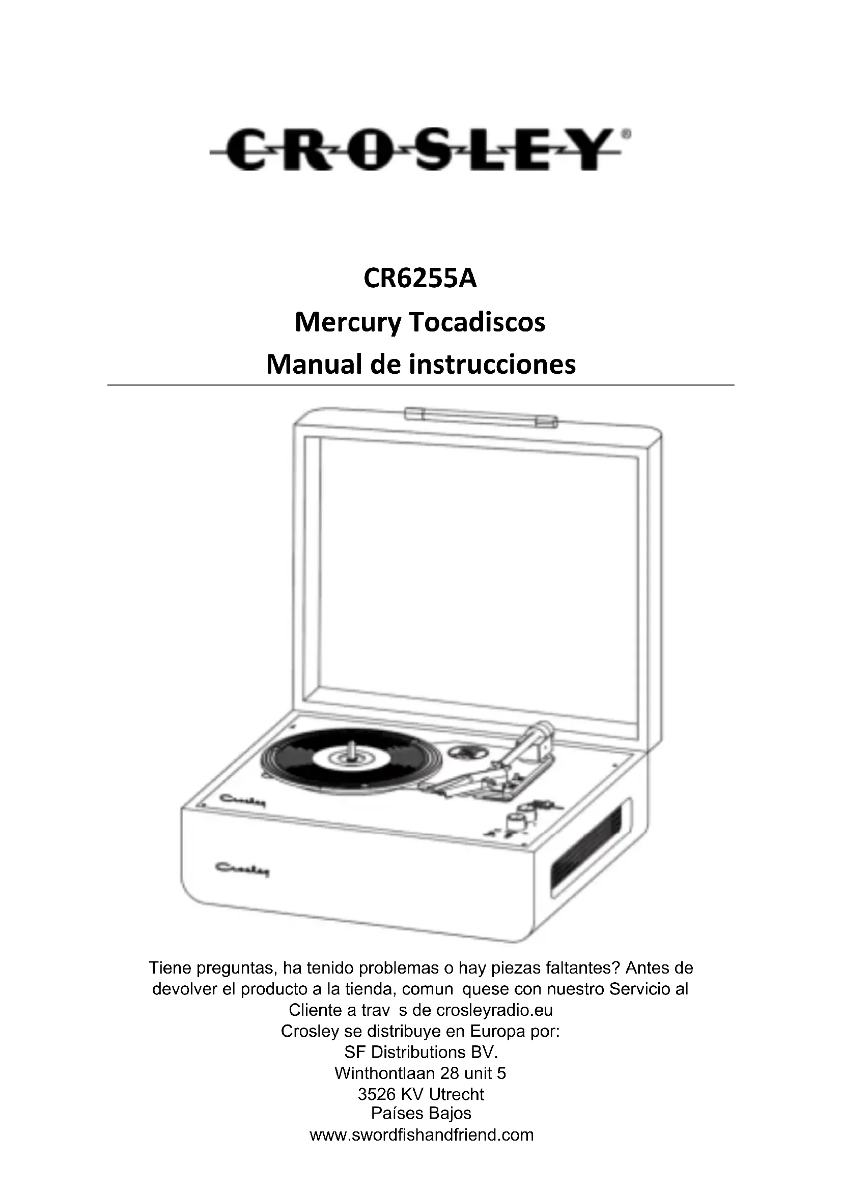 Declaraciones de la FCC Este dispositivo cumple con la Sección 15 de las reglas de la Comisión Federal de Comunicaciones (FCC). El uso de este equipo está sujeto a las dos condiciones siguientes: (1) Este dispositivo no causa interferencia perjudicial y (2) este dispositivo debe aceptar cualquier interferencia recibida, incluso interferencia que pueda causar un funcionamiento no deseado. Nota: Este equipo se verificó y se comprobó que cumple con los límites para un dispositivo digital clase B, conforme a la Sección 15 de las reglas de la Comisión Federal de Comunicaciones (FCC). Estos límites están diseñados para brindar una protección razonable frente a interferencia perjudicial en un establecimiento residencial. Este equipo genera, usa y puede irradiar energía de radiofrecuencia y, si no se instala y utiliza siguiendo las instrucciones, puede causar interferencia perjudicial a las radiocomunicaciones. Sin embargo, no existe garantía de que la interferencia no ocurrirá en una instalación en particular. Si este equipo causa interferencia perjudicial a las radiocomunicaciones o a la recepción televisiva, lo que se puede determinar al encender y apagar el equipo, se recomienda que el usuario intente corregir la interferencia mediante una o más de las siguientes medidas: − Reorientar o reubicar la antena de recepción. − Aumentar la separación entre el equipo y el receptor. − Conectar el equipo a una toma en un circuito diferente del circuito en el que está conectado el receptor. − Consultar al proveedor o a un técnico con experiencia en radio/TV para obtener ayuda. Nota: El Beneficiario no es responsable de cualquier cambio o modificación que no tenga la aprobación expresa de la parte responsable del cumplimiento. Estas modificaciones podrían anular la autoridad del usuario para operar el equipo. El dispositivo ha sido evaluado para cumplir con el requisito general de exposición a RF. Para mantener el cumplimiento de las pautas de exposición a RF de la FCC, la distancia debe ser de al menos 20 cm entre el radiador y su cuerpo, y debe estar totalmente soportada por las configuraciones de instalación y operación del transmisor y su(s) antena(s). DECLARACIÓN DE CONFORMIDAD SIMPLIFICADA DE EU Por la presente, Modern Marketing Concepts Inc., que opera bajo la denominación comercial de Crosley Brands, declara que el tipo de equipo de radio cumple con la Directiva 2014/53/UE. El texto completo de la declaración de conformidad de la UE está disponible en la siguiente dirección de Internet: http://crosleybrands.com/euDoCCR6255A Platine tourne-disque Mercury Manuel d’utilisation Questions, problemes, pieces manquantes? Avant de retourner au magasin, appelez le service client sur www.crosleyradio.eu, service@crosleyradio.eu ou +31 (0) 306622470. Crosley est distribu en Europe par: SF Distributions BV. Winthontlaan 28 unit 5 3526 KV Utrecht les Pays-Bas www.swordfishandfriend.comFrançais