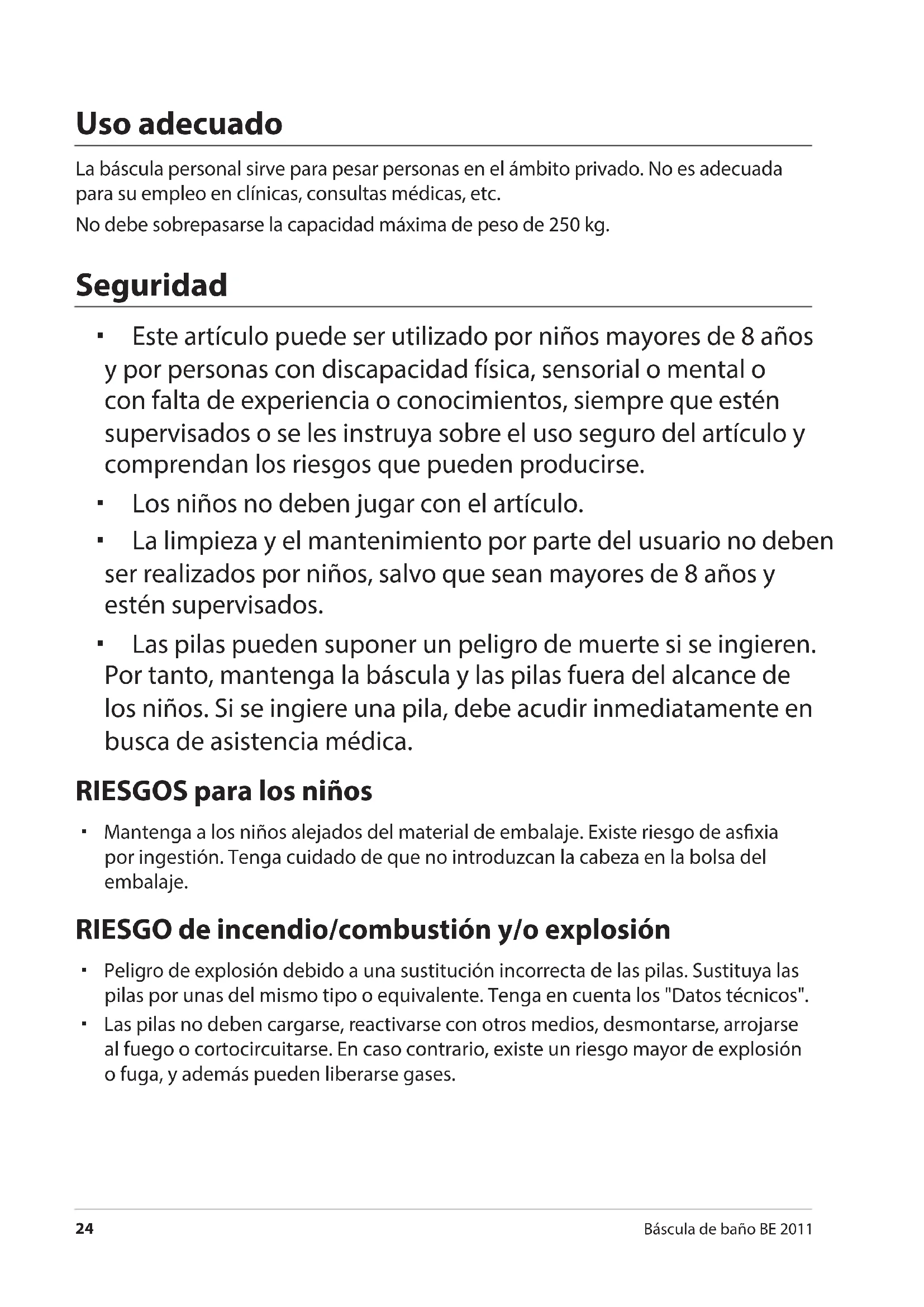 Báscula de baño BE 2011 Uso adecuado La báscula personal sirve para pesar personas en el ámbito privado. No es adecuada para su empleo en clínicas, consultas médicas, etc. No debe sobrepasarse la capacidad máxima de peso de 250 kg. Seguridad Este artículo puede ser utilizado por niños mayores de 8 años y por personas con discapacidad física, sensorial o mental o con falta de experiencia o conocimientos, siempre que estén supervisados o se les instruya sobre el uso seguro del artículo y comprendan los riesgos que pueden producirse. Los niños no deben jugar con el artículo. La limpieza y el mantenimiento por parte del usuario no deben ser realizados por niños, salvo que sean mayores de 8años y estén supervisados. Las pilas pueden suponer un peligro de muerte si se ingieren. Por tanto, mantenga la báscula y las pilas fuera del alcance de los niños. Si se ingiere una pila, debe acudir inmediatamente en busca de asistencia médica. RIESGOS para los niños Mantenga a los niños alejados del material de embalaje. Existe riesgo de asxia por ingestión. Tenga cuidado de que no introduzcan la cabeza en la bolsa del embalaje. RIESGO de incendio/combustión y/o explosión Peligro de explosión debido a una sustitución incorrecta de las pilas. Sustituya las pilas por unas del mismo tipo o equivalente. Tenga en cuenta los "Datos técnicos". Las pilas no deben cargarse, reactivarse con otros medios, desmontarse, arrojarse al fuego o cortocircuitarse. En caso contrario, existe un riesgo mayor de explosión o fuga, y además pueden liberarse gases.Seguridad
