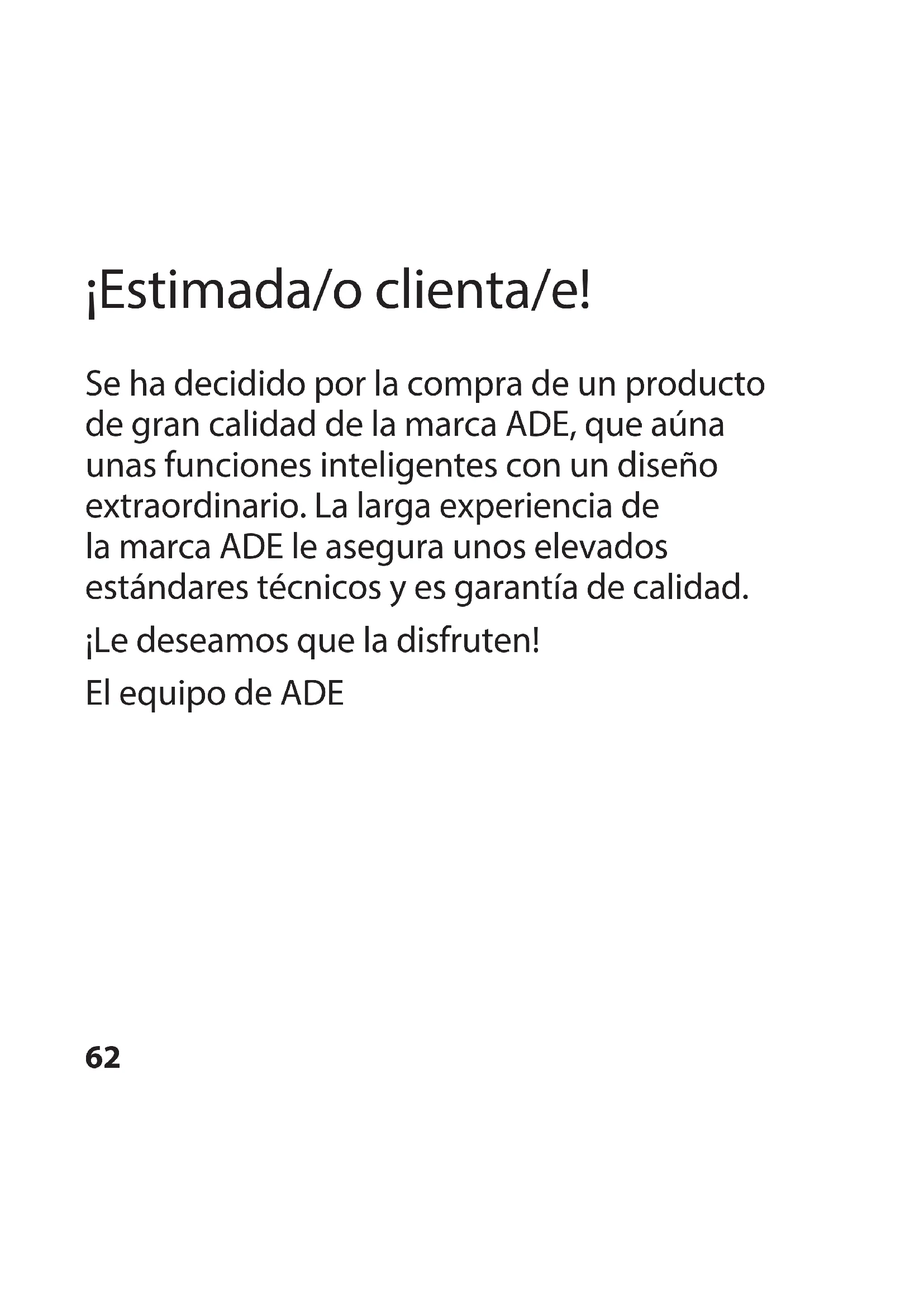 Eliminación Eliminación del embalaje Elimine el embalaje separando los materiales. Lleve el papel y cartón al contenedor de cartón y las láminas al de plásticos. Eliminación del artículo Elimine el artículo conforme a la normativa correspondiente aplicable en su país. Los aparatos no deben eliminarse con la basura doméstica normal El artículo debe ser eliminado de forma adecuada al final de su vida útil.90 Para ello, se deben reciclar las piezas del aparato y así evitar un daño al medio ambiente. Deposite el aparato antiguo en un punto de recogida de restos electrónicos o desechos reciclables. Para más información, diríjase a su empresa de recogida de residuos o administración local. Las pilas y baterías no son residuos domésticos Todas las pilas y baterías deben depositarse en los puntos de recogida del ayuntamiento, del distrito o en los comercios. De este modo, puede realizarse la eliminación de pilas y baterías de una forma respetuosa con el medio ambiente.91 ES92 Chère cliente, cher client! Nous sommes ravis que vous ayez choisi un appareil de haute qualité de la marque ADE, qui allie des fonctions intelligentes à un design exceptionnel. Les années d'expérience de la marque ADE garantissent une haute technicité et une qualité éprouvée. Nous espérons qu'il vous apportera entière satisfaction! L’équipe ADE93