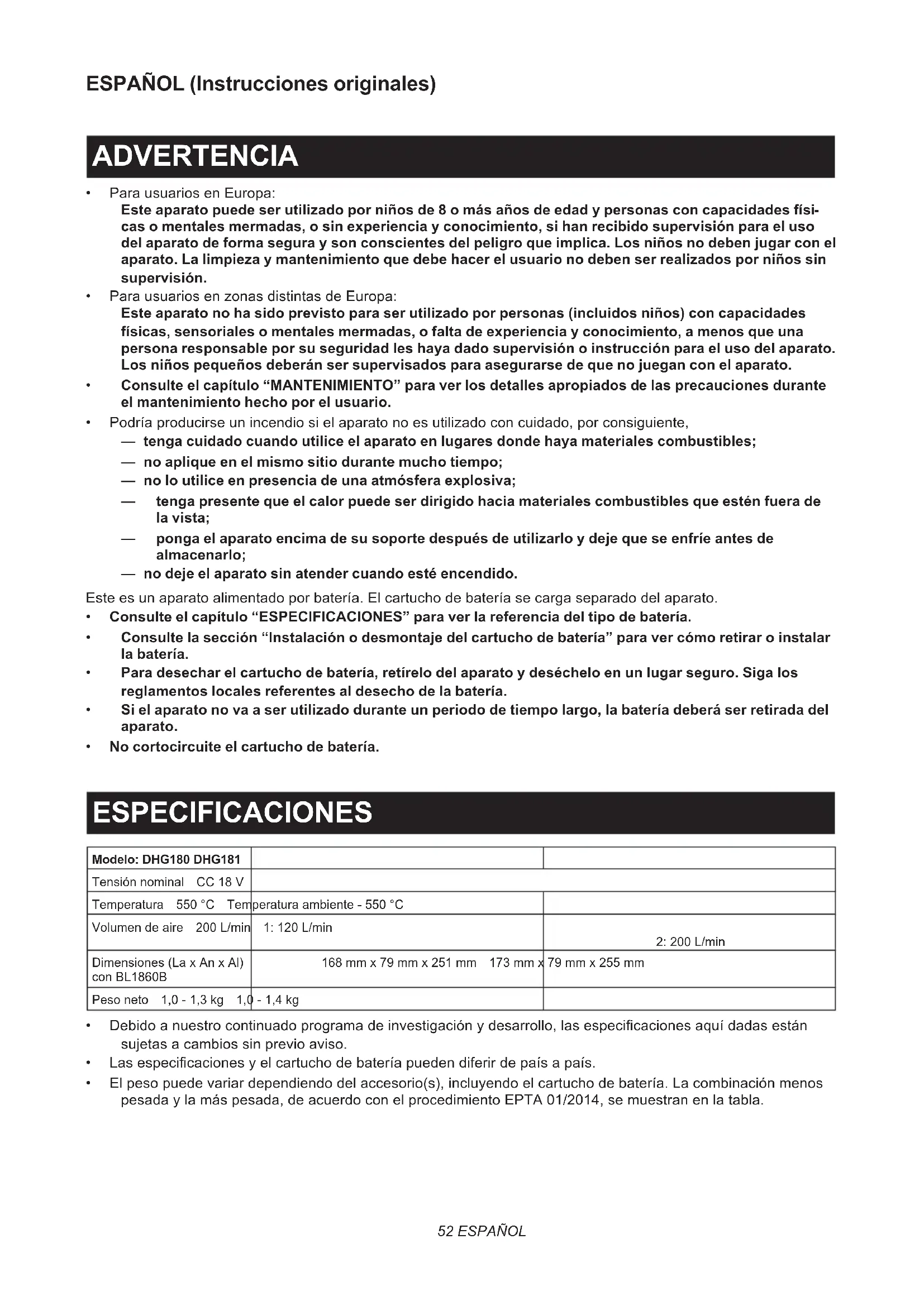 - No cortocircuite el cartucho de batería. ESPECIFICACIONES Modelo: DHG180 DHG181 Tensiónnominal CC18V Temperatura 550°C Temperaturaambiente-550°C Volumendeaire 200L/min 1:120L/min 2:200L/min Dimensiones(LaxAnxAl) conBL1860B 168mmx79mmx251mm 173mmx79mmx255mm Pesoneto 1,0-1,3kg 1,0-1,4kg