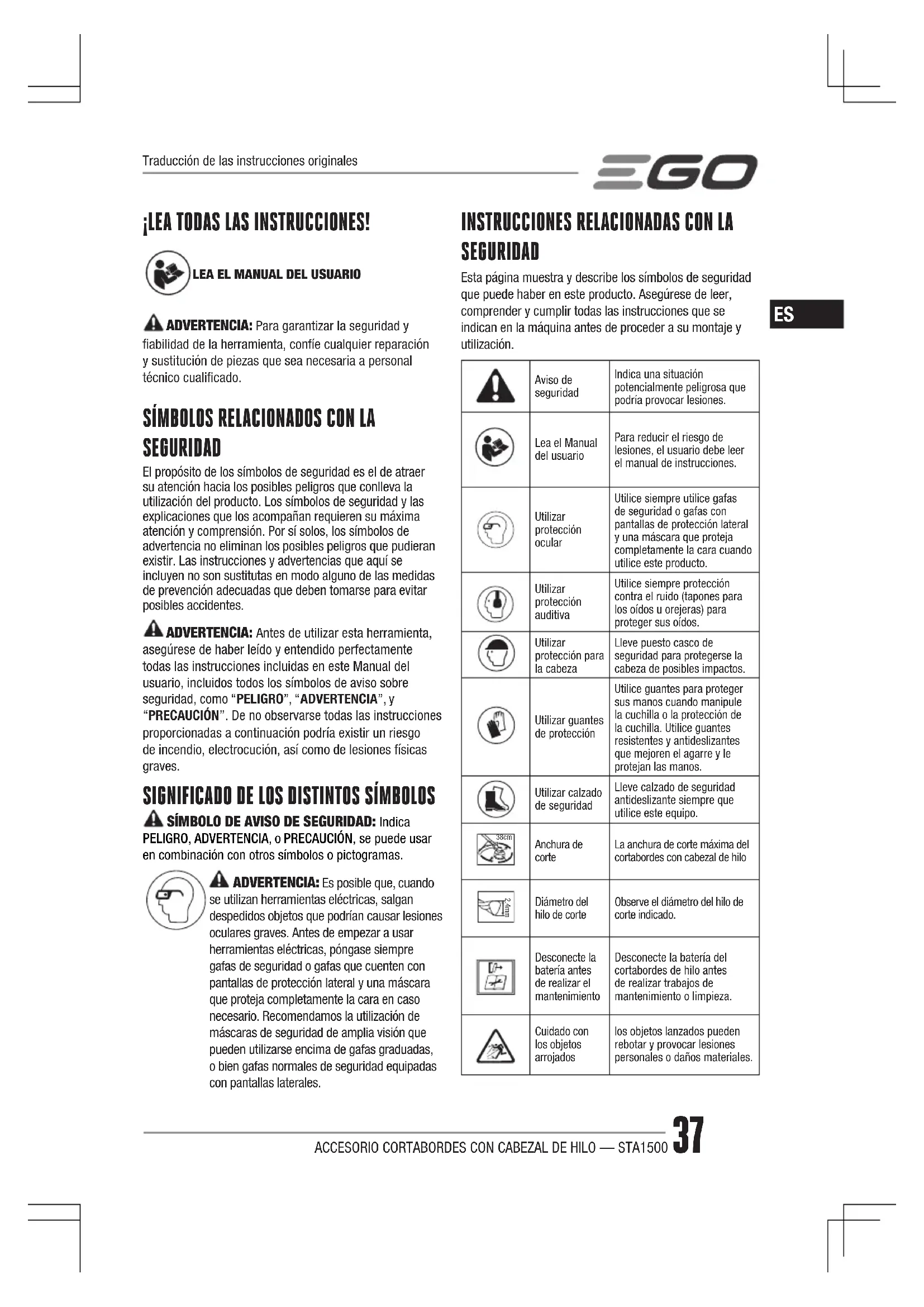 DENOMINACIÓN DE PIEZA CANTIDADAccesorio cortabordes con cabezal de hilo 1Guarda de protección 1Llave hexagonal 1Llave multifunción 1Manual de instrucciones 1Consulte el hilo de corte recomendado en la página web egopowerplus.eu, o en el catálogo de productos de EGO. DESCRIPCIÓN FAMILIARÍCESE CON SU CORTABORDES CON CABEZAL DE HILO (Fig. A)1. Tapón2. Tubo del cortabordes con cabezal de hilo 3. Hilo de corte4. Cuchilla de recorte del hilo5. Lengüeta de liberación6. Hilo de corte7. Guarda de protección8. Llave hexagonal9. Llave multifunción ADVERTENCIA: Nunca utilice la herramienta sin la protección instalada y rmemente sujeta en su sitio. La protección deberá estar siempre instalada en la herramienta a n de ofrecer protección al usuario. CONJUNTO ADVERTENCIA: Si alguna pieza falta o está rota, no utilice el producto hasta haber sustituido las piezas rotas o instalado las que faltan. Podrían producirse lesiones físicas graves en caso de utilizar el producto si alguna de sus piezas falta o está dañada. ADVERTENCIA: No intente modicar esta herramienta en modo alguno ni fabricar accesorios no recomendados para su uso en este cortabordes con cabezal de hilo. Cualquier alteración o modicación se considerará uso indebido y podría provocar una situación peligrosa con riesgo de sufrir lesiones graves. ADVERTENCIA: Para evitar una puesta en marcha accidental que podría causar lesiones graves, quite siempre la batería de la máquina antes de montar piezas.MONTAJE DE LA GUARDA DE PROTECCIÓN ADVERTENCIA: Utilice siempre guantes al instalar o sustituir la protección. Tenga cuidado con la cuchilla instalada en la protección y protéjase las manos adecuadamente para evitar cortarse. ADVERTENCIA: Nunca utilice la máquina sin la protección instalada y rmemente sujeta en su sitio. ¡LaACCESORIO CORTABORDES CON CABEZAL DE HILO — STA1500 43