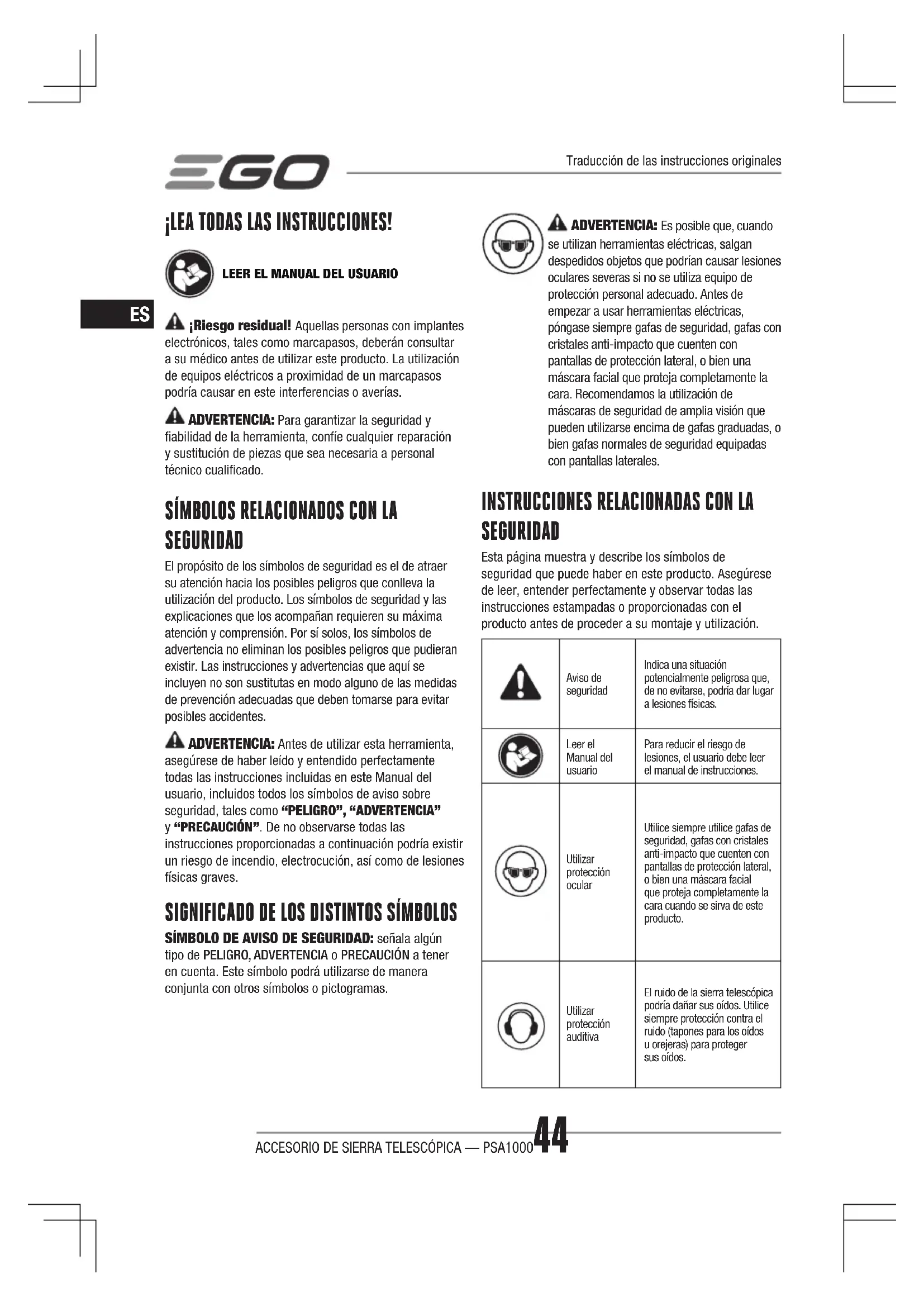 SEGURIDAD Esta página muestra y describe los símbolos de seguridad que puede haber en este producto. Asegúrese de leer, entender perfectamente y observar todas las instrucciones estampadas o proporcionadas con el producto antes de proceder a su montaje y utilización. Aviso de seguridadIndica una situación potencialmente peligrosa que, de no evitarse, podría dar lugar a lesiones físicas.Leer el Manual del usuarioPara reducir el riesgo de lesiones, el usuario debe leer el manual de instrucciones.Utilizar protección ocularUtilice siempre utilice gafas de seguridad, gafas con cristales anti-impacto que cuenten con pantallas de protección lateral, o bien una máscara facial que proteja completamente la cara cuando se sirva de este producto.Utilizar protección auditivaEl ruido de la sierra telescópica podría dañar sus oídos. Utilice siempre protección contra el ruido (tapones para los oídos u orejeras) para proteger sus oídos. Traducción de las instrucciones originalesACCESORIO DE SIERRA TELESCÓPICA — PSA1000 45