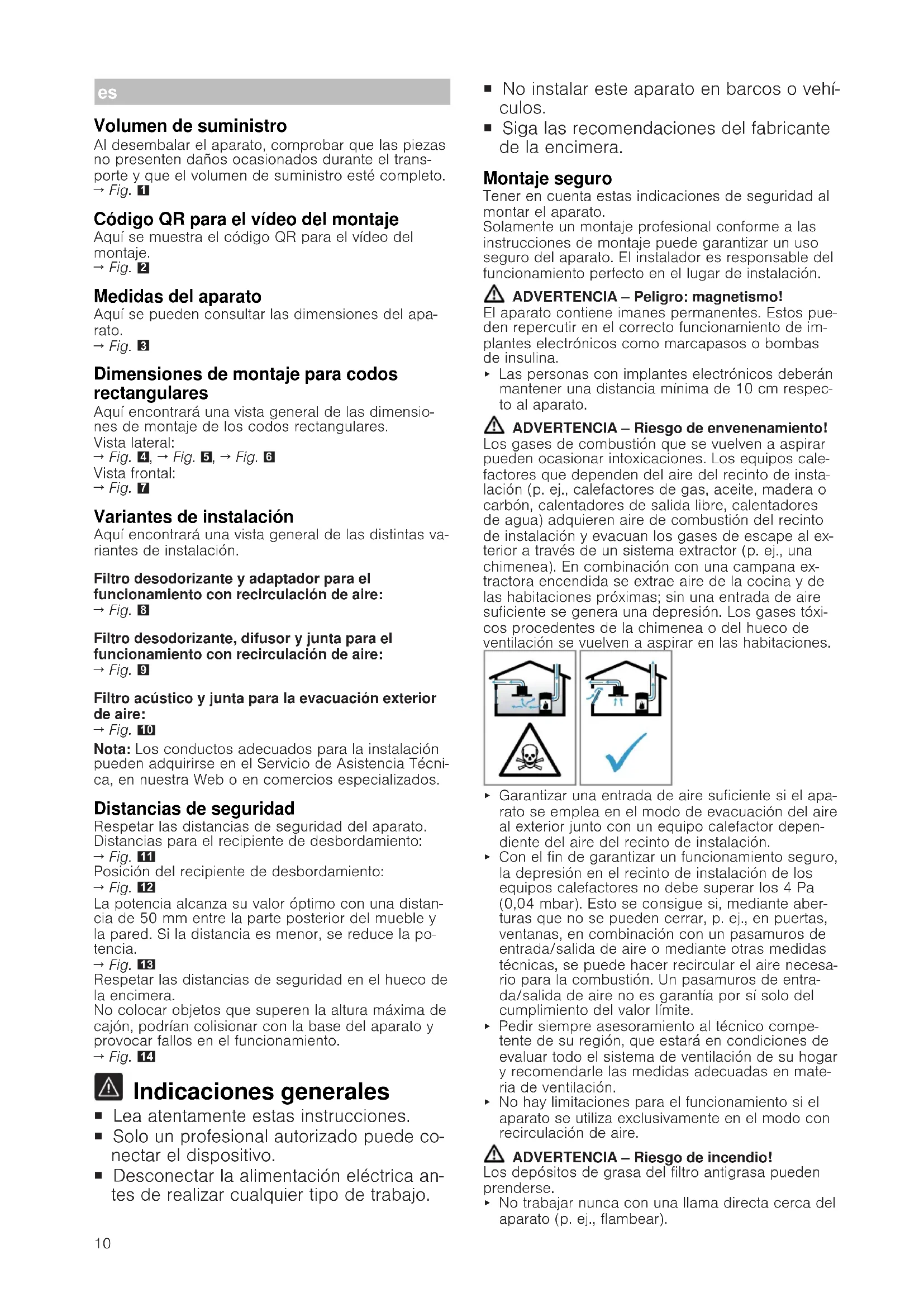 Indicaciones generales ¡ Lea atentamente estas instrucciones. ¡ Solo un profesional autorizado puede co- nectar el dispositivo. ¡ Desconectar la alimentación eléctrica an- tes de realizar cualquier tipo de trabajo. ¡ No instalar este aparato en barcos o vehí- culos. ¡ Siga las recomendaciones del fabricante de la encimera. Montaje seguro Tener en cuenta estas indicaciones de seguridad al montar el aparato. Solamente un montaje profesional conforme a las instrucciones de montaje puede garantizar un uso seguro del aparato. El instalador es responsable del funcionamiento perfecto en el lugar de instalación. ADVERTENCIA‒Peligro: magnetismo! El aparato contiene imanes permanentes. Estos pue- den repercutir en el correcto funcionamiento de im- plantes electrónicos como marcapasos o bombas de insulina. ▶ Las personas con implantes electrónicos deberán mantener una distancia mínima de 10cm respec- to al aparato. ADVERTENCIA‒Riesgo de envenenamiento! Los gases de combustión que se vuelven a aspirar pueden ocasionar intoxicaciones. Los equipos cale- factores que dependen del aire del recinto de insta- lación (p. ej., calefactores de gas, aceite, madera o carbón, calentadores de salida libre, calentadores de agua) adquieren aire de combustión del recinto de instalación y evacuan los gases de escape al ex- terior a través de un sistema extractor (p. ej., una chimenea). En combinación con una campana ex- tractora encendida se extrae aire de la cocina y de las habitaciones próximas; sin una entrada de aire suficiente se genera una depresión. Los gases tóxi- cos procedentes de la chimenea o del hueco de ventilación se vuelven a aspirar en las habitaciones. ▶ Garantizar una entrada de aire suficiente si el apa- rato se emplea en el modo de evacuación del aire al exterior junto con un equipo calefactor depen- diente del aire del recinto de instalación. ▶ Con el fin de garantizar un funcionamiento seguro, la depresión en el recinto de instalación de los equipos calefactores no debe superar los 4Pa (0,04mbar). Esto se consigue si, mediante aber- turas que no se pueden cerrar, p. ej., en puertas, ventanas, en combinación con un pasamuros de entrada/salida de aire o mediante otras medidas técnicas, se puede hacer recircular el aire necesa- rio para la combustión. Un pasamuros de entra- da/salida de aire no es garantía por sí solo del cumplimiento del valor límite. ▶ Pedir siempre asesoramiento al técnico compe- tente de su región, que estará en condiciones de evaluar todo el sistema de ventilación de su hogar y recomendarle las medidas adecuadas en mate- ria de ventilación. ▶ No hay limitaciones para el funcionamiento si el aparato se utiliza exclusivamente en el modo con recirculación de aire. ADVERTENCIA‒Riesgo de incendio! Los depósitos de grasa del filtro antigrasa pueden prenderse. ▶ No trabajar nunca con una llama directa cerca del aparato (p. ej., flambear).11 ▶ Instalar el aparato cerca de un equipo calefactor para combustibles sólidos (p. ej., madera o car- bón) solo si se dispone de una cubierta cerrada no desmontable. No deben saltar chispas. ADVERTENCIA‒Riesgo de lesiones! La realización de modificaciones en la estructura eléctrica o mecánica resulta peligrosa y puede pro- vocar un funcionamiento erróneo. ▶ No realizar modificaciones en la estructura eléctri- ca ni mecánica. Las piezas que estén accesibles durante el montaje pueden tener los bordes afilados o causar cortes al tocarlas. ▶ Llevar guantes protectores El aparato es pesado. ▶ Para mover el aparato se necesitan 2 personas. ▶ Utilizar únicamente los medios auxiliares apropia- dos. ADVERTENCIA‒Riesgo de asfixia! Los niños pueden ponerse el material de embalaje por encima de la cabeza, o bien enrollarse en él, y asfixiarse. ▶ Mantener el material de embalaje fuera del alcan- ce de los niños. ▶ No permita que los niños jueguen con el embala- je. ADVERTENCIA‒Riesgo de envenenamiento! Los gases de combustión que se vuelven a aspirar pueden ocasionar intoxicaciones. ▶ No conducir el aire de salida hacia una chimenea de humos o gases de escape que esté en servi- cio. ▶ No conducir el aire de salida hacia un hueco des- tinado a ventilar recintos de instalación de equi- pos calefactores. ▶ Si el aire de salida se evacua hacia una chimenea de humos o gases de escape que no está en ser- vicio, será necesario contar previamente con la aprobación del técnico competente que corres- ponda. Los gases de combustión que se vuelven a aspirar pueden ocasionar intoxicaciones. ▶ Si hay instalada una campana extractora con chi- menea estanca, se debe equipar el suministro eléctrico de la campana extractora con un circuito de protección adecuado. Indicaciones relativas a la conexión eléctrica Para conectar eléctricamente el aparato de forma segura, consultar estas indicaciones. ADVERTENCIA‒Riesgo de descarga eléctrica! Debe ser posible desenchufar el aparato de la red eléctrica en cualquier momento. El aparato solo po- drá conectarse a una toma de corriente debidamen- te instalada. ▶ Se debe instalar un dispositivo de separación om- nipolar en la instalación eléctrica fija, de acuerdo con las condiciones de la categoría de sobreten- sión III y las normas de instalación. ▶ Solo un electricista cualificado puede efectuar la instalación eléctrica fija. Se recomienda la instala- ción de un interruptor de corriente de defecto (in- terruptor diferencial) en el circuito de alimentación del aparato. ¡ No doblar ni aprisionar el cable de conexión y mantenerlo alejado de bordes afilados. ¡ Colocar el cable de conexión de tal modo que no toque la carcasa caliente del aparato. ¡ Utilizar únicamente el cable de conexión suminis- trado con el aparato o por el Servicio de Asisten- cia Técnica. ¡ Este aparato cumple con las disposiciones en ma- teria de supresión de interferencias de la CE. ¡ El aparato pertenece a la clase de protecc