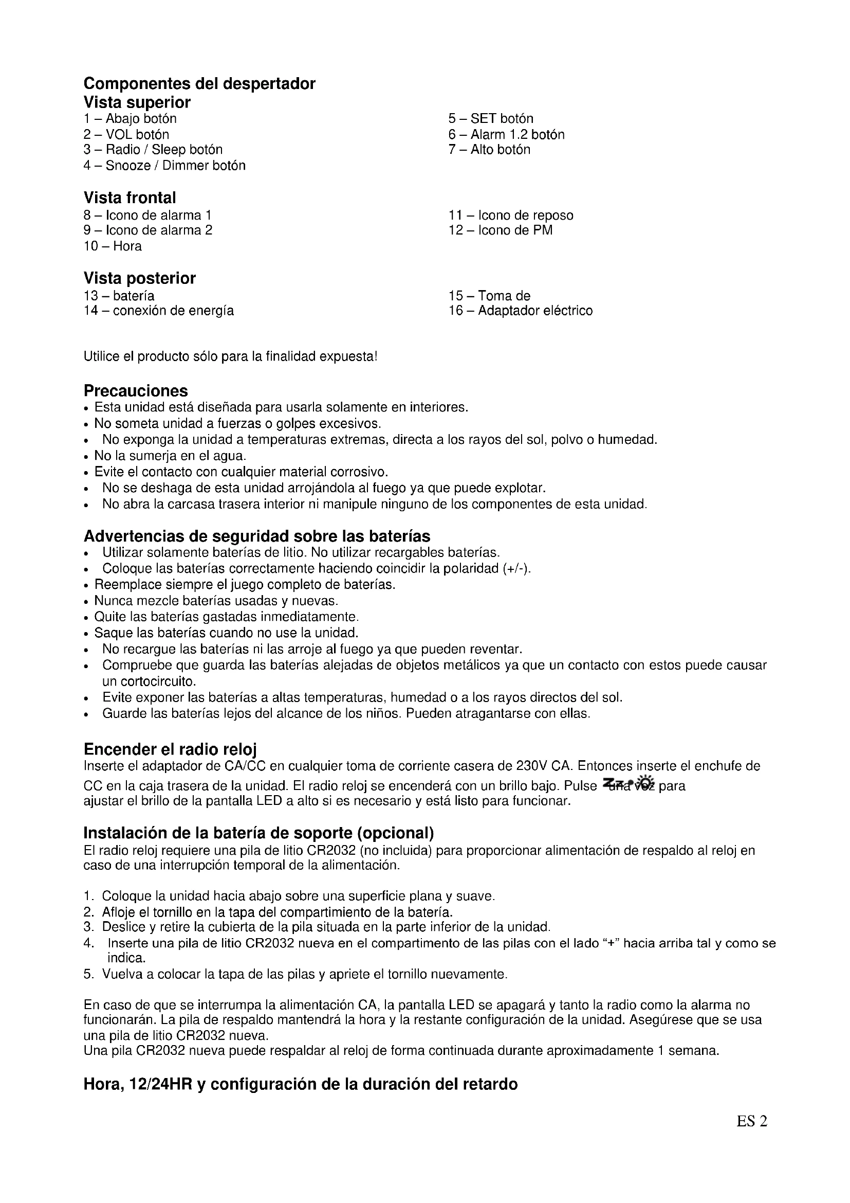 En caso de que se interrumpa la alimentación CA, la pantalla LED se apagará y tanto la radio como la alarma no funcionarán. La pila de respaldo mantendrá la hora y la restante configuración de la unidad. Asegúrese que se usa una pila de litio CR2032 nueva. Una pila CR2032 nueva puede respaldar al reloj de forma continuada durante aproximadamente 1 semana. Hora, 12/24HR y configuración de la duración del retardoES 3