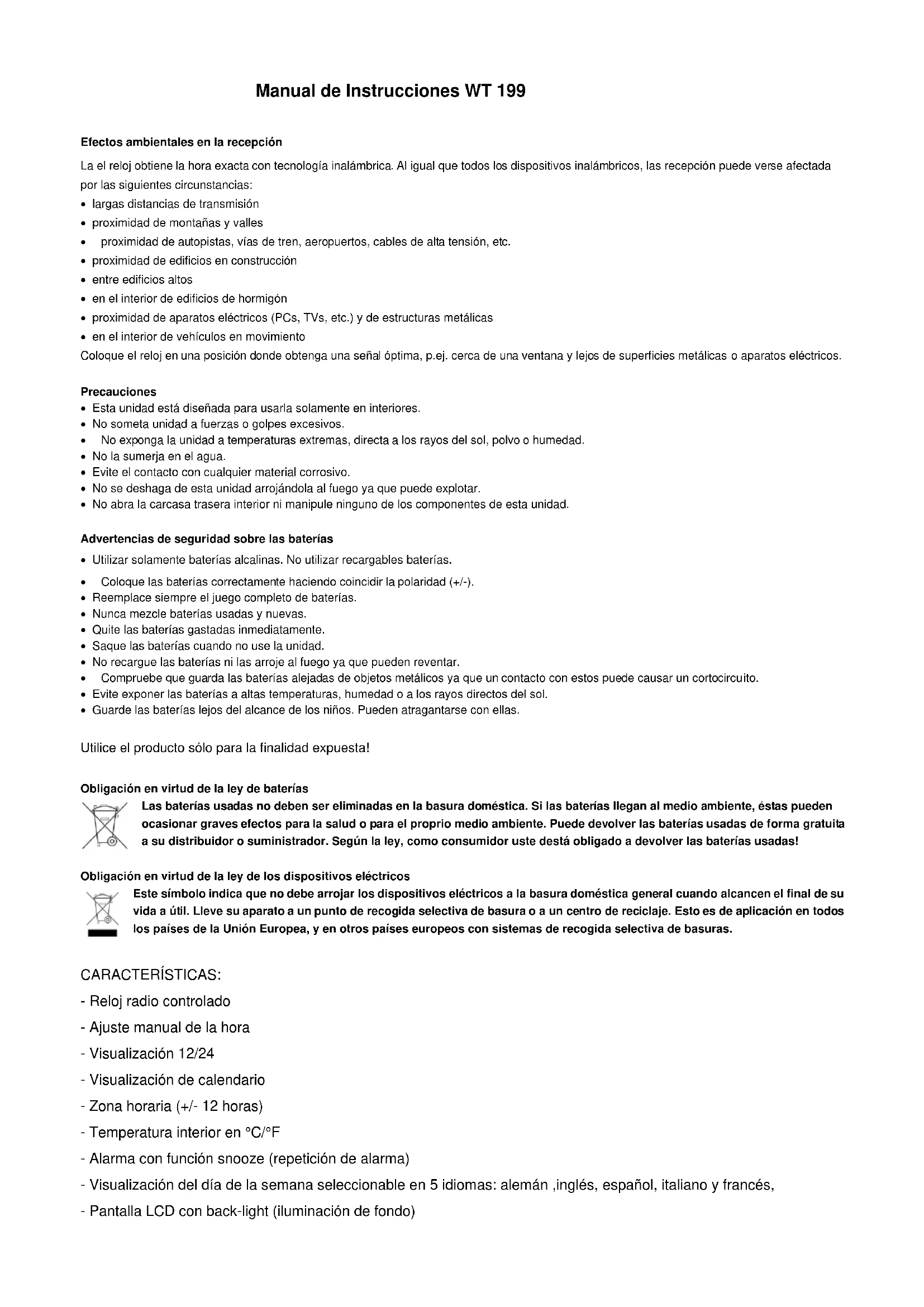 snooze. Pressez la touche ALARM ON/OFF une fois de plus, l'alarme en fonction sera désactivée.6. Pressez la touche TIME pour revenir à l'écran normal. FONCTION TOUCHES SNOOZE/LIGHT -Quand l'alarme snooze bipe, pressez la touche SNOOZE/LIGHT pour faire une pause de 5 minutes et la fonction snooze sera répétée. Pour stopper la fonction snooze, pressez une autre touche. -Pressez la touche SNOOZE/LIGHT pour illuminer l'écran LCD pendant 3 secondes. C/F Taste, WAVE - En temps normal, presses la touche C/F pour passer de Celsius à Fahrenheit. 12/24 Taste - Pressez la touche 12/24 pour passer en affichage 12h ou 24h WAVE Taste - Pressez et maintenir le bouton WAVE pendant 3 secondes pour activer le scan DCF. -Si le réveil est ne train de scanner le signal DFC, pressez la touché WAVE une fois pour désactiver la fonction scan DCF.Manual de Instrucciones WT 199 Efectos ambientales en la recepción La el reloj obtiene la hora exacta con tecnología inalámbrica. Al igual que todos los dispositivos inalámbricos, las recepción puede verse afectada por las siguientes circunstancias: largas distancias de transmisión proximidad de montañas y valles proximidad de autopistas, vías de tren, aeropuertos, cables de alta tensión, etc. proximidad de edificios en construcción entre edificios altos en el interior de edificios de hormigón proximidad de aparatos eléctricos (PCs, TVs, etc.) y de estructuras metálicas en el interior de vehículos en movimiento Coloque el reloj en una posición donde obtenga una señal óptima, p.ej. cerca de una ventana y lejos de superficies metálicas o aparatos eléctricos. Precauciones Esta unidad está diseñada para usarla solamente en interiores. No someta unidad a fuerzas o golpes excesivos. No exponga la unidad a temperaturas extremas, directa a los rayos del sol, polvo o humedad. No la sumerja en el agua. Evite el contacto con cualquier material corrosivo. No se deshaga de esta unidad arrojándola al fuego ya que puede explotar. No abra la carcasa trasera interior ni manipule ninguno de los componentes de esta unidad. Advertencias de seguridad sobre las baterías Utilizar solamente baterías alcalinas. No utilizar recargables baterías. Coloque las baterías correctamente haciendo coincidir la polaridad (+/-). Reemplace siempre el juego completo de baterías. Nunca mezcle baterías usadas y nuevas. Quite las baterías gastadas inmediatamente. Saque las baterías cuando no use la unidad. No recargue las baterías ni las arroje al fuego ya que pueden reventar. Compruebe que guarda las baterías alejadas de objetos metálicos ya que un contacto con estos puede causar un cortocircuito. Evite exponer las baterías a altas temperaturas, humedad o a los rayos directos del sol. Guarde las baterías lejos del alcance de los niños. Pueden atragantarse con ellas. Utilice el producto sólo para la finalidad expuesta! Obligación en virtud de la ley de baterías Las baterías usadas no deben ser eliminadas en la basura doméstica. Si las baterías llegan al medio ambiente, éstas pueden ocasionar graves efectos para la salud o para el proprio medio ambiente. Puede devolver las baterías usadas de forma gratuita a su distribuidor o suministrador. Según la ley, como consumidor uste destá obligado a devolver las baterías usadas! Obligación en virtud de la ley de los dispositivos eléctricos Este símbolo indica que no debe arrojar los dispositivos eléctricos a la basura doméstica general cuando alcancen el final de su vida a útil. Lleve su aparato a un punto de recogida selectiva de basura o a un centro de reciclaje. Esto es de aplicación en todos los países de la Unión Europea, y en otros países europeos con sistemas de recogida selectiva de basuras. CARACTERÍSTICAS: - Reloj radio controlado - Ajuste manual de la hora - Visualización 12/24 - Visualización de calendario - Zona horaria (+/- 12 horas) - Temperatura interior en °C/°F - Alarma con función snooze (repetición de alarma) - Visualización del día de la semana seleccionable en 5 idiomas: alemán ,inglés, español, italiano y francés, - Pantalla LCD con back-light (iluminación de fondo)DECLARACIÓN CLAVE: Time Alarm 12/24 °C/°F / Wave Alarm On/Off