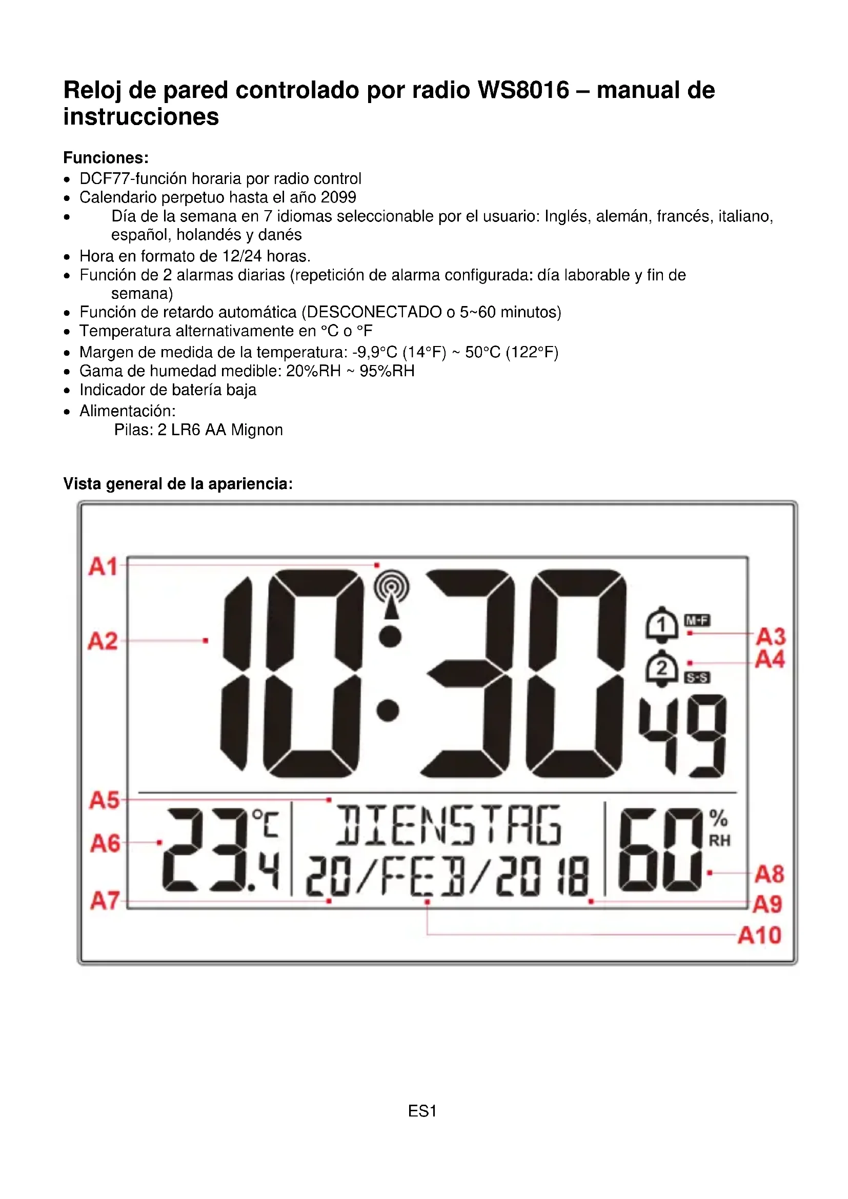 Séparez le carton d’emballage de tout sous carton éventuel en plastique. Tout bien trier conformément aux règlementations en matière de séparation des déchets.ES1 Reloj de pared controlado por radio WS8016 – manual de instrucciones Funciones: DCF77-función horaria por radio control Calendario perpetuo hasta el año 2099 Día de la semana en 7 idiomas seleccionable por el usuario: Inglés, alemán, francés, italiano, español, holandés y danés Hora en formato de 12/24 horas. Función de 2 alarmas diarias (repetición de alarma configurada: día laborable y fin de semana) Función de retardo automática (DESCONECTADO o 5~60 minutos) Temperatura alternativamente en °C o °F Margen de medida de la temperatura: -9,9°C (14°F) ~ 50°C (122°F) Gama de humedad medible: 20%RH ~ 95%RH Indicador de batería baja Alimentación: Pilas: 2 LR6 AA Mignon