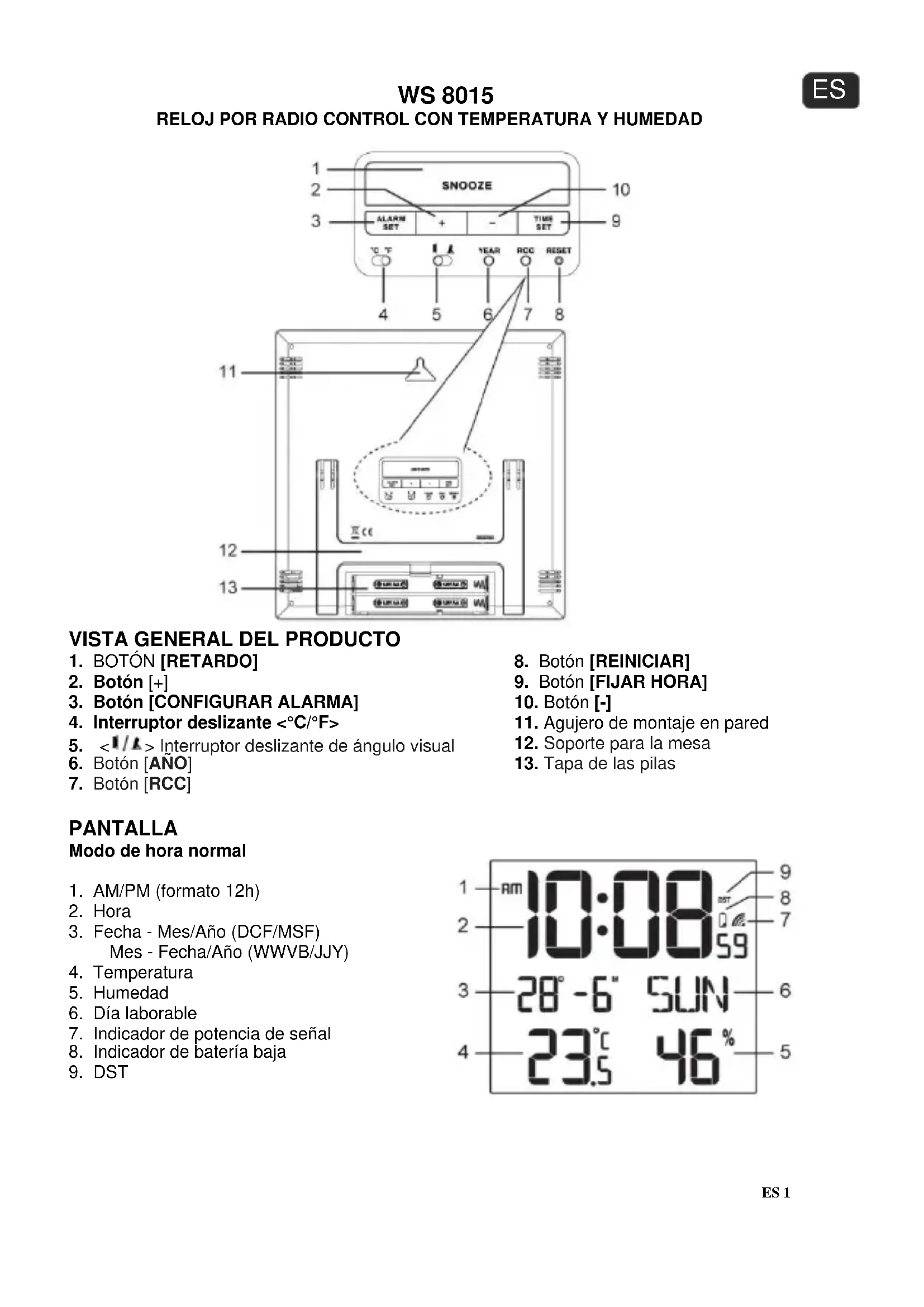 224 x 224 x 23 mm Precauciones Esta unidad está diseñada para usarla solamente en interiores. No someta unidad a fuerzas o golpes excesivos. No exponga la unidad a temperaturas extremas, directa a los rayos del sol, polvo o humedad. No la sumerja en el agua. Evite el contacto con cualquier material corrosivo. No se deshaga de esta unidad arrojándola al fuego ya que puede explotar. No abra la carcasa trasera interior ni manipule ninguno de los componentes de esta unidad. Advertencias de seguridad sobre las baterías Utilizar solamente baterías pila de botón. No utilizar recargables baterías. Coloque las baterías correctamente haciendo coincidir la polaridad (+/-). Reemplace siempre el juego completo de baterías. Nunca mezcle baterías usadas y nuevas. Quite las baterías gastadas inmediatamente. Saque las baterías cuando no use la unidad. No recargue las baterías ni las arroje al fuego ya que pueden reventar. Compruebe que guarda las baterías alejadas de objetos metálicos ya que un contacto con estos puede causar un cortocircuito. Evite exponer las baterías a altas temperaturas, humedad o a los rayos directos del sol. Guarde las baterías lejos del alcance de los niños. Pueden atragantarse con ellas.ES 6 Obligación en virtud de la ley de baterías Las baterías usadas no deben ser eliminadas en la basura doméstica. Si las baterías llegan al medio ambiente, éstas pueden ocasionar graves efectos para la salud o para el proprio medio ambiente. Puede devolver las baterías usadas de forma gratuita a su distribuidor o suministrador. Según la ley, como consumidor uste destá obligado a devolver las baterías usadas! Obligación en virtud de la ley de los dispositivos eléctricos Este símbolo indica que no debe arrojar los dispositivos eléctricos a la basura doméstica general cuando alcancen el final de su vida a útil. Lleve su aparato a un punto de recogida selectiva de basura o a un centro de reciclaje. Esto es de aplicación en todos los países de la Unión Europea, y en otros países europeos con sistemas de recogida selectiva de basuras.NL 1 WS 8015