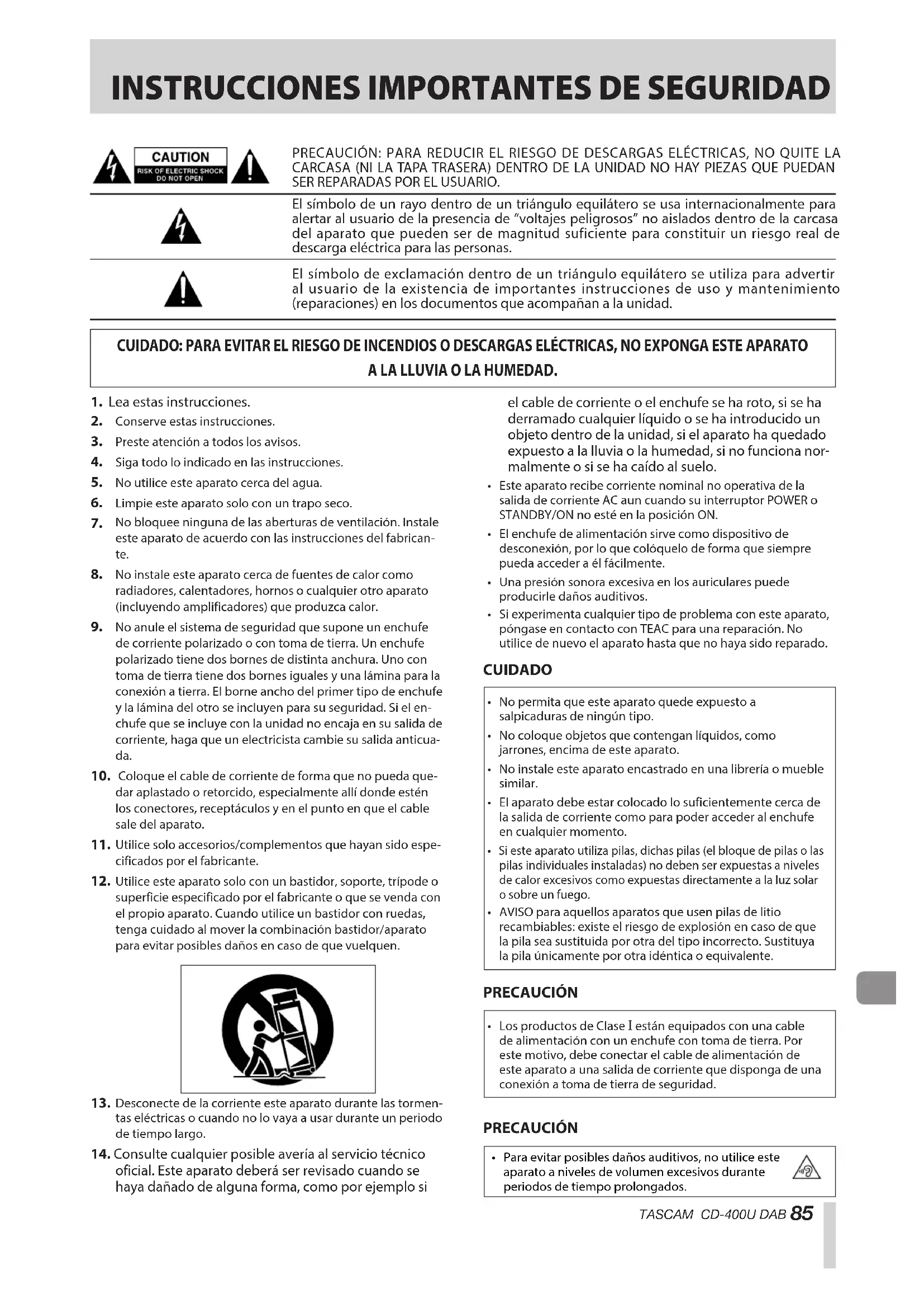 Además también encontrará información adicional en los siguientes formatos. AVISO Son avisos y consejos relativos al uso de este aparato. NOTA Son explicaciones sobre actuaciones para casos concretos. CUIDADO Esto le advierte que puede dañar el equipo o perder datos si no sigue las instrucciones.TASCAM CD-400U DAB