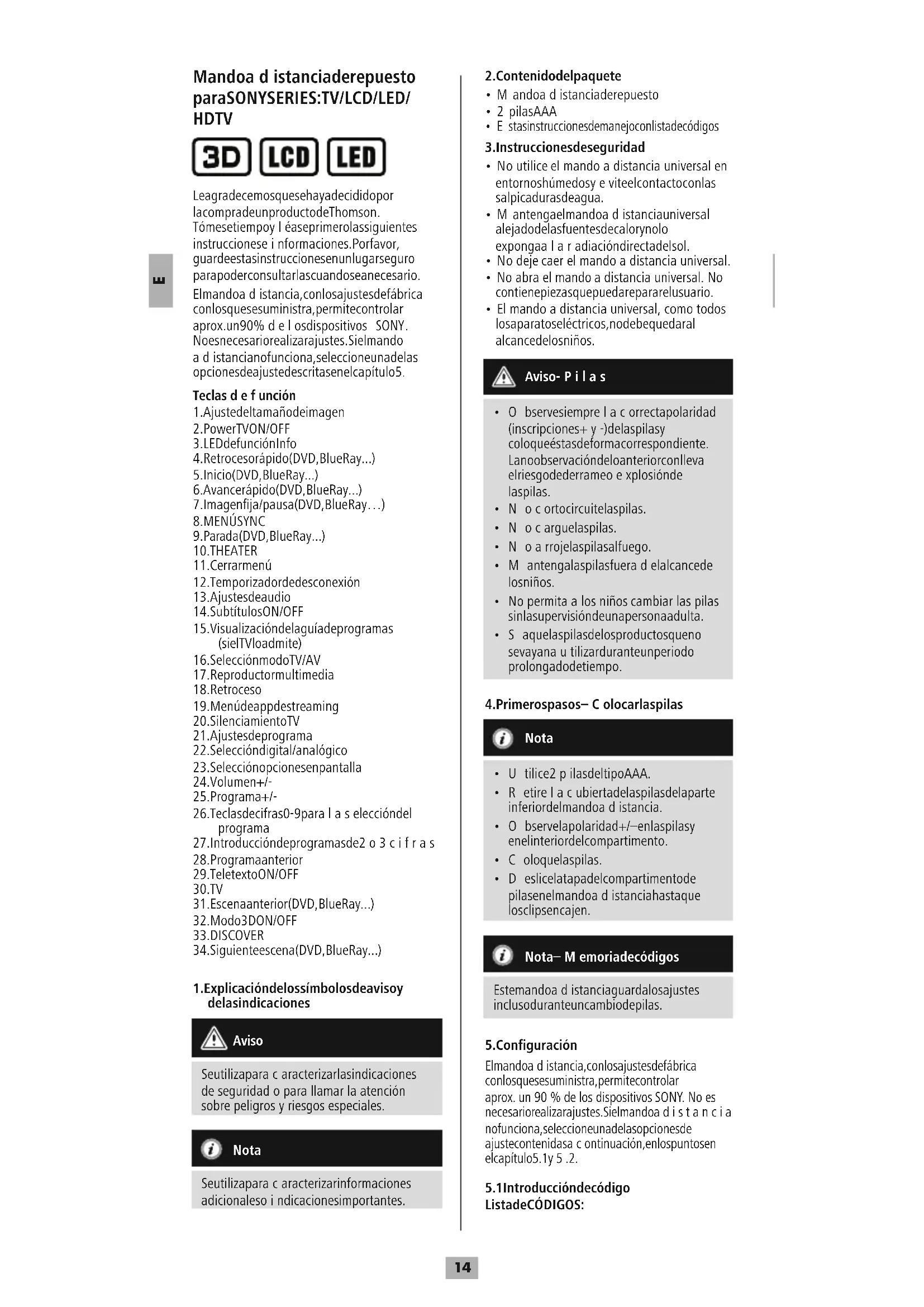Mando adistancia de repuesto para SONY SERIES: TV/LCD/LED/ HDTV Le agradecemos que se haya decidido por la compra de un producto de Thomson. Tómese tiempo yléase primero las siguientes instrucciones einformaciones. Por favor, guarde estas instrucciones en un lugar seguro para poder consultarlas cuando sea necesario. El mando adistancia, con los ajustes de fábrica con los que se suministra, permite controlar aprox. un 90 %delos dispositivos SONY