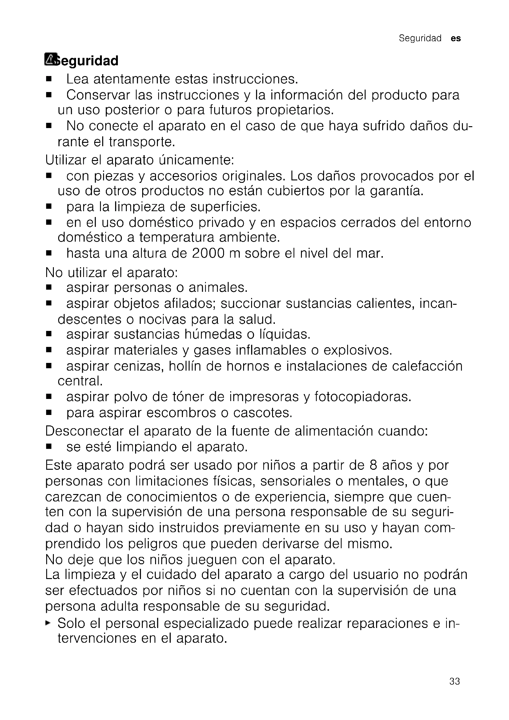 Verwijder de verstopping. Borstel van het turbom- ondstuk draait niet. Borstelrol is verontreinigd. Reinig de borstelrol. Zuigvermogen is te gering. Draai de vermogensregelaar op het maximale zuigvermo- gen. Afvoeren van uw oude apparaatAfvoeren van uw oude appa- raat Voer het apparaat milieuvriendelijk af. Bij uw dealer en uw gemeente- of deel- raadskantoor kunt u informatie verkrijgen over de actuele afvoermethoden. Dit apparaat is gekenmerkt in overeenstemming met de Eu- ropese richtlijn 2012/19/EU betreffende afgedankte elek- trische en elektronische appa- ratuur (waste electrical and electronic equipment - WEEE). De richtlijn geeft het kader aan voor de in de EU geldige terugneming en verwerking van oude apparaten. ServicedienstServicedienst Gedetailleerde informatie over de garantie- duur en de garantievoorwaarden in uw land ontvangt u via de QR-code op het meegele- verde document over de servicecontacten en garantievoorwaarden, bij onze klanten- service, uw dealer of op onze website. De contactgegevens van de klantenservice vindt u via de QR-code op het meegelever- de document over de servicecontacten en garantievoorwaarden of op onze website. 31nl Servicedienst De informatie conform verordening (EU) 2023/826 vindt u online op www.bosch- home.com op de productpagina en de servicepagina van uw apparaat bij de ge- bruiksaanwijzingen en aanvullende docu- menten. 32Seguridad es Seguridad Seguridad ¡ Lea atentamente estas instrucciones. ¡ Conservar las instrucciones y la información del producto para un uso posterior o para futuros propietarios. ¡ No conecte el aparato en el caso de que haya sufrido daños du- rante el transporte. Utilizar el aparato únicamente: ¡ con piezas y accesorios originales. Los daños provocados por el uso de otros productos no están cubiertos por la garantía. ¡ para la limpieza de superficies. ¡ en el uso doméstico privado y en espacios cerrados del entorno doméstico a temperatura ambiente. ¡ hasta una altura de 2000msobre el nivel del mar. No utilizar el aparato: ¡ aspirar personas o animales. ¡ aspirar objetos afilados; succionar sustancias calientes, incan- descentes o nocivas para la salud. ¡ aspirar sustancias húmedas o líquidas. ¡ aspirar materiales y gases inflamables o explosivos. ¡ aspirar cenizas, hollín de hornos e instalaciones de calefacción central. ¡ aspirar polvo de tóner de impresoras y fotocopiadoras. ¡ para aspirar escombros o cascotes. Desconectar el aparato de la fuente de alimentación cuando: ¡ se esté limpiando el aparato. Este aparato podrá ser usado por niños a partir de 8 años y por personas con limitaciones físicas, sensoriales o mentales, o que carezcan de conocimientos o de experiencia, siempre que cuen- ten con la supervisión de una persona responsable de su seguri- dad o hayan sido instruidos previamente en su uso y hayan com- prendido los peligros que pueden derivarse del mismo. No deje que los niños jueguen con el aparato. La limpieza y el cuidado del aparato a cargo del usuario no podrán ser efectuados por niños si no cuentan con la supervisión de una persona adulta responsable de su seguridad. Solo el personal especializado puede realizar reparaciones e in- tervenciones en el aparato. 33es Seguridad Utilizar únicamente piezas de repuesto originales para la repara- ción del aparato. Si el cable de conexión de red de este aparato resulta dañado, debe sustituirlo el fabricante, el Servicio de Asistencia Técnica o una persona cualificada a fin de evitar posibles situaciones de peligro. No ponga nunca en funcionamiento un aparato dañado. No hacer funcionar nunca un aparato con una superficie agrieta- da o rota. No tirar nunca del cable de conexión a la red eléctrica para de- senchufar el aparato. Desenchufar siempre el cable de conexión de red de la toma de corriente. No tirar nunca del cable de conexión a la red eléctrica ni trans- portar el aparato tirando de él. Si el aparato o el cable de conexión de red están dañados, de- senchufar inmediatamente el cable de conexión de red o desco- nectar el interruptor automático del cuadro eléctrico. Llame al Servicio de Asistencia Técnica.