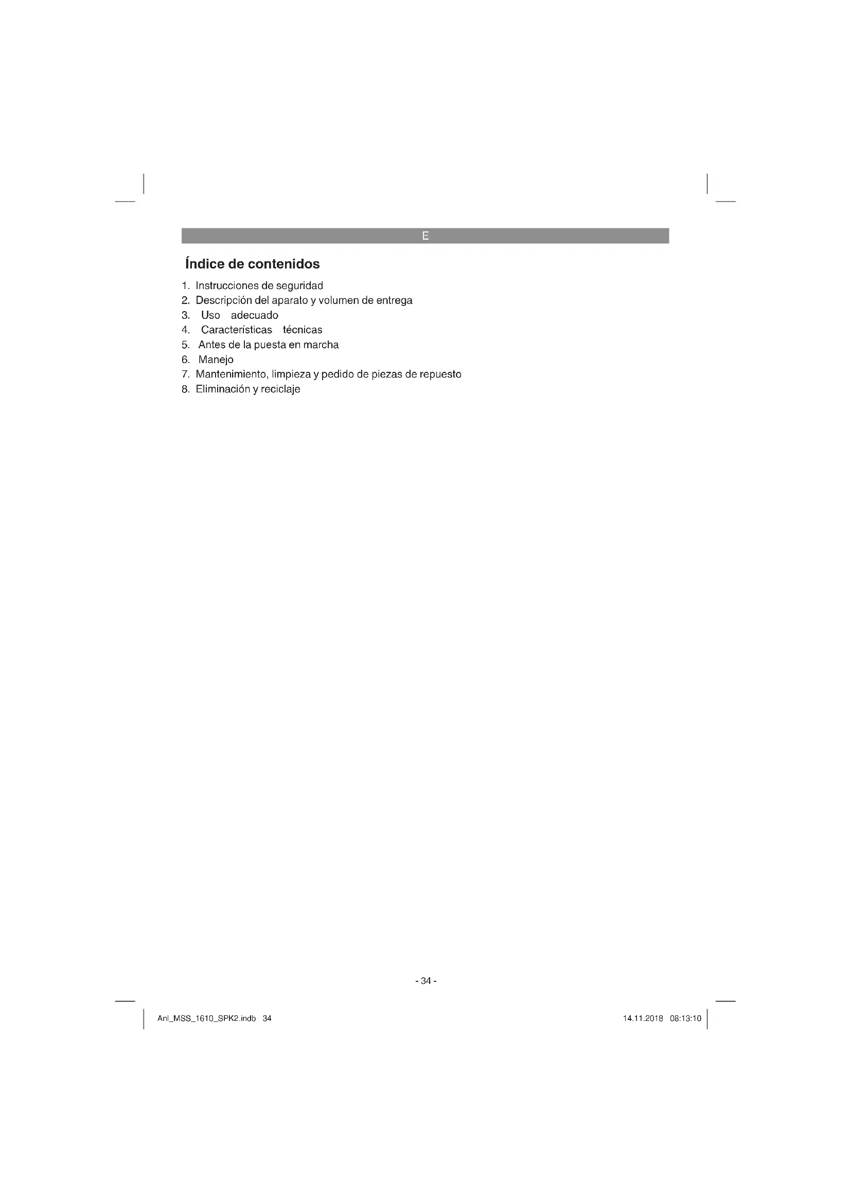 El aparato está protegido por un embalaje para evitar daños producidos por el transporte. Este embalaje es materia prima y, por eso, se puede volver a utilizar o llevar a un punto de reciclaje. El aparato y sus accesorios están compuestos de diversos materiales, como, p. ej., metal y plástico. Los aparatos defectuosos no deben tirarse a la basura doméstica. Para su eliminación adecu- ada, el aparato debe entregarse a una entidad recolectora prevista para ello. En caso de no conocer ninguna, será preciso informarse en el organismo responsable del municipio. Sólo está permitido copiar la documentación y documentos anexos del producto, o extractos de los mismos, con autorización expresa de iSC GmbH. Nos reservamos el derecho a realizar modifi caciones técnicas Anl_MSS_1610_SPK2.indb 38Anl_MSS_1610_SPK2.indb 38 14.11.2018 08:13:1014.11.2018 08:13:10E
