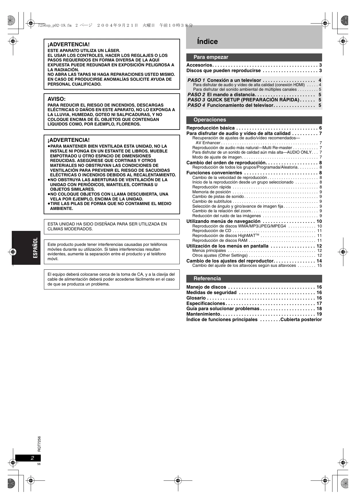 - Mantenimiento Índice de funciones principales Cubierta posterior 7256sp_p02-19.fm 3 ページ 2004年9月21日 p. 19