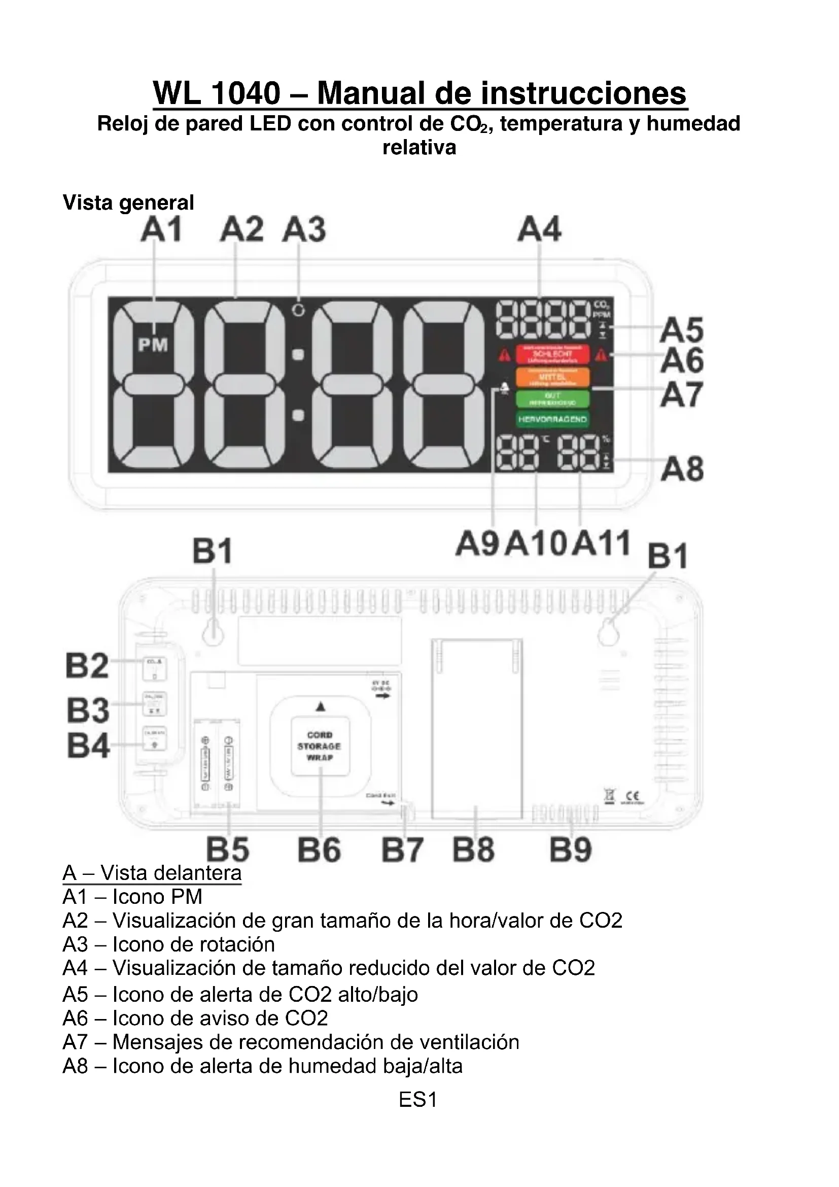 , temperatura y humedad relativa Vista general A – Vista delantera A1 – Icono PM A2 – Visualización de gran tamaño de la hora/valor de CO2 A3 – Icono de rotación A4 – Visualización de tamaño reducido del valor de CO2 A5 – Icono de alerta de CO2 alto/bajo A6 – Icono de aviso de CO2 A7 – Mensajes de recomendación de ventilación A8 – Icono de alerta de humedad baja/altaES2 A9 – Icono de la alerta sonora de CO2 A10 – Temperatura interior A11 – Humedad interior B – Vista posterior B1 – Agujeros para la instalación B2 – Botón +(más) B3 – Botón SET B4 – Botón -(menos) B5 – Compartimento de las pilas B6 – Envoltorio de almacenamiento del cable del adaptador de corriente B7 – Salida del cable del adaptador de corriente B8 – Soporte B9 – Ventilación del sensor de CO2 Funciones principales