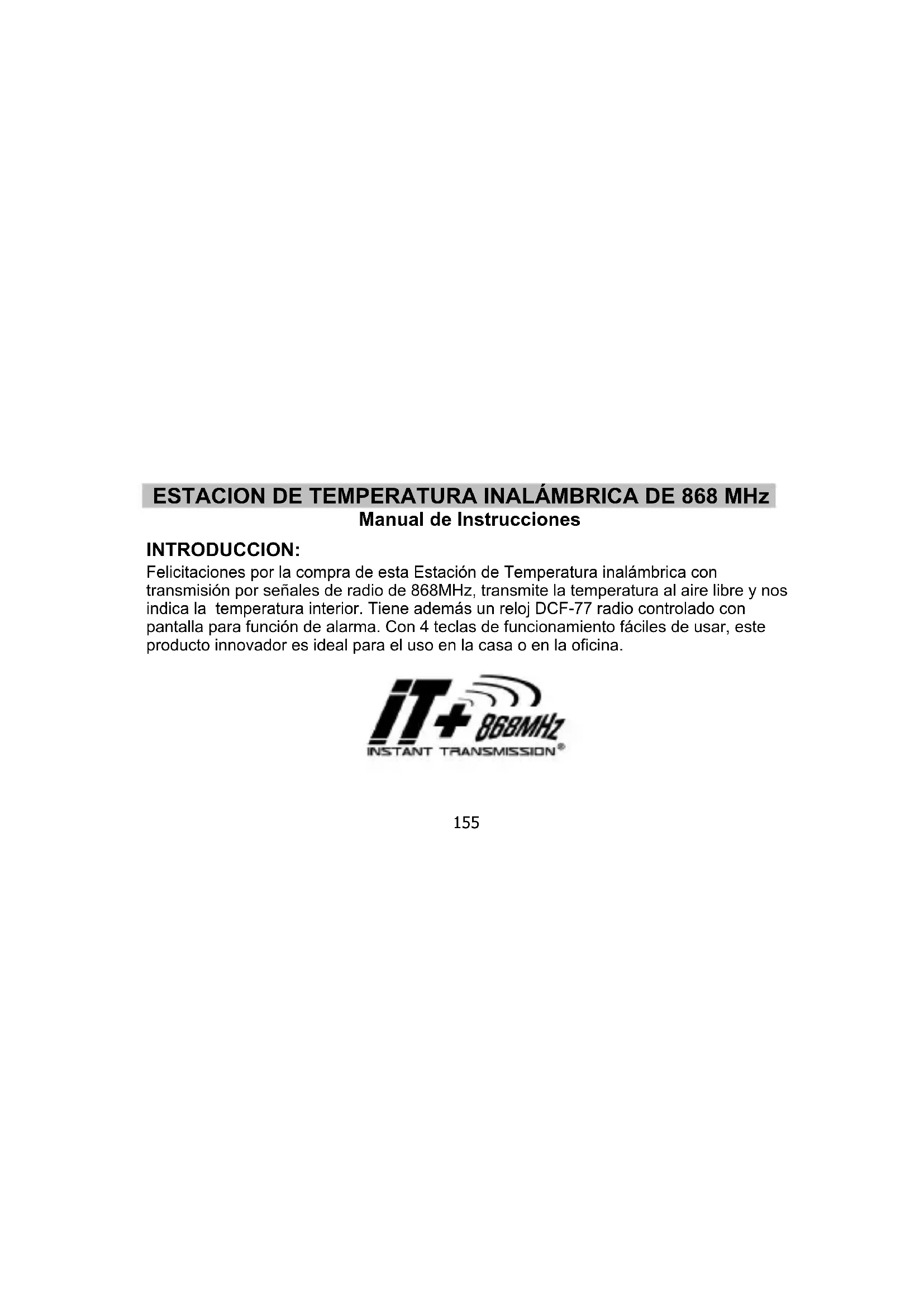 Manual de Instrucciones INTRODUCCION: Felicitaciones por la compra de esta Estación de Temperatura inalámbrica con transmisión por señales de radio de 868MHz, transmite la temperatura al aire libre y nos indica la temperatura interior. Tiene además un reloj DCF-77 radio controlado con pantalla para función de alarma. Con 4 teclas de funcionamiento fáciles de usar, este producto innovador es ideal para el uso en la casa o en la oficina.156