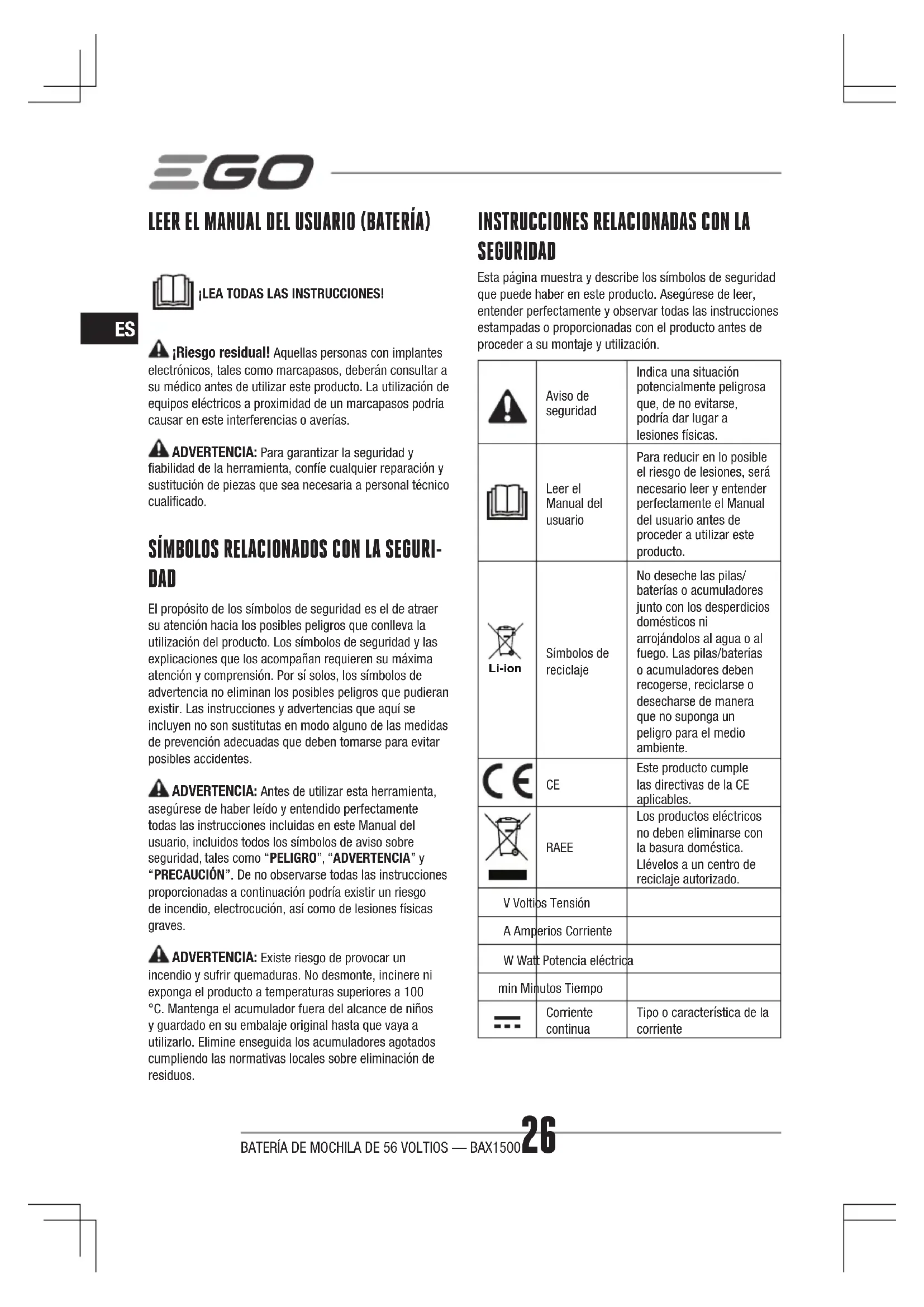Este producto cumple las directivas de la CE aplicables. RAEE Los productos eléctricos no deben eliminarse con la basura doméstica. Llévelos a un centro de reciclaje autorizado. V Voltios Tensión A Amperios Corriente W Watt Potencia eléctrica min Minutos Tiempo Corriente continua Tipo o característica de la corrienteBATERÍA DE MOCHILA DE 56 VOLTIOS — BAX1500 27