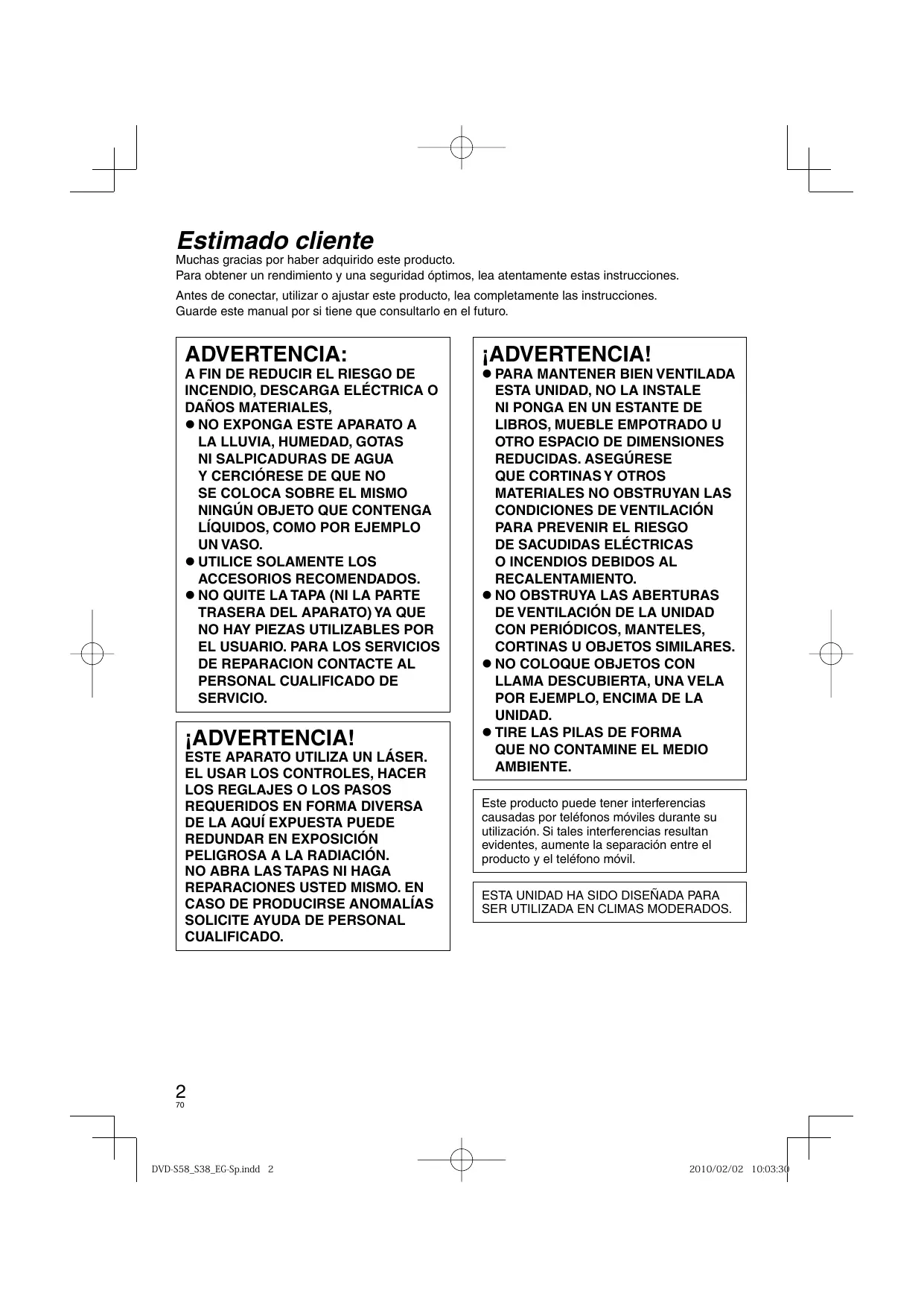 - Esta unidad es compatible con la función “HDMI CEC”. Especificación LÁSER Producto LÄSER Clase I: Longitud de onda: 770 a 800 nm (CD)/645 a 660 nm (DVD) Alimentación: CA 230 V, 50 Hz Consumo de energía: aprox. 10 W Consumo de energía en el modo de espera: menos de 1 W Dimensiones (Ancho x Largo x Alto) [DVD-S58]:430 mm x 209 mm x 38 mm [DVD-S38]: 360 mm x 209 mm x 38 mm Peso: [DVD-S58] aprox. 1,8 kg [DVD-S38] aprox. 1,6 kg