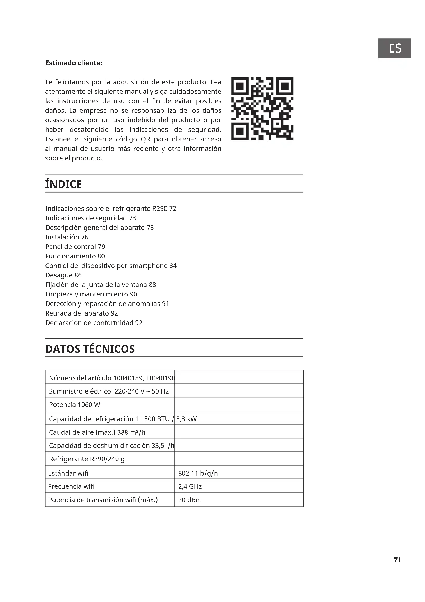 Estimado cliente: Le felicitamos por la adquisición de este producto. Lea atentamente el siguiente manual y siga cuidadosamente las instrucciones de uso con el n de evitar posibles daños. La empresa no se responsabiliza de los daños ocasionados por un uso indebido del producto o por haber desatendido las indicaciones de seguridad. Escanee el siguiente código QR para obtener acceso al manual de usuario más reciente y otra información sobre el producto. ÍNDICE Indicaciones sobre el refrigerante R290 72 Indicaciones de seguridad 73 Descripción general del aparato 75 Instalación 76 Panel de control 79 Funcionamiento 80 Control del dispositivo por smartphone 84 Desagüe 86 Fijación de la junta de la ventana 88 Limpieza y mantenimiento 90 Detección y reparación de anomalías 91 Retirada del aparato 92 Declaración de conformidad 92