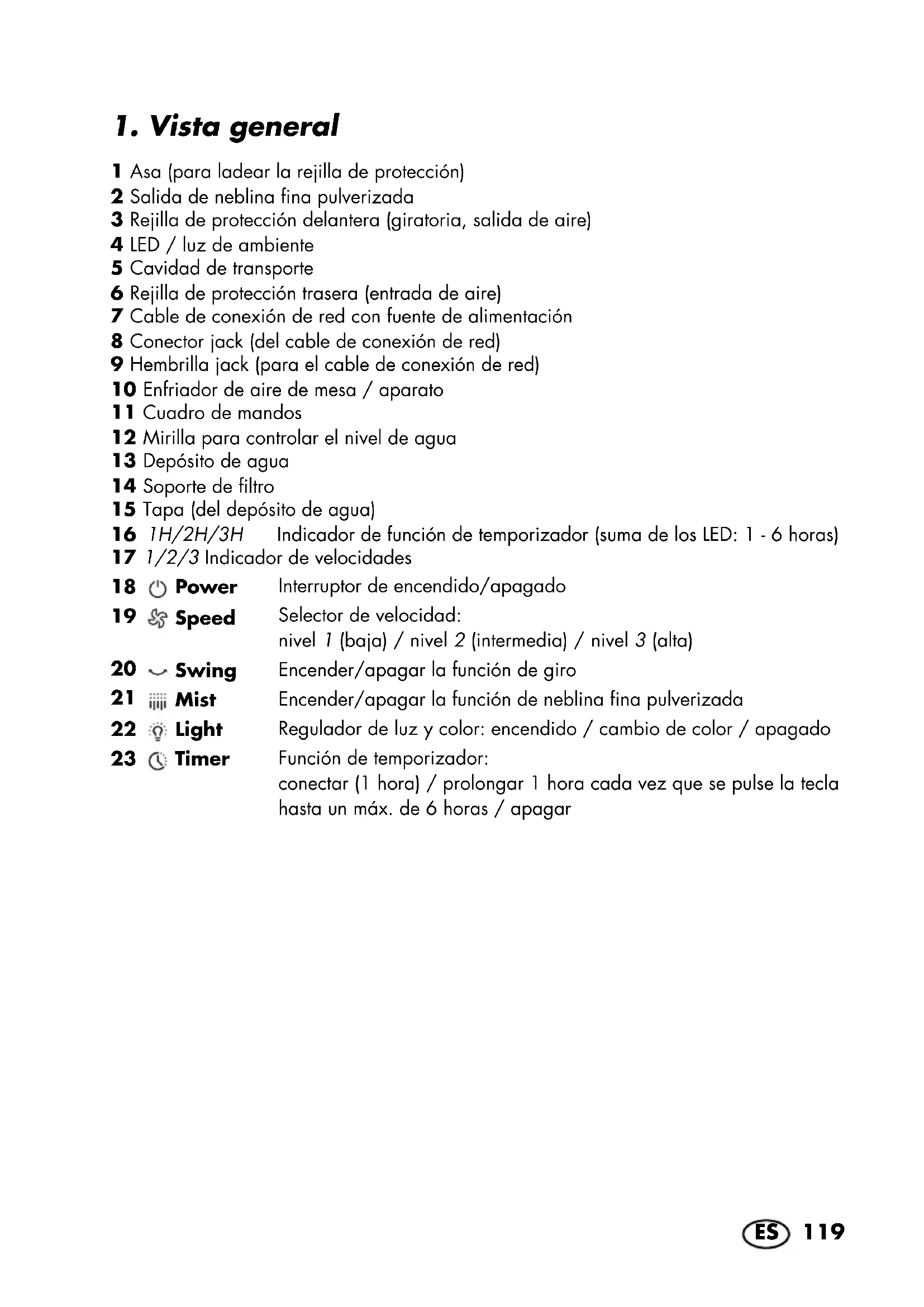 1 Asa (para ladear la rejilla de protección) 2 Salida de neblina fina pulverizada 3 Rejilla de protección delantera (giratoria, salida de aire) 4 LED / luz de ambiente 5 Cavidad de transporte 6 Rejilla de protección trasera (entrada de aire) 7 Cable de conexión de red con fuente de alimentación 8 Conector jack (del cable de conexión de red) 9 Hembrilla jack (para el cable de conexión de red) 10 Enfriador de aire de mesa / aparato 11 Cuadro de mandos 12 Mirilla para controlar el nivel de agua 13 Depósito de agua 14 Soporte de filtro 15 Tapa (del depósito de agua) 16 1H/2H/3H Indicador de función de temporizador (suma de los LED: 1 - 6 horas) 17 1/2/3 Indicador de velocidades