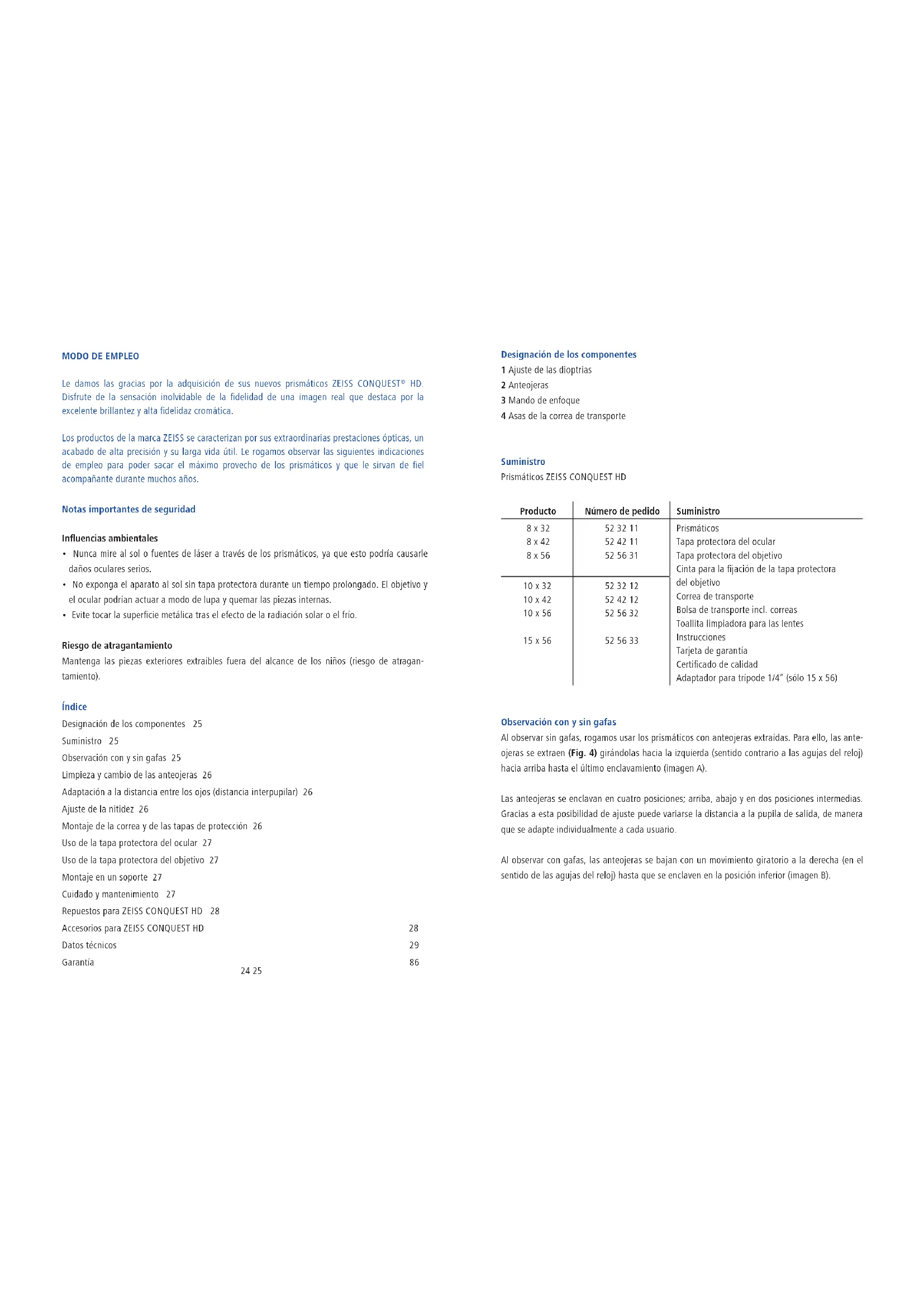 HD. Disfrute de la sensación inolvidable de la fidelidad de una imagen real que destaca por la excelente brillantez y alta fidelidaz cromática. Los productos de la marca ZEISS se caracterizan por sus extraordinarias prestaciones ópticas, un acabado de alta precisión y su larga vida útil. Le rogamos observar las siguientes indicaciones de empleo para poder sacar el máximo provecho de los prismáticos y que le sirvan de fiel acompañante durante muchos años. Notas importantes de seguridad Influencias ambientales Nunca mire al sol o fuentes de láser a través de los prismáticos, ya que esto podría causarle daños oculares serios. No exponga el aparato al sol sin tapa protectora durante un tiempo prolongado. El objetivo y el ocular podrían actuar a modo de lupa y quemar las piezas internas. Evite tocar la superficie metálica tras el efecto de la radiación solar o el frío. Riesgo de atragantamiento Mantenga las piezas exteriores extraíbles fuera del alcance de los niños (riesgo de atragan- tamiento). Índice Designación de los componentes 25 Suministro 25 Observación con y sin gafas 25 Limpieza y cambio de las anteojeras 26 Adaptación a la distancia entre los ojos (distancia interpupilar) 26 Ajuste de la nitidez 26 Montaje de la correa y de las tapas de protección 26 Uso de la tapa protectora del ocular 27 Uso de la tapa protectora del objetivo 27 Montaje en un soporte 27 Cuidado y mantenimiento 27 Repuestos para ZEISS CONQUEST HD 28 Accesorios para ZEISS CONQUEST HD 28 Datos técnicos 29 Garantía 86 Designación de los componentes 1 Ajuste de las dioptrias 2 Anteojeras 3 Mando de enfoque 4 Asas de la correa de transporte Suministro Prismáticos ZEISS CONQUEST HD Producto Número de pedido Suministro 8 x 32 8 x 42 8 x 56