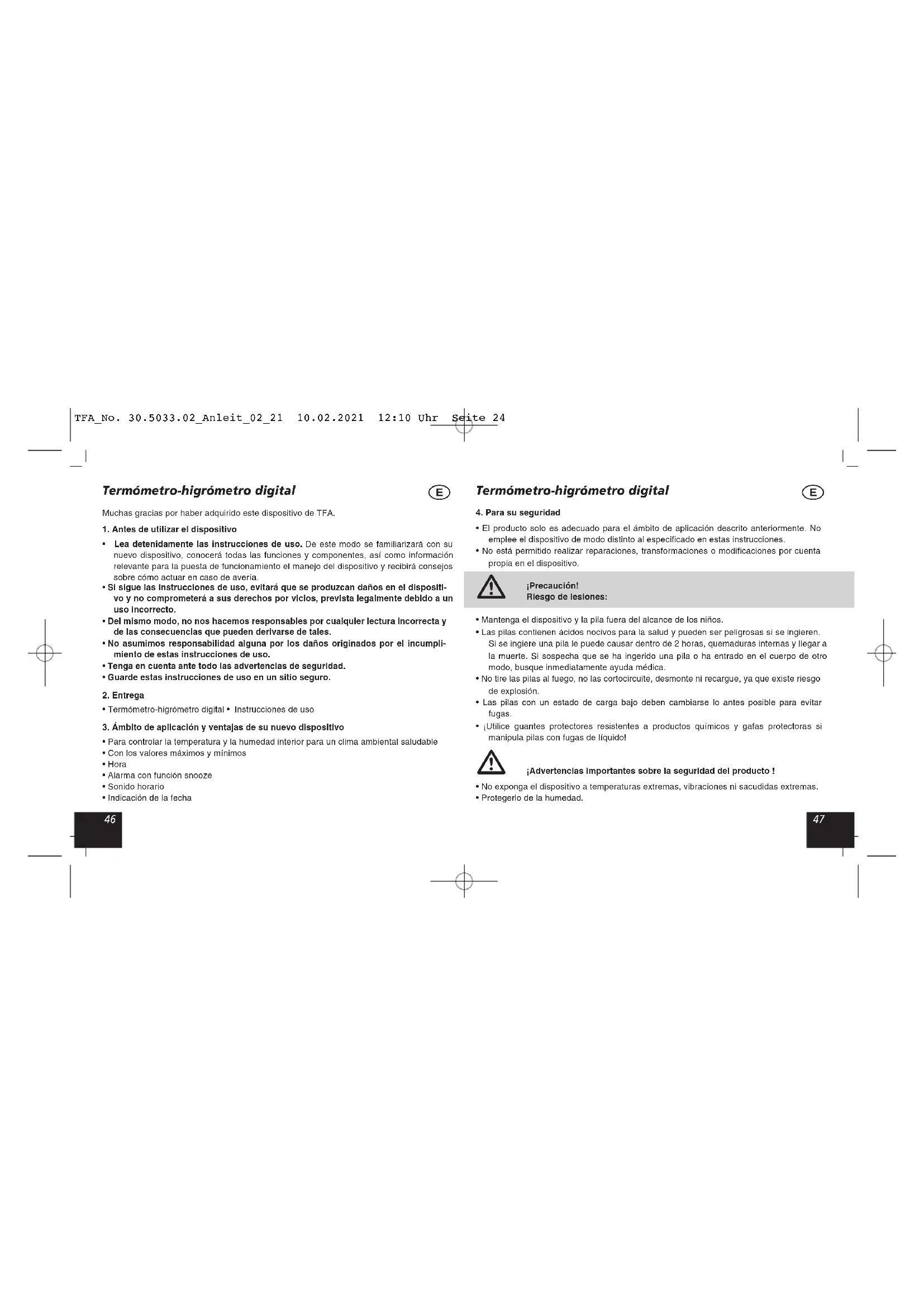 - Limpie el dispositivo con un paño suave, ligeramente humedecido. ¡No utilice medio abrasivo ni disolventes! TFA_No. 30.5033.02_Anleit_02_21 10.02.2021 12:10 Uhr Seite 265352 Termómetro-higrómetro digital
