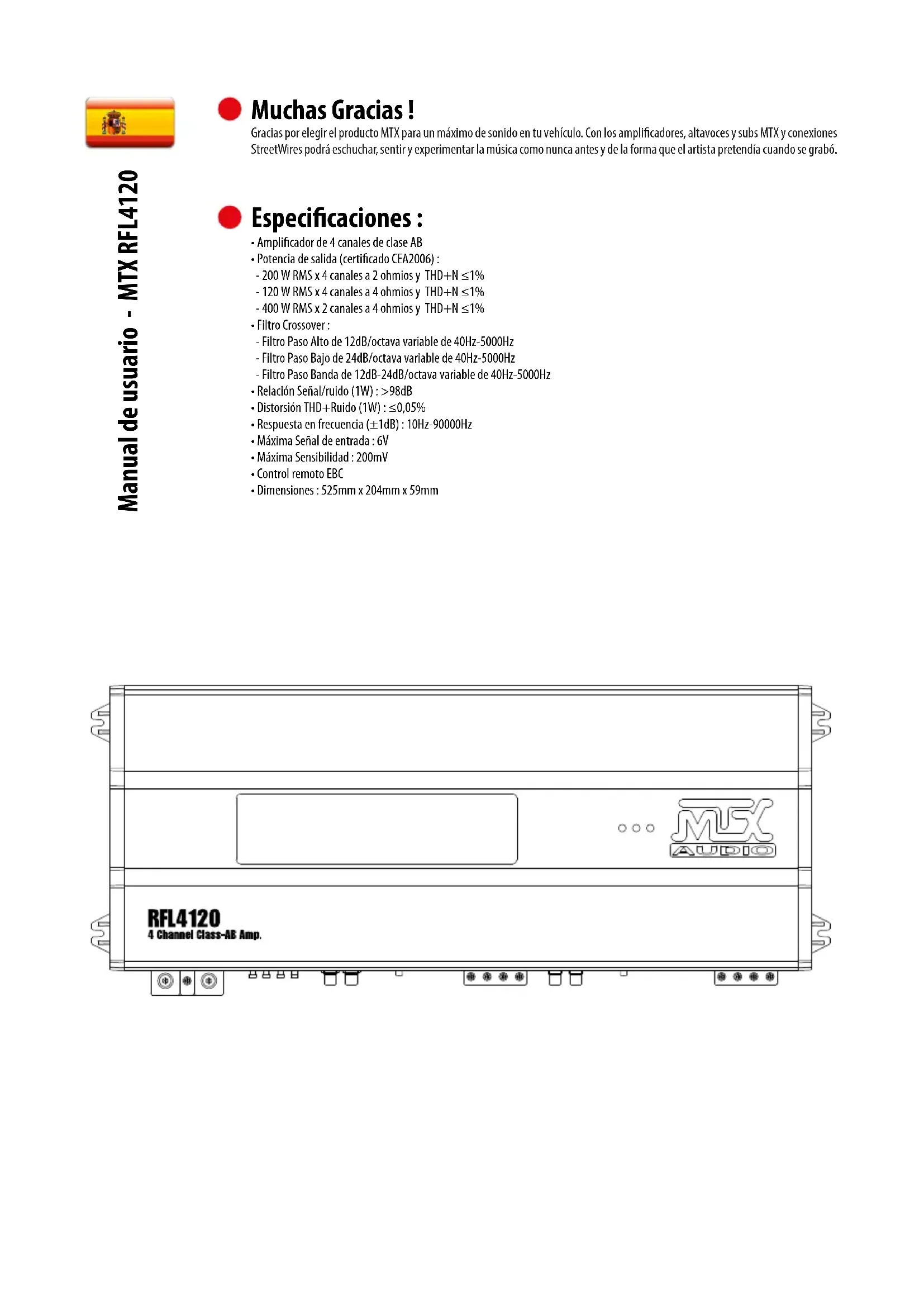 Manual de usuario - MTX RFL4120 Muchas Gracias ! Gracias por elegir el producto MTX para un máximo de sonido en tu vehículo. Con los amplificadores, altavoces y subs MTX y conexiones StreetWires podrá eschuchar, sentir y experimentar la música como nunca antes y de la forma que el artista pretendía cuando se grabó. Especificaciones :