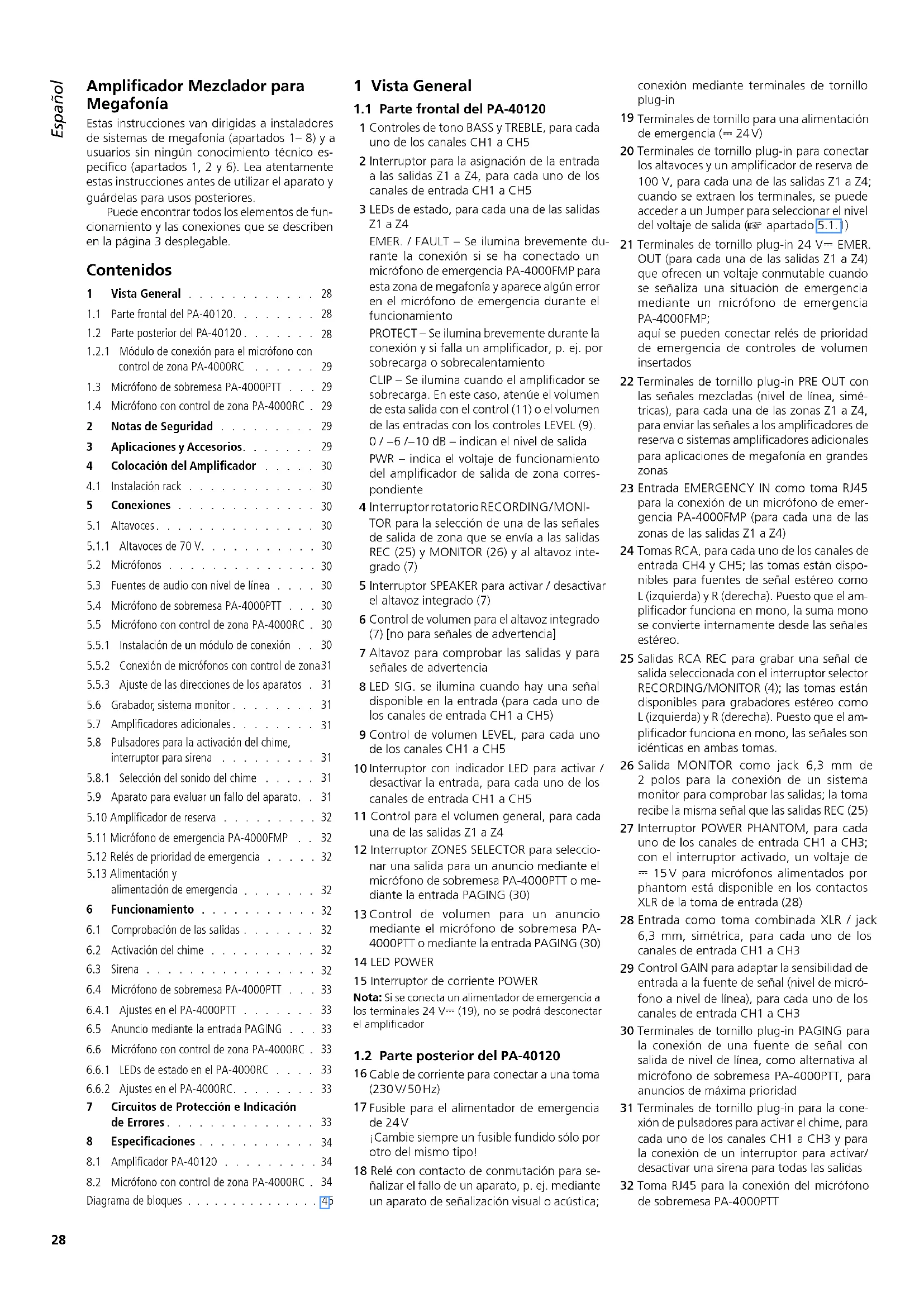 apartado 5.8.1) PRIORITY – En la posición ON, el PA-4000RC toma prioridad sobre los demás micrófonos sin esta función activada y puede interrumpir sus anuncios COMPRESSION – En la posición ON, la potencia dinámica de la señal de micrófono se ate- núa y por lo tanto se reducen las distorsiones cuando hable con un volumen elevado 7 Circuitos de Protección e Indicación deErrores Los amplificadores de salida del PA-40120 están equipados con circuitos de protección contra sobrecarga y sobrecalentamiento para prevenir daños en los altavoces y en el amplificador. Si un amplificador de salida falla así, los altavoces de 100 V pasan mediante un relé a un amplifica- dor de reserva conectado (