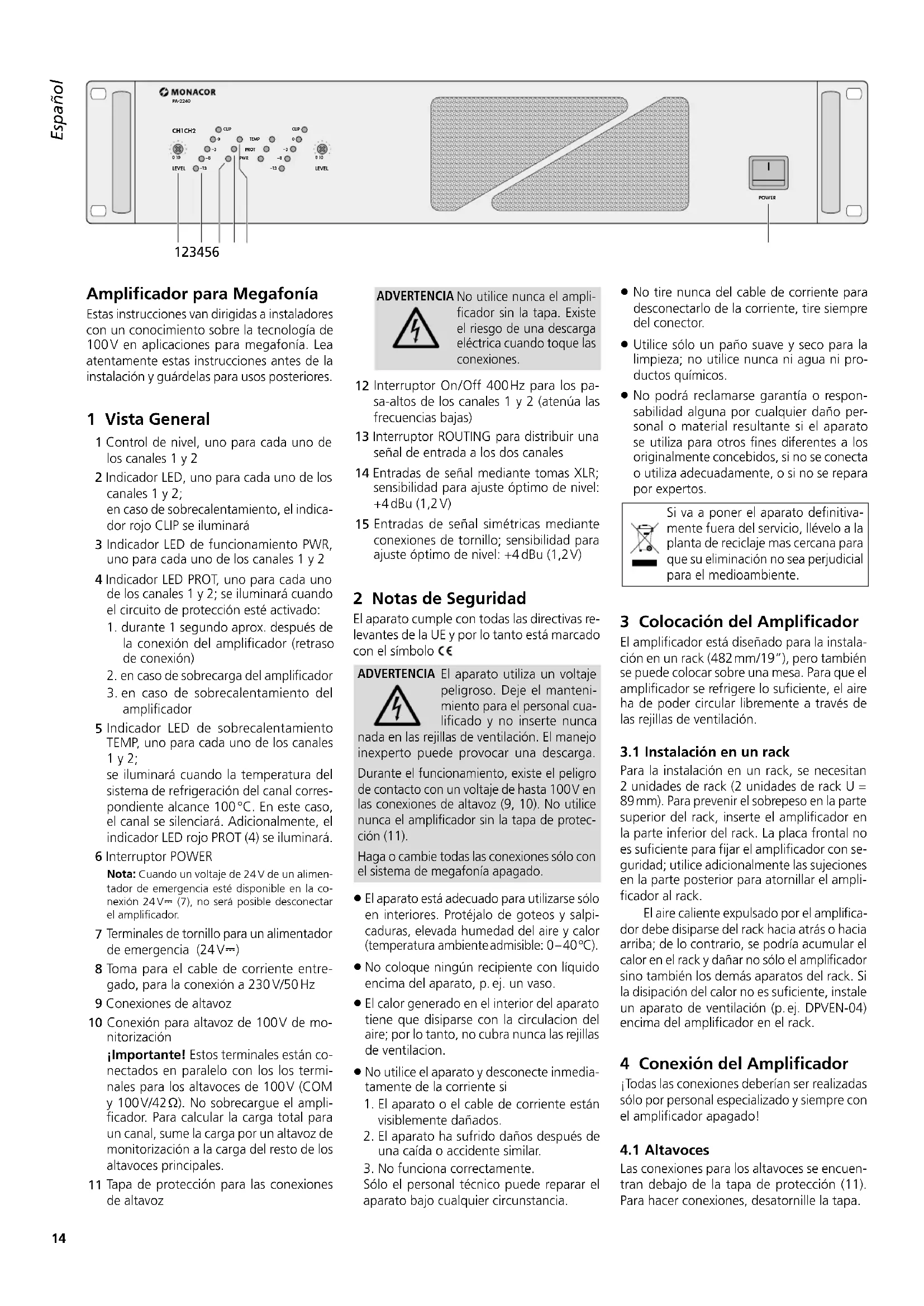 ficador; adicionalmente, el indicador LED TEMP (5) se iluminará Si uno de los indicadores LED PROT se ilumina durante el funcionamiento o si no se apaga después de la conexión del amplificador, des- conecte el amplificador y elimine el problema. 7 Especificaciones Potencia de salida RMS: 2 × 240 W THD: < 1 % Salidas de altavoz: 100 V, 70 V, 25 V o 8 Ω Impedancia de salida 100 V: 42 Ω 70 V: 20 Ω 25 V: 2,6 Ω Entradas Sensibilidad: +4 dBu (1,2 V) Impedancia: 30 kΩ Tipo: simétrico Rango de frecuencias: 35 – 20 000 Hz, −3 dB Pasa-alto: 400 Hz, 6 dB / oct (conmutable) Relación señal / ruido: > 100 dB (A ponderada) Temperatura ambiente: 0 – 40 °C Alimentación Alimentación de red: 230 V/ 50 Hz Consumo: 1300 VA Alimentación de emergencia : ⎓ 24 V Consumo DC: 55 A Dimensiones (B × H × P): 482 × 89 × 374 mm, 2 U Peso: 18 kg Sujeto a modificaciones técnicas. Manual de instrucciones protegido por el copyright de MONACOR
