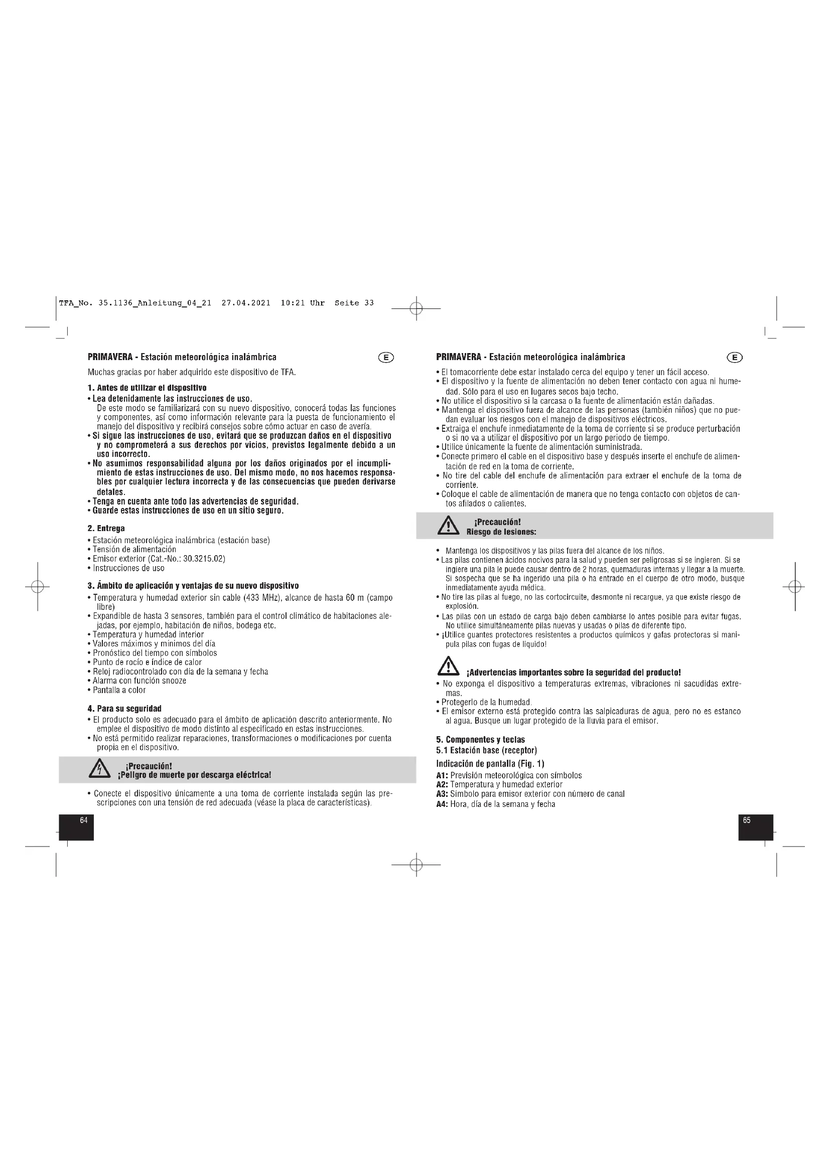 - Atención: Al cambiar las pilas, debe volver a establecerse el contacto entre el emisor exterior y el receptor; por esta razón, deben introducirse pilas nuevas en ambos dispositivos o ini- ciar la búsqueda manual del emisor exterior. TFA_No. 35.1136_Anleitung_04_21 27.04.2021 10:21 Uhr Seite 377574 PRIMAVERA - Estación meteorológica inalámbrica
