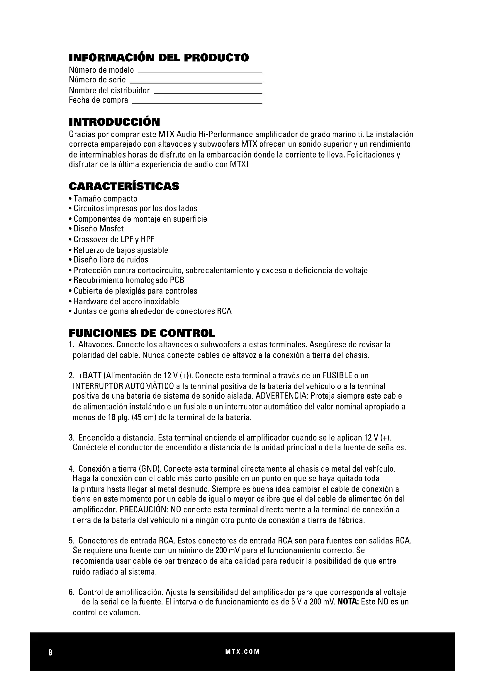 Número de modelo Número de serie Nombre del distribuidor Fecha de compra INTRODUCCIÓN Gracias por comprar este MTX Audio Hi-Performance amplificador de grado marino ti. La instalación correcta emparejado con altavoces y subwoofers MTX ofrecen un sonido superior y un rendimiento de interminables horas de disfrute en la embarcación donde la corriente te lleva. Felicitaciones y disfrutar de la última experiencia de audio con MTX! CARACTERÍSTICAS