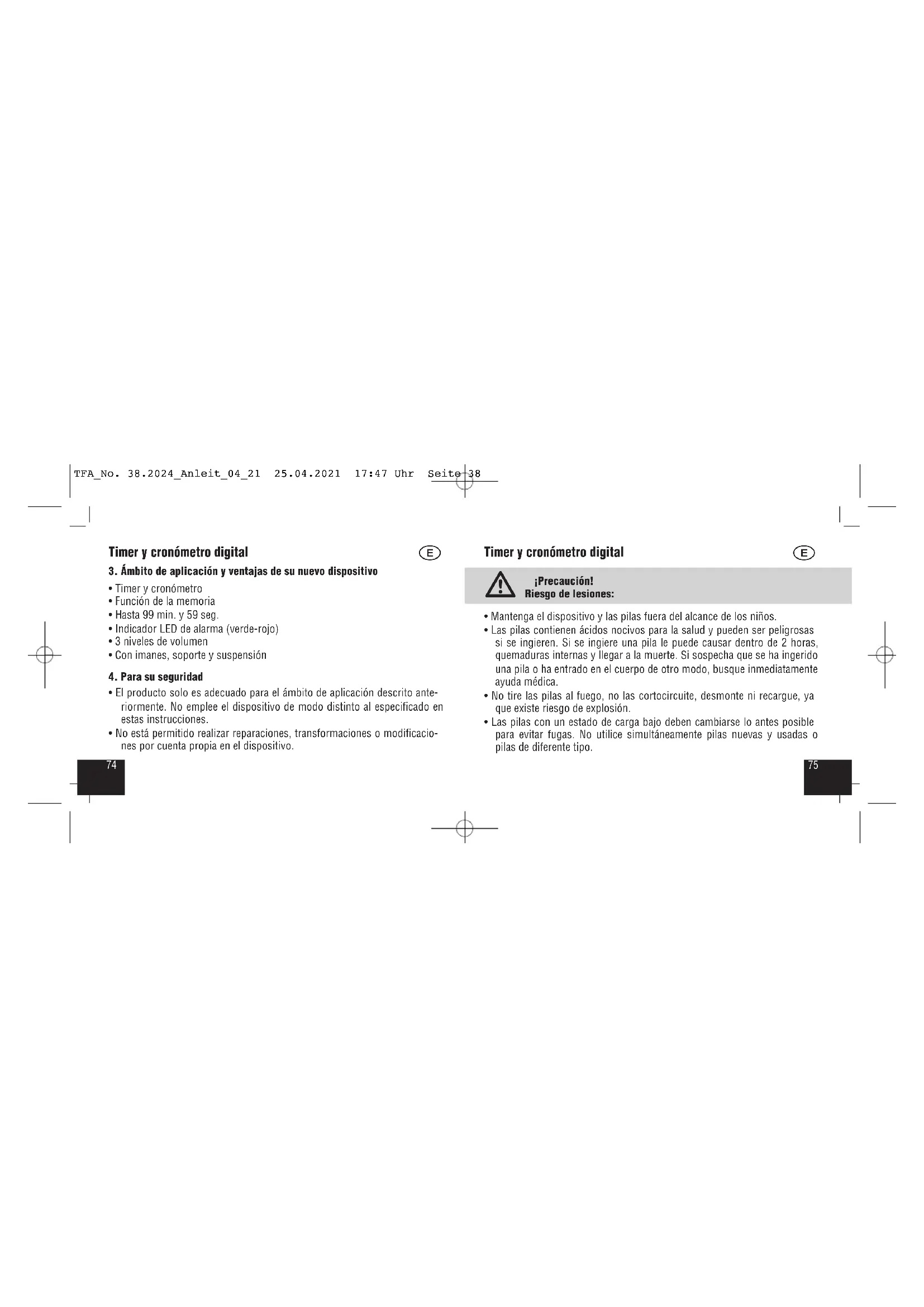 - Las pilas con un estado de carga bajo deben cambiarse lo antes posible para evitar fugas. No utilice simultáneamente pilas nuevas y usadas o pilas de diferente tipo. TFA_No. 38.2024_Anleit_04_21 25.04.2021 17:47 Uhr Seite 387776 Timer y cronómetro digital