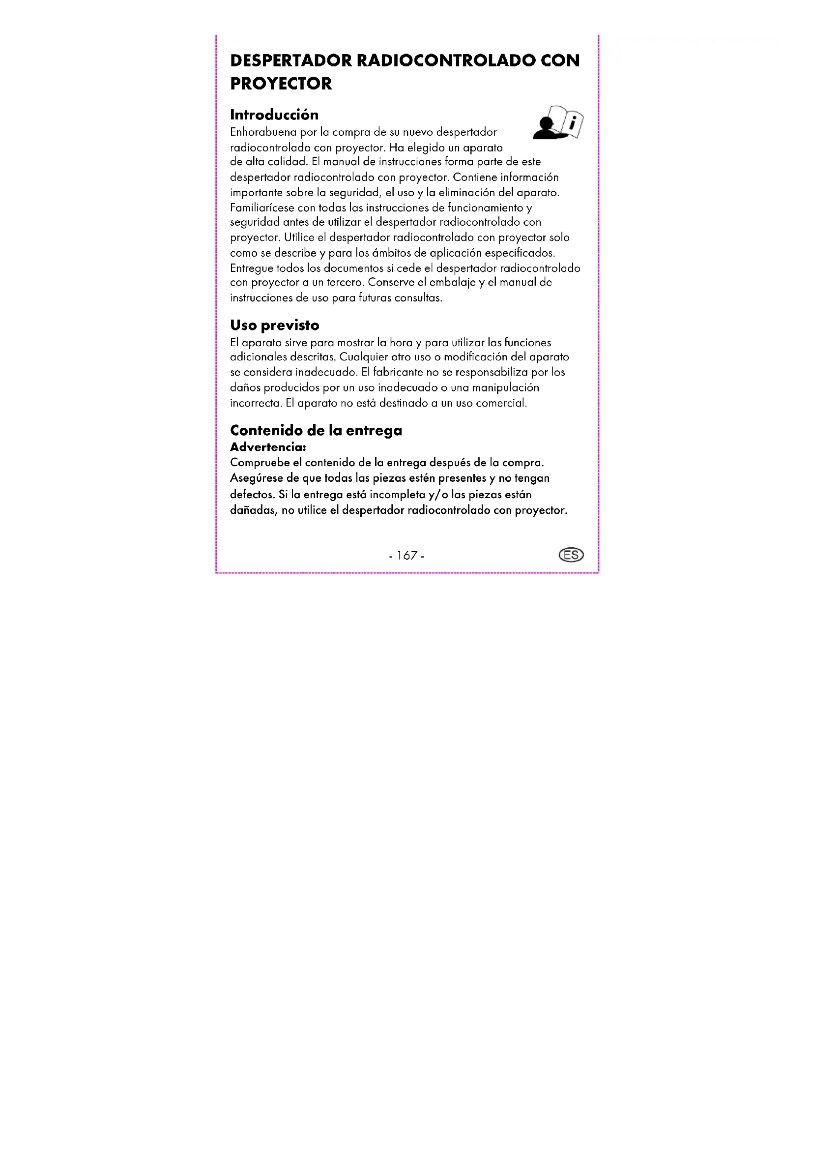 PROYECTOR Introducción Enhorabuena por la compra de su nuevo despertador radiocontrolado con proyector. Ha elegido un aparato de alta calidad. El manual de instrucciones forma parte de este despertador radiocontrolado con proyector. Contiene información importante sobre la seguridad, el uso y la eliminación del aparato. Familiarícese con todas las instrucciones de funcionamiento y seguridad antes de utilizar el despertador radiocontrolado con proyector. Utilice el despertador radiocontrolado con proyector solo como se describe y para los ámbitos de aplicación especificados. Entregue todos los documentos si cede el despertador radiocontrolado con proyector a un tercero. Conserve el embalaje y el manual de instrucciones de uso para futuras consultas. Uso previsto El aparato sirve para mostrar la hora y para utilizar las funciones adicionales descritas. Cualquier otro uso o modificación del aparato se considera inadecuado. El fabricante no se responsabiliza por los daños producidos por un uso inadecuado o una manipulación incorrecta. El aparato no está destinado a un uso comercial. Contenido de la entrega Advertencia: Compruebe el contenido de la entrega después de la compra. Asegúrese de que todas las piezas estén presentes y no tengan defectos. Si la entrega está incompleta y/o las piezas están dañadas, no utilice el despertador radiocontrolado con proyector.- 168 - Póngase en contacto con el servicio de asistencia técnica (véase «Gestión de una reclamación de garantía»). 1 x Despertador radiocontrolado con proyector 1 x Fuente de alimentación 2 x Pilas alcalinas 1,5 V AA LR6 1 x Manual de instrucciones Especificaciones técnicas Despertador radiocontrolado con proyector Hora de radio DCF77 Dimensiones: aprox. 130 x 98 x 45 mm