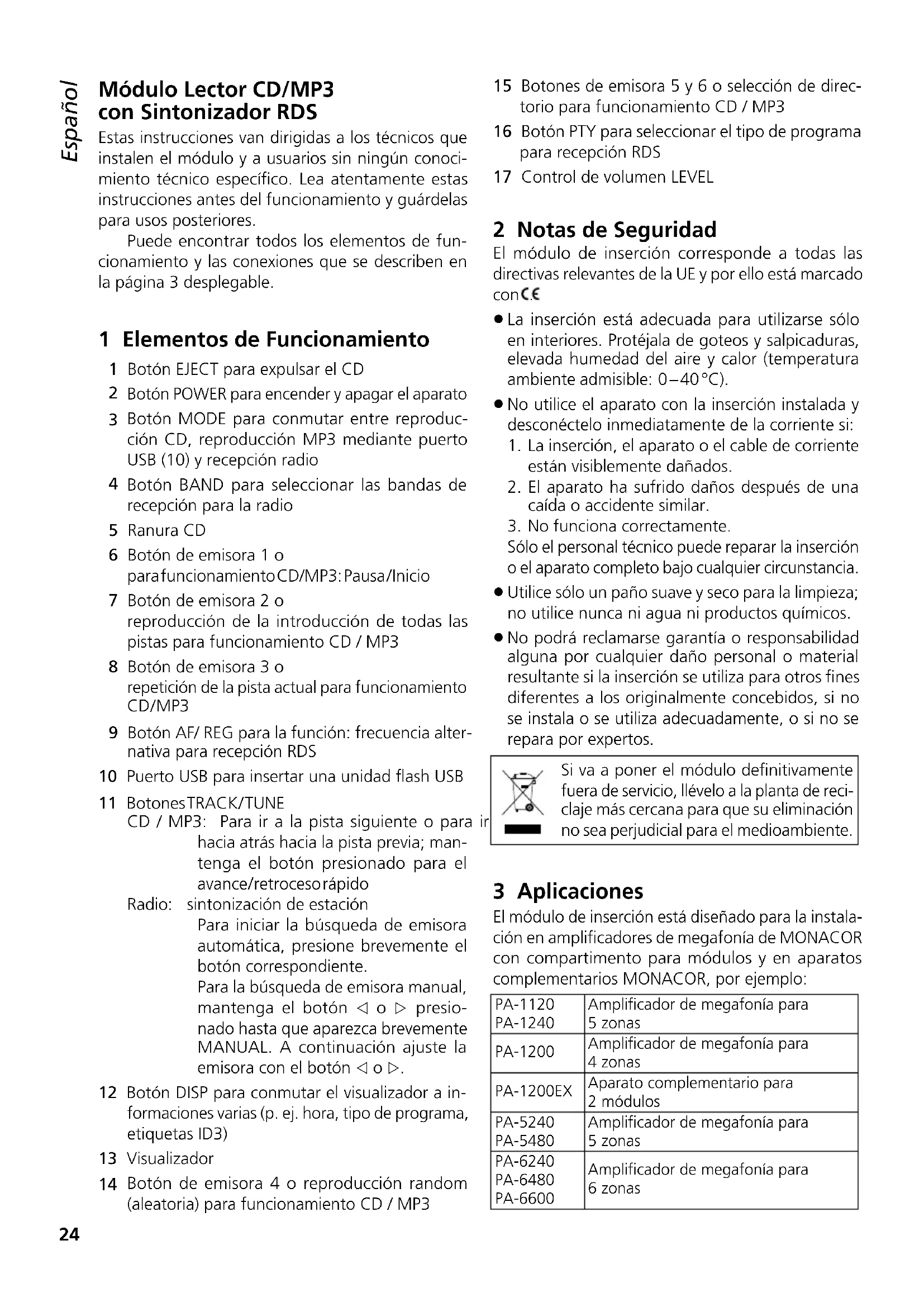 Botón de emisora 4 o reproducción random (aleatoria) para funcionamiento CD / MP3 15 Botones de emisora 5 y 6 o selección de direc- torio para funcionamiento CD / MP3 16 Botón PTY para seleccionar el tipo de programa para recepción RDS 17 Control de volumen LEVEL 2 Notas de Seguridad El módulo de inserción corresponde a todas las directivas relevantes de la UE y por ello está marcado con .
