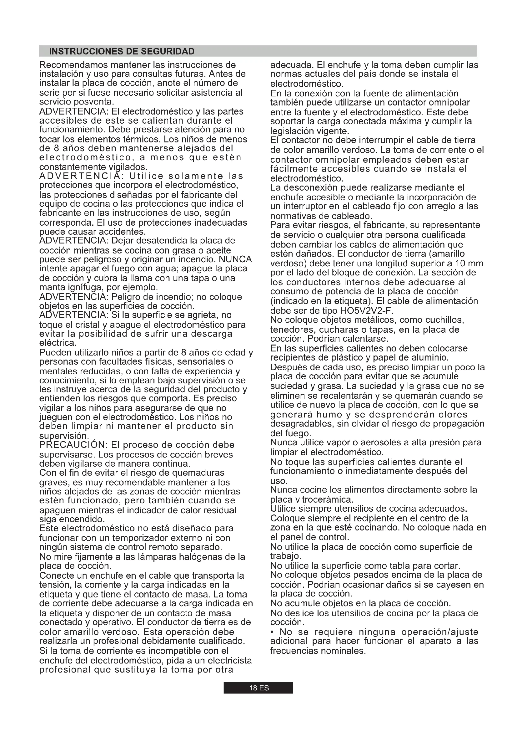 7,7 kW734 l/h560 g/h -18 ES ADVERTENCIA: El electrodoméstico y las partes accesibles de este se calientan durante el funcionamiento. Debe prestarse atención para no tocar los elementos térmicos. Los niños de menos de 8 años deben mantenerse alejados del electrodoméstico, a menos que estén constantemente vigilados. Recomendamos mantener las instrucciones de instalación y uso para consultas futuras. Antes de instalar la placa de cocción, anote el número de serie por si fuese necesario solicitar asistencia al servicio posventa. Pueden utilizarlo niños a partir de 8 años de edad y personas con facultades físicas, sensoriales o mentales reducidas, o con falta de experiencia y conocimiento, si lo emplean bajo supervisión o se les instruye acerca de la seguridad del producto y entienden los riesgos que comporta. Es preciso vigilar a los niños para asegurarse de que no jueguen con el electrodoméstico. Los niños no deben limpiar ni mantener el producto sin supervisión. ADVERTENCIA: Si la superficie se agrieta, no toque el cristal y apague el electrodoméstico para evitar la posibilidad de sufrir una descarga eléctrica. Con el fin de evitar el riesgo de quemaduras graves, es muy recomendable mantener a los niños alejados de las zonas de cocción mientras estén funcionado, pero también cuando se apaguen mientras el indicador de calor residual siga encendido. ADVERTENCIA: Peligro de incendio; no coloque objetos en las superficies de cocción. PRECAUCIÓN: El proceso de cocción debe supervisarse. Los procesos de cocción breves deben vigilarse de manera continua. Conecte un enchufe en el cable que transporta la tensión, la corriente y la carga indicadas en la etiqueta y que tiene el contacto de masa. La toma de corriente debe adecuarse a la carga indicada en la etiqueta y disponer de un contacto de masa conectado y operativo. El conductor de tierra es de color amarillo verdoso. Esta operación debe realizarla un profesional debidamente cualificado. Si la toma de corriente es incompatible con el enchufe del electrodoméstico, pida a un electricista profesional que sustituya la toma por otra ADVERTENCIA: Utilice solamente las protecciones que incorpora el electrodoméstico, las protecciones diseñadas por el fabricante del equipo de cocina o las protecciones que indica el fabricante en las instrucciones de uso, según corresponda. El uso de protecciones inadecuadas puede causar accidentes. Este electrodoméstico no está diseñado para funcionar con un temporizador externo ni con ningún sistema de control remoto separado. ADVERTENCIA: Dejar desatendida la placa de cocción mientras se cocina con grasa o aceite puede ser peligroso y originar un incendio. NUNCA intente apagar el fuego con agua; apague la placa de cocción y cubra la llama con una tapa o una manta ignífuga, por ejemplo. No mire fijamente a las lámparas halógenas de la placa de cocción.