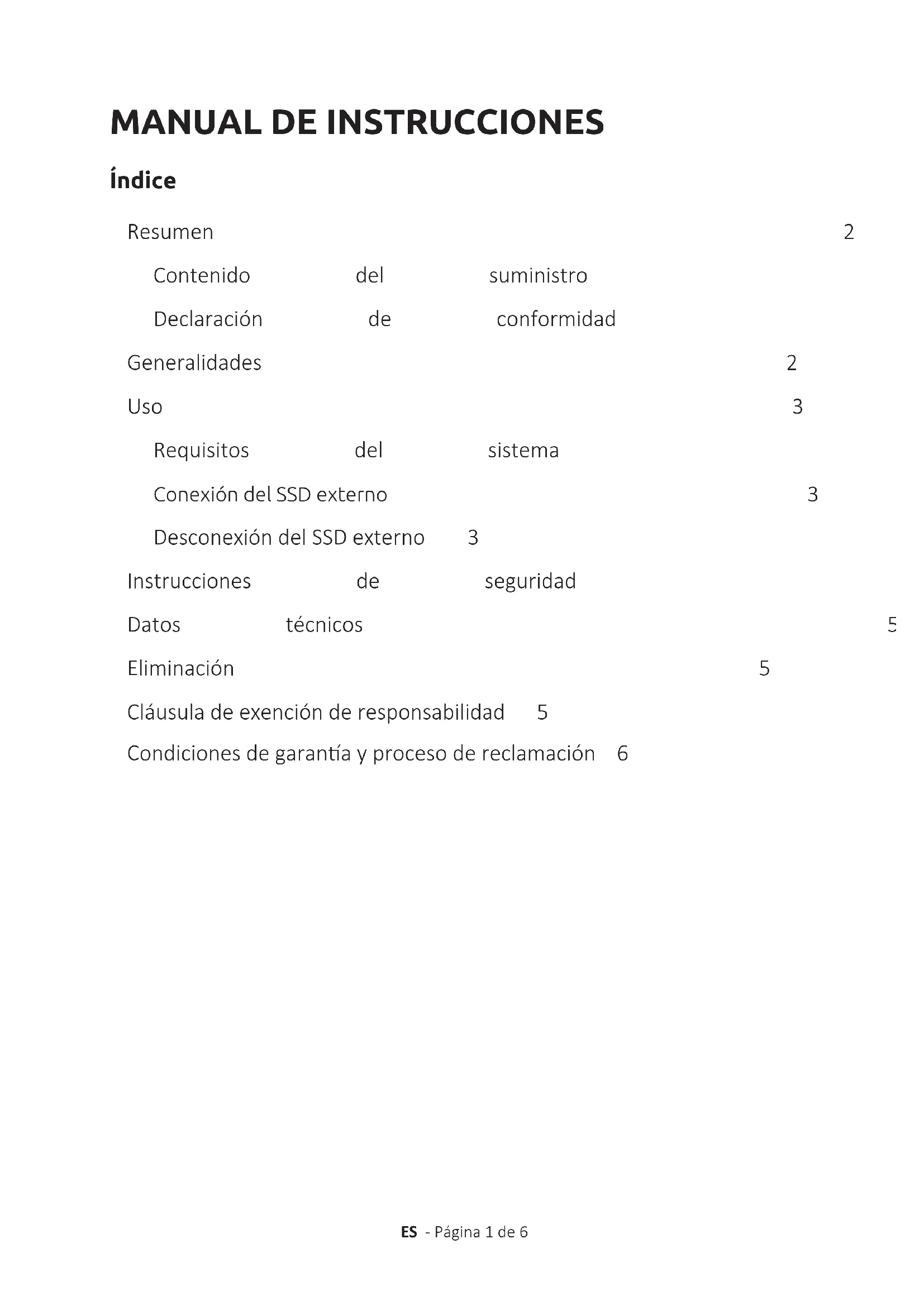 trasporto.Laconfezionedeveesserecorreamentearancata. Spedirelaconfezionealservizioassistenza,all‘indirizzochesegue: INTENSOINTERNATIONALGMBH ServiceCenter(n.RMA) Kopernikusstraße12-14 D-49377Vechta Contatto: Email(supportotecnico): support@intenso-internaonal.de Email(numeroRMA): rma@intenso-internaonal.de SitoWeb: www.intenso-internaonal.de Hotline: +49(0)900–1504030 (0,39€/min.suretessanazionale(Germania). Tariesuretecellularesoggeeavariazioni). Procedura di reclamoMANUAL DE INSTRUCCIONES ES - Página 1 de 6 Índice Resumen 2 Contenido del suministro 2 Declaración de conformidad 2 Generalidades 2 Uso 3 Requisitos del sistema 3 Conexión del SSD externo 3 Desconexión del SSD externo 3 Instrucciones de seguridad 4 Datos técnicos 5 Eliminación 5 Cláusula de exención de responsabilidad 5 Condiciones de garana y proceso de reclamación 6ES - Página 2 de 6 Lea atentamente estas instrucciones y observe y siga las indicaciones que guran en ellas a n de garanzar una larga vida úl y un uso able del aparato. Conserve esas instrucciones a mano y entrégueselas a otros usuarios del aparato. Acerca de estas instrucciones GENERALIDADES Declaración de conformidad El marcado CE indica que este producto cumple los requisitos de todas las Direcvas de la UE vigentes para este producto. Contenuto della confezione PANORAMICA La nalidad principal de este SSD externo consiste en el almacenamiento de datos de PC, portáles, ultrabooks u ordenadores MAC. Este producto no está desnado al uso comercial o para aplicaciones médicas y especiales, en las que un fallo del producto puede causar considerables daños materiales, lesiones o la muerte. En el caso de un uso que no se corresponde con el uso previsto, se exnguirá la responsabilidad. No está permido abrir el aparato, modicarlo ni usar con él disposivos auxiliares y accesorios que no hayan sido autorizados por nosotros.No use el SSD externo en condiciones ambientales extremas y observe las instrucciones de seguridad. La no observancia de las informaciones e instrucciones de seguridad contenidas en las presentes instrucciones se considerará un incumplimiento del uso previsto y acarreará la exnción de la responsabilidad y puede causar daños personales o materiales. Uso previsto