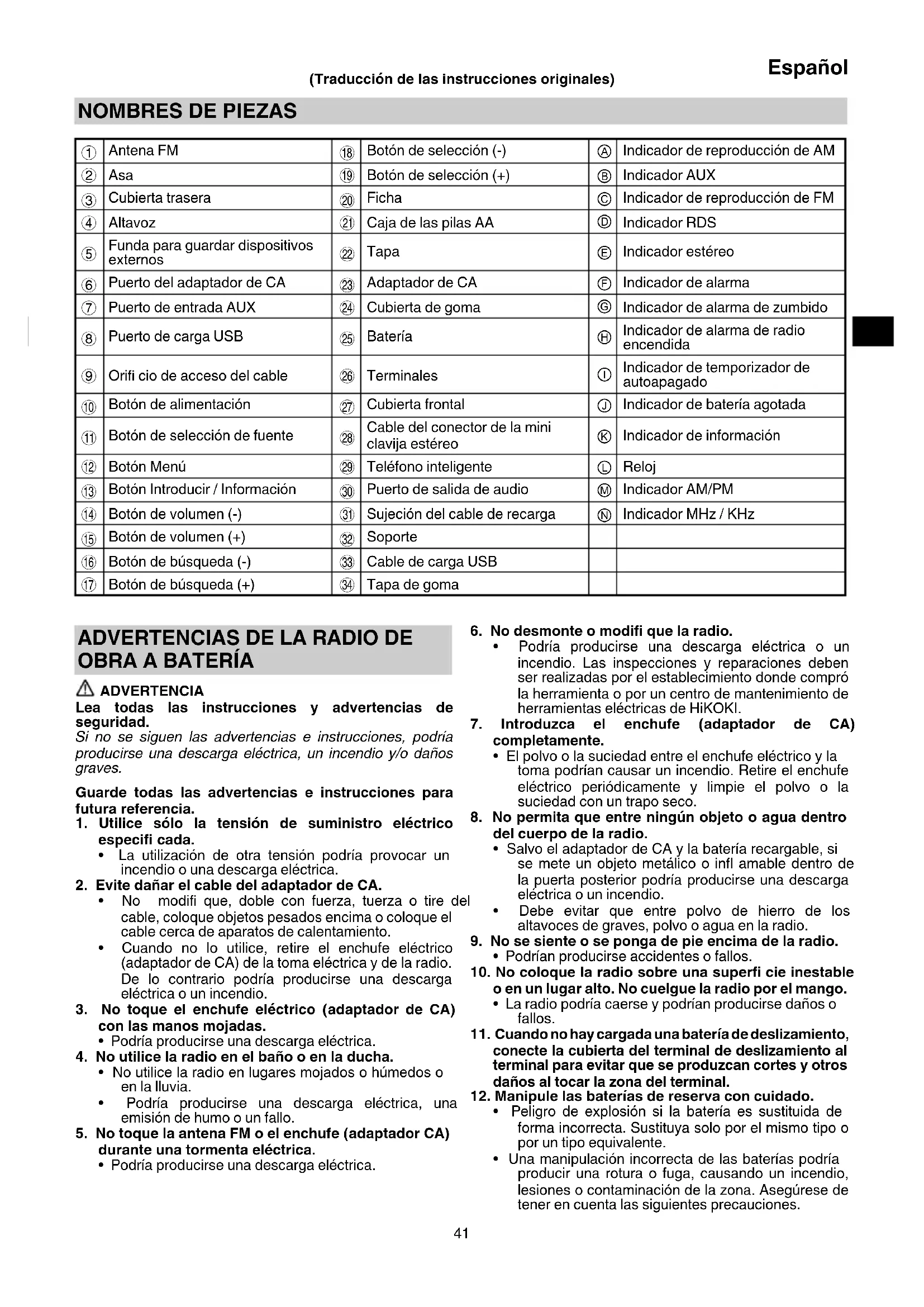 Los problemas inesperados podrían provocar la pérdida o corrupción de datos almacenados en smartphones y otros equipos periféricos conectados a la radio. Por tanto, siempre deberá realizarse antes una copia de seguridad de los datos. Observe que HiKOKI no se responsabilizará de la corrupción o pérdida de datos almacenados en smartphones y otro equipo periférico conectado a la radio, ni otros daños al equipo. FUNCIONES PRINCIPALES ○ Selección Manual/Automática ○ Guardar (Memoria) (emisoras 10 AM + 10 FM) ○ Radio On/Off /Alarma ○ Plataforma para reproducir audio de Smartphones y reproductores de audio portátiles ○ Altavoz estéreo de gran calidad ○ Carga de Smartphones y teléfonos móviles ○ Compatibilidad con la batería recargable y el adaptador de CA de la herramienta eléctrica HiKOKI SPECIFICATIONS Banda de frecuencia FM: 87,5 a 108 MHz AM: 522 a 1629 KHz Antena FM: Antena de goma AM: Antena de barra de ferrita (incorporado) Altavoz 90 mm (8 Ω) × 2 Salida de alimentación máx. Adaptador de CA: 5 W × 2 14,4 V: 6 W × 2 18 V: 7 W × 2 Suministro eléctrico Batería deslizante: DC 14,4 V, 18 V Suministro eléctrico de hogar (utilizando el adaptador de CA proporcionado) Pilas de reserva: DC 3 V, dos pilas AA Dimensiones exteriores L 366 mm x An. 303 mm x Al. 261 mm (con antena refractada) Peso 3,4 kg ○ Para obtener información acerca de las fuentes de alimentación aplicables, consulte las instrucciones de uso: Fuentes de alimentación aplicables: Dong Guan Sun Hung Kin Electrical Co., Ltd. (Manufactura) HKP12-1201200dV, HKP12-1201200dB (Modelo) ○ Sólo puede usarse la batería deslizante inferior (Modelo) BSL1430: 14,4 V 3000 mAh Batería de litio (Modelo) BSL1830: 18 V 3000 mAh Batería de litio (Manufactura) Koki Holdings Co., Ltd. 0000BookUR18DSAL.indb420000BookUR18DSAL.indb42 2019/07/0313:51:312019/07/0313:51:3143 Español SÍMBOLOS ADVERTENCIA A continuación se muestran los símbolos usados para la máquina. Asegúrese de comprender su signifi cado antes del uso. UR18DSAL : Radio de obra a batería Para obtener información acerca de las fuentes de alimentación aplicables, consulte las instrucciones de uso. Solo para países de la Unión Europea No deseche los aparatos eléctricos junto con los residuos domésticos. De conformidad con la Directiva Europea 2012/19/UE sobre residuos de aparatos eléctricos y electrónicos y su aplicación de acuerdo con la legislación nacional, las herramientas eléctricas cuya vida útil haya llegado a su fi n se deberán recoger por separado y trasladar a una planta de reciclaje que cumpla con las exigencias ecológicas. Botón de alimentación Botón de selección de fuente Botón Menú Botón Introducir / Información Botón de volumen Botón de búsqueda Botón de selección Indicador de alarma de zumbido Indicador de alarma de radio encendida Indicador de batería agotada