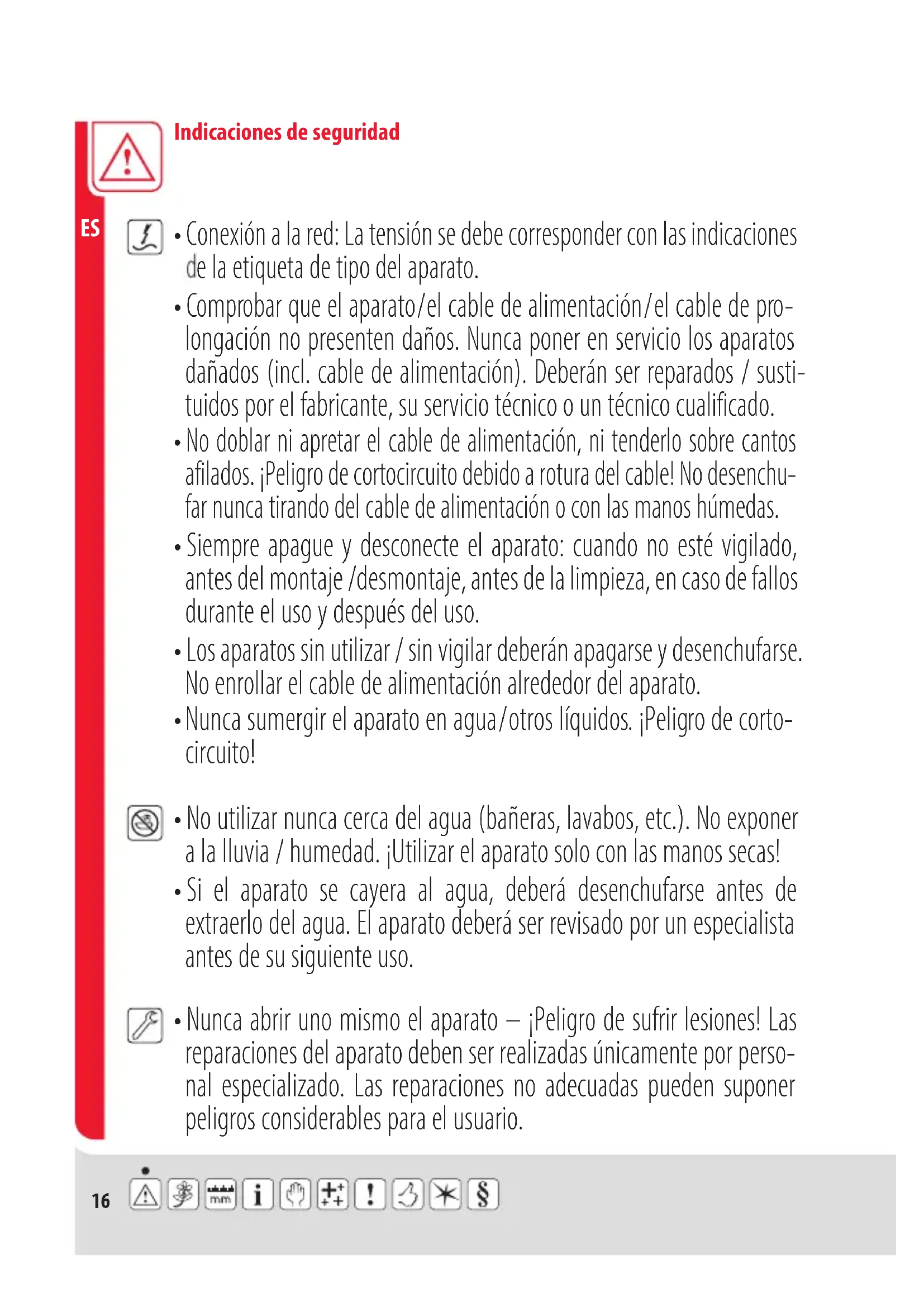 - Si el aparato se cayera al agua, deberá desenchufarse antes de extraerlo del agua. El aparato deberá ser revisado por un especialista antes de su siguiente uso.