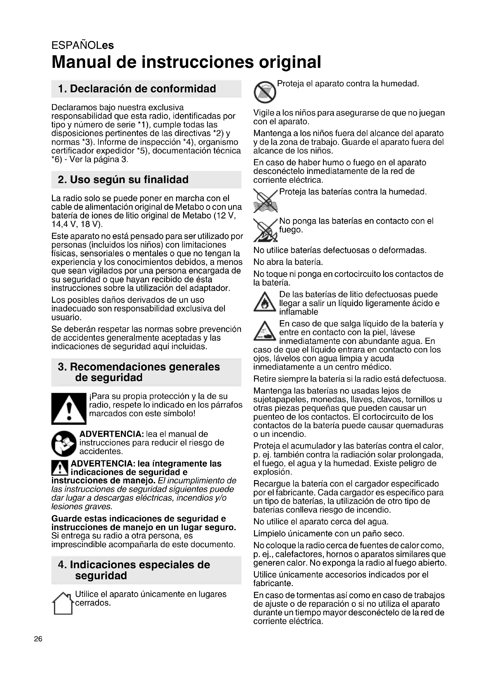 Manual de instrucciones original Declaramos bajo nuestra exclusiva responsabilidad que esta radio, identificadas por tipo y número de serie *1), cumple todas las disposiciones pertinentes de las directivas *2) y normas *3). Informe de inspección *4), organismo certificador expedidor *5), documentación técnica *6) - Ver la página 3. La radio solo se puede poner en marcha con el cable de alimentación original de Metabo o con una batería de iones de litio original de Metabo (12 V, 14,4 V, 18 V). Este aparato no está pensado para ser utilizado por personas (incluidos los niños) con limitaciones físicas, sensoriales o mentales o que no tengan la experiencia y los conocimientos debidos, a menos que sean vigilados por una persona encargada de su seguridad o que hayan recibido de ésta instrucciones sobre la utilización del adaptador. Los posibles daños derivados de un uso inadecuado son responsabilidad exclusiva del usuario. Se deberán respetar las normas sobre prevención de accidentes generalmente aceptadas y las indicaciones de seguridad aquí incluidas. ¡Para su propia protección y la de su radio, respete lo indicado en los párrafos marcados con este símbolo! ADVERTENCIA: lea el manual de instrucciones para reducir el riesgo de accidentes. ADVERTENCIA: lea íntegramente las indicaciones de seguridad e instrucciones de manejo. El incumplimiento de las instrucciones de seguridad siguientes puede dar lugar a descargas eléctricas, incendios y/o lesiones graves. Guarde estas indicaciones de seguridad e instrucciones de manejo en un lugar seguro. Si entrega su radio a otra persona, es imprescindible acompañarla de este documento. Utilice el aparato únicamente en lugares cerrados. Proteja el aparato contra la humedad. Vigile a los niños para asegurarse de que no juegan con el aparato. Mantenga a los niños fuera del alcance del aparato y de la zona de trabajo. Guarde el aparato fuera del alcance de los niños. En caso de haber humo o fuego en el aparato desconéctelo inmediatamente de la red de corriente eléctrica. Proteja las baterías contra la humedad. No ponga las baterías en contacto con el fuego. No utilice baterías defectuosas o deformadas. No abra la batería. No toque ni ponga en cortocircuito los contactos de la batería. De las baterías de litio defectuosas puede llegar a salir un líquido ligeramente ácido e inflamable En caso de que salga líquido de la batería y entre en contacto con la piel, lávese inmediatamente con abundante agua. En caso de que el líquido entrara en contacto con los ojos, lávelos con agua limpia y acuda inmediatamente a un centro médico. Retire siempre la batería si la radio está defectuosa. Mantenga las baterías no usadas lejos de sujetapapeles, monedas, llaves, clavos, tornillos u otras piezas pequeñas que pueden causar un puenteo de los contactos. El cortocircuito de los contactos de la batería puede causar quemaduras o un incendio. Proteja el acumulador y las baterías contra el calor, p. ej. también contra la radiación solar prolongada, el fuego, el agua y la humedad. Existe peligro de explosión. Recargue la batería con el cargador especificado por el fabricante. Cada cargador es específico para un tipo de baterías, la utilización de otro tipo de baterías conlleva riesgo de incendio. No utilice el aparato cerca del agua. Límpielo únicamente con un paño seco. No coloque la radio cerca de fuentes de calor como, p. ej., calefactores, hornos o aparatos similares que generen calor. No exponga la radio al fuego abierto. Utilice únicamente accesorios indicados por el fabricante. En caso de tormentas así como en caso de trabajos de ajuste o de reparación o si no utiliza el aparato durante un tiempo mayor desconéctelo de la red de corriente eléctrica.