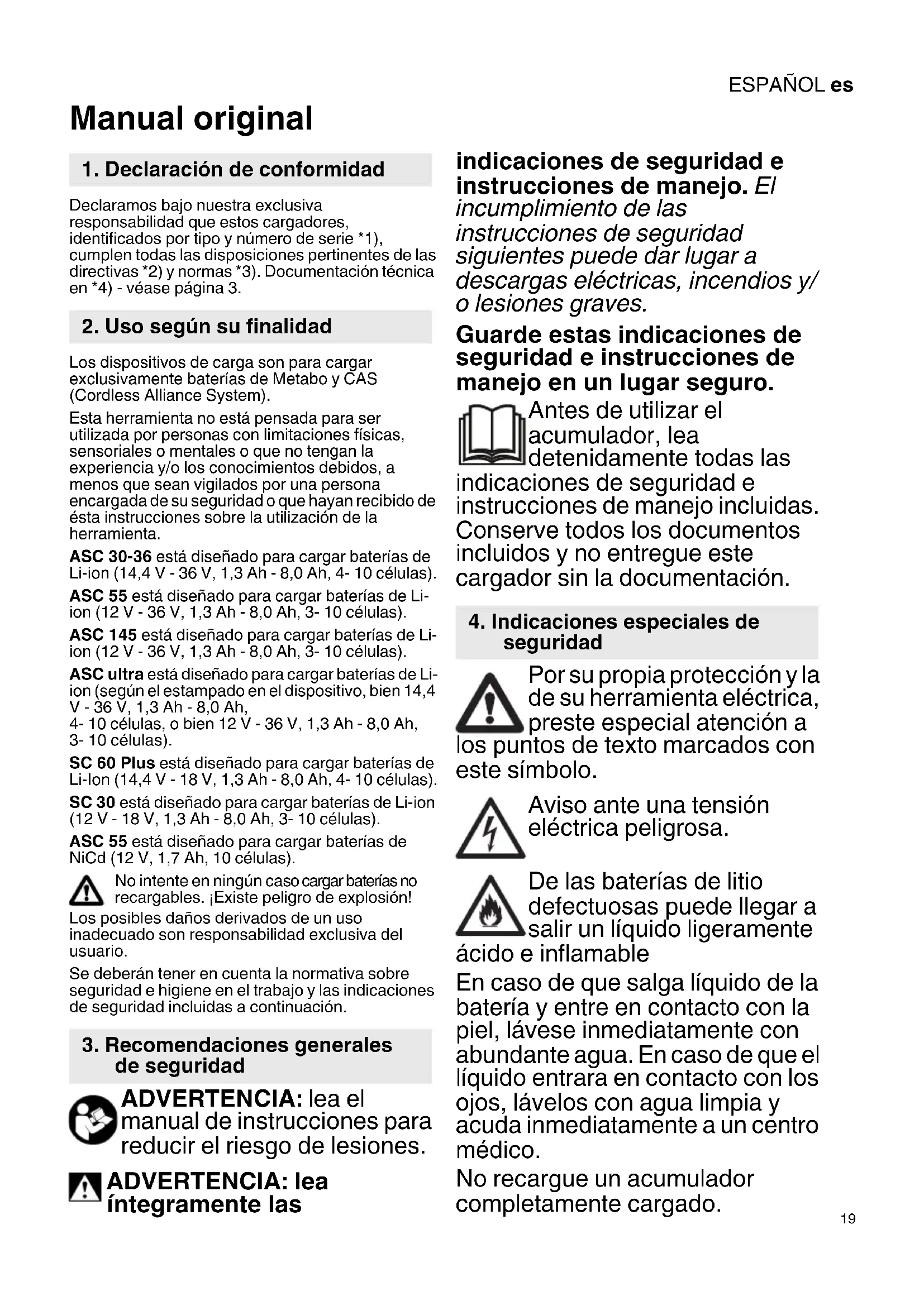 Manual original Declaramos bajo nuestra exclusiva responsabilidad que estos cargadores, identificados por tipo y número de serie *1), cumplen todas las disposiciones pertinentes de las directivas *2) y normas *3). Documentación técnica en *4) - véase página 3. Los dispositivos de carga son para cargar exclusivamente baterías de Metabo y CAS (Cordless Alliance System). Esta herramienta no está pensada para ser utilizada por personas con limitaciones físicas, sensoriales o mentales o que no tengan la experiencia y/o los conocimientos debidos, a menos que sean vigilados por una persona encargada de su seguridad o que hayan recibido de ésta instrucciones sobre la utilización de la herramienta. ASC 30-36 está diseñado para cargar baterías de Li-ion (14,4 V - 36 V, 1,3 Ah - 8,0 Ah, 4- 10 células). ASC 55 está diseñado para cargar baterías de Li- ion (12 V - 36 V, 1,3 Ah - 8,0 Ah, 3- 10 células). ASC 145 está diseñado para cargar baterías de Li- ion (12 V - 36 V, 1,3 Ah - 8,0 Ah, 3- 10 células). ASC ultra está diseñado para cargar baterías de Li- ion (según el estampado en el dispositivo, bien 14,4 V - 36 V, 1,3 Ah - 8,0 Ah,